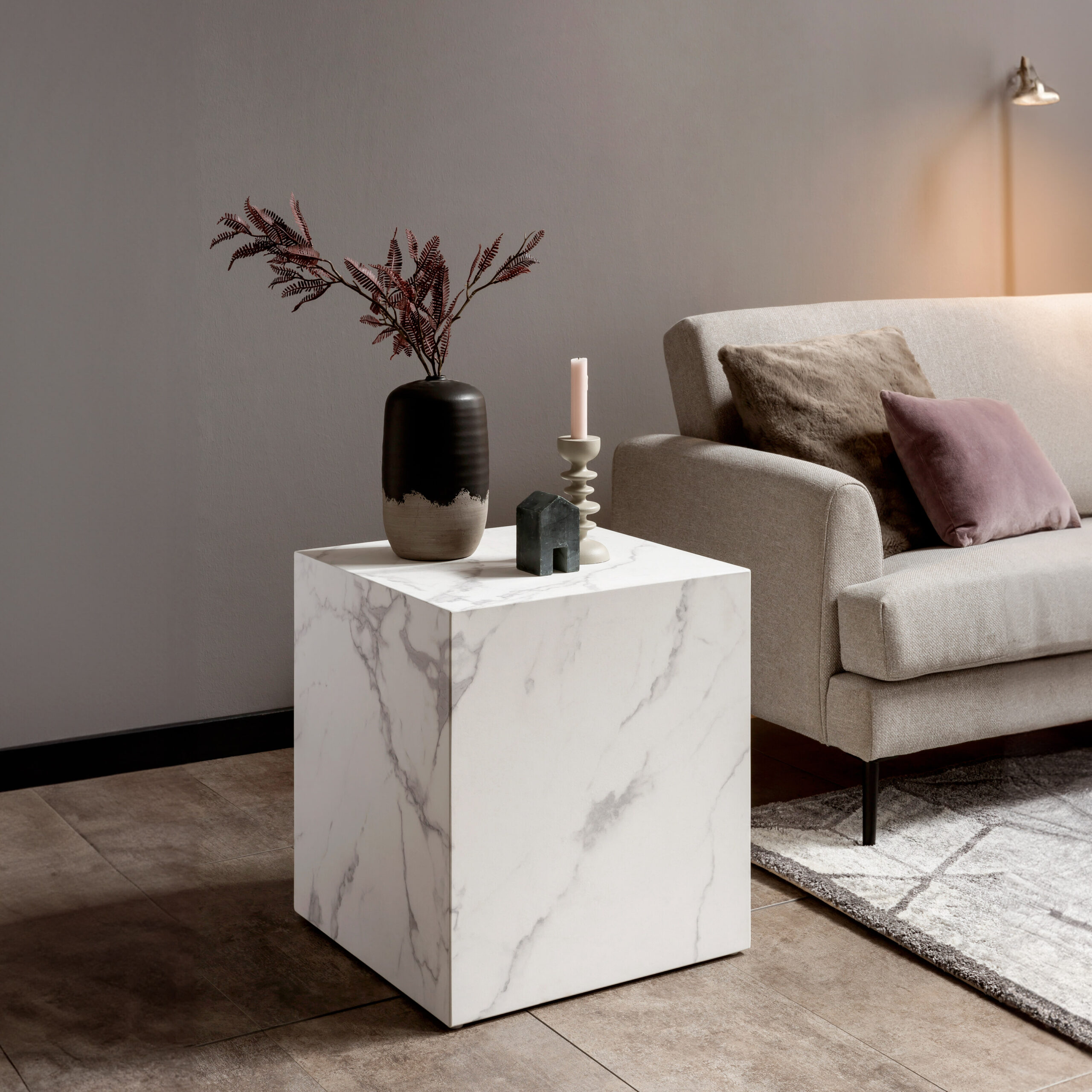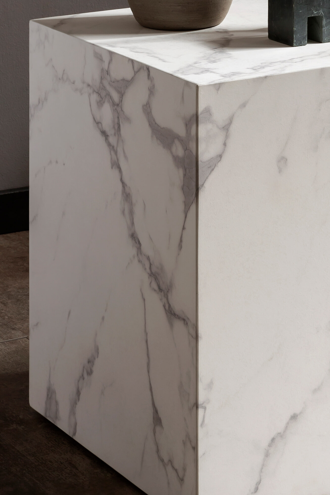 Deze chique bijzettafel laat je woonkamer er veel eleganter uitzien. De eenvoudige kubusvorm met veel oppervlak laat de geweldige witte marmerlook goed tot zijn recht komen. De bijzettafel is veelzijdig, niet alleen naast de salontafel, maar ook als nachtkastje of als vrijstaande blikvanger.