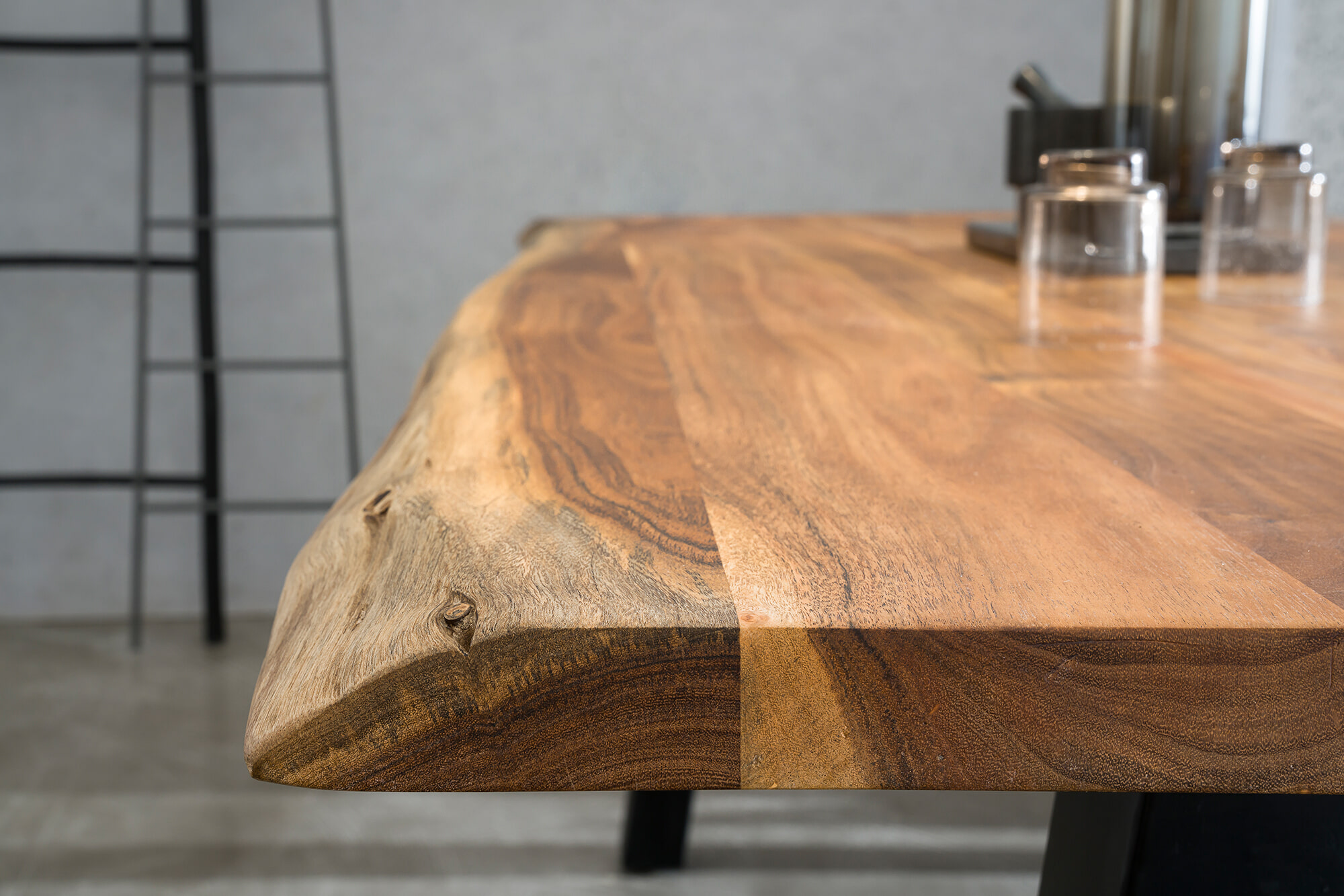 Massief hout geolied en dubbel in de was gezet, oppervlak ongevoelig en vochtwerend, randen met natuurlijke vorm, plaatdikte 35 mm, buisdikte 80×40 mm - Lengte: 140 cm