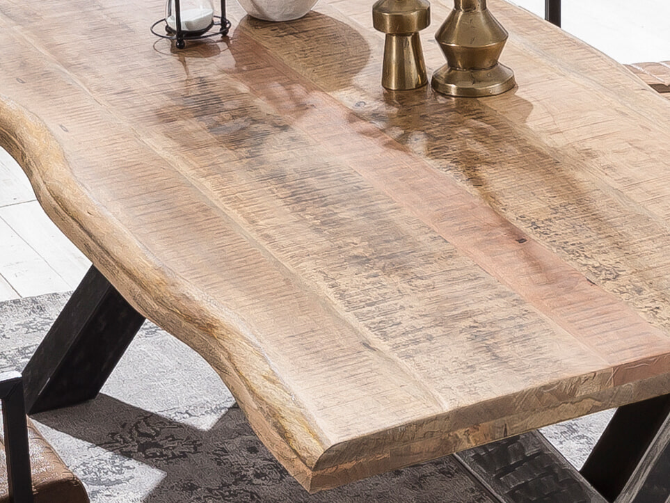 Je bent hier aan het juiste adres als je een tafel met karakter en uniciteit wilt. Deze eettafel zul je niet snel meer vinden. Het tafelblad is gemaakt van mangohout en is net zo uniek als de natuur. Daarnaast maakt het blad indruk met zijn totale dikte van 56 mm. Het originele X-frame van metaal in de used look biedt een mooi contrast met het tafelblad, zorgt voor de aangename industriële stijl en combineert comfort met stoerheid. Je eethoek wordt een blikvanger en ontmoetingspunt om gezellige uurtjes door te brengen met familie en vrienden. Hier vindt veel meer plaats dan alleen de dagelijkse maaltijden. Opmerking: Het tafelblad is een natuurproduct. Er kunnen knoesten, groeischeuren en afwijkende kleurdecoraties zijn, die geen reden tot klagen zijn, maar de authenticiteit van het hout onderstrepen.