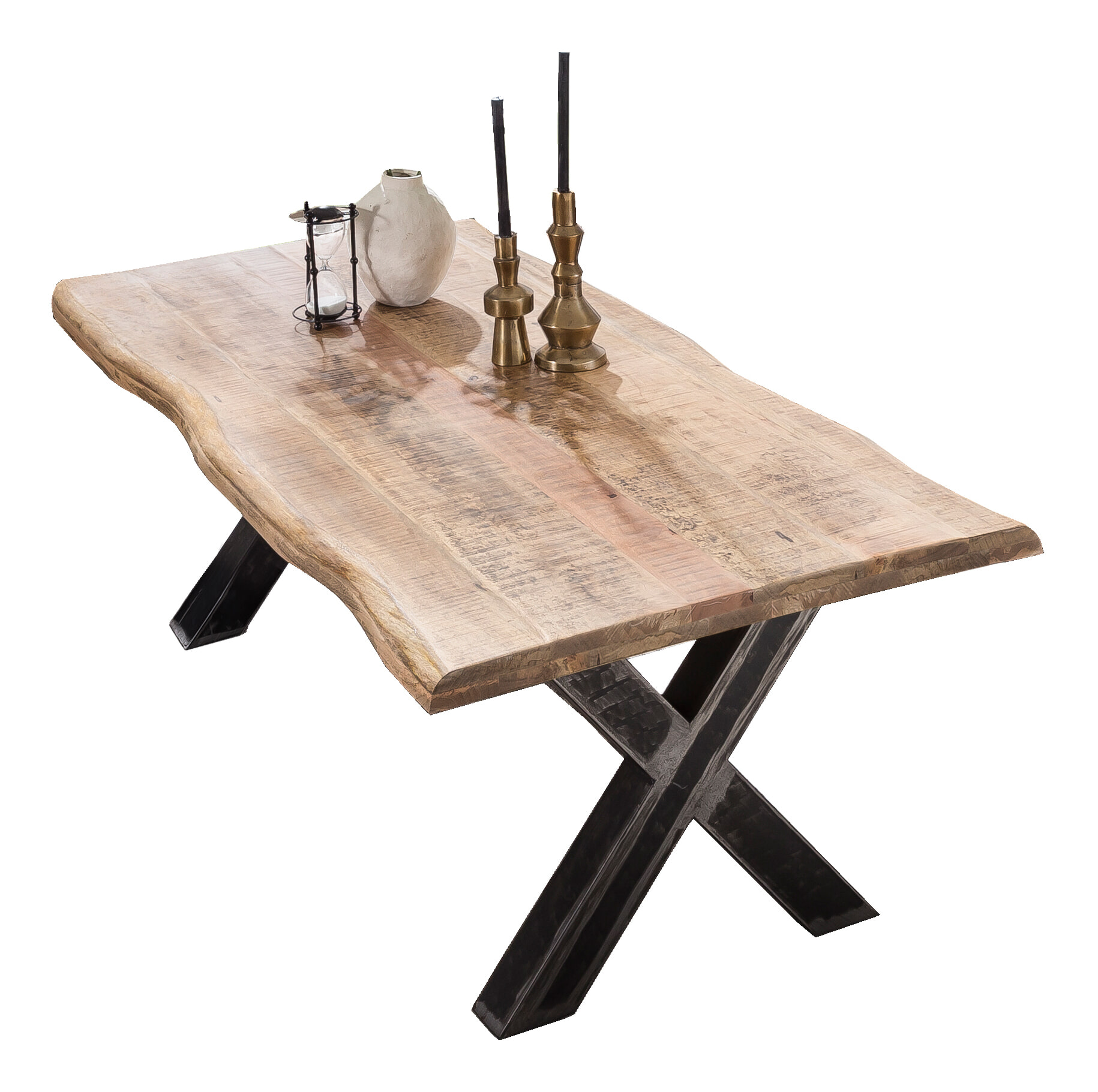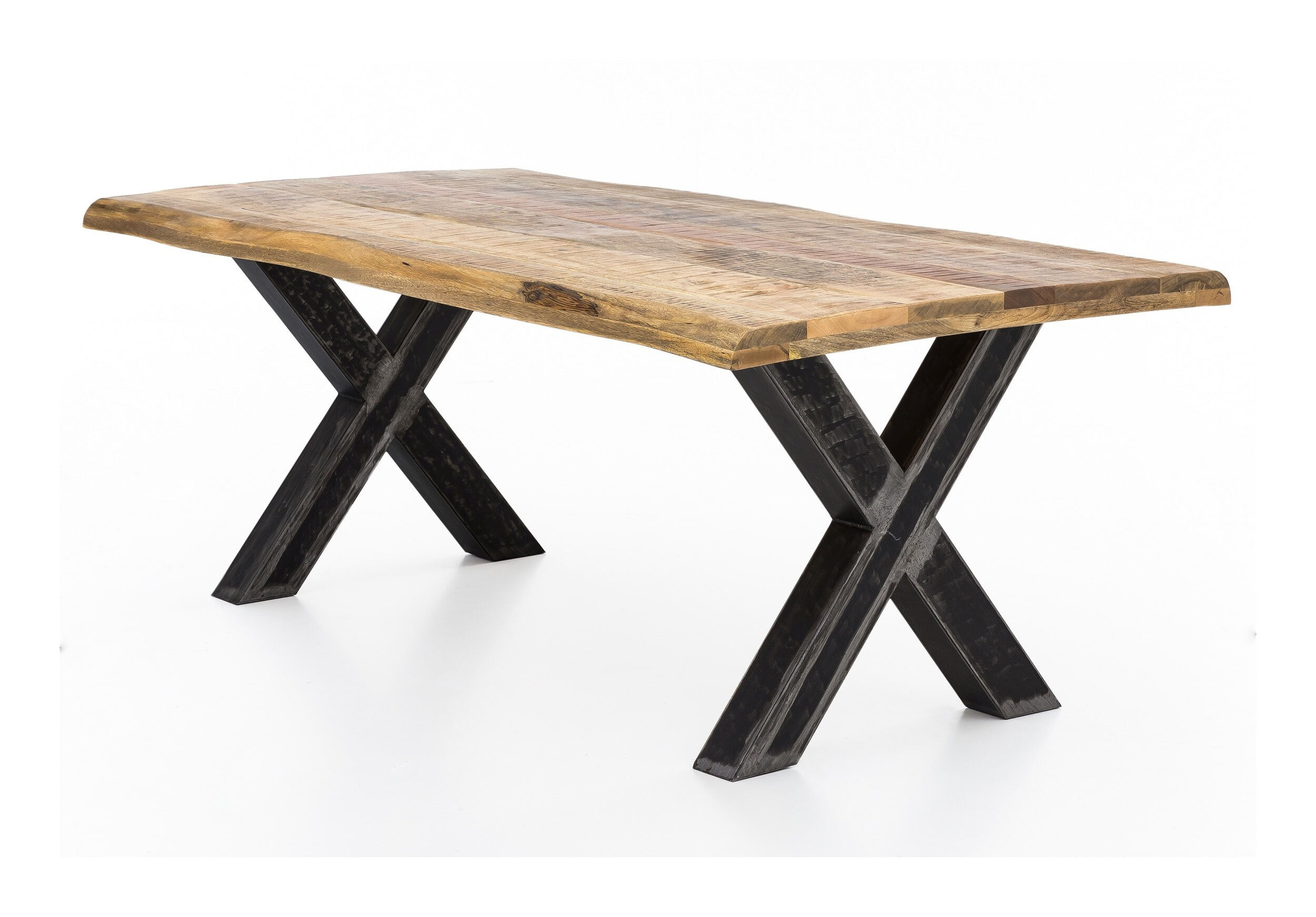 Je bent hier aan het juiste adres als je een tafel met karakter en uniciteit wilt. Deze eettafel zul je niet snel meer vinden. Het tafelblad is gemaakt van mangohout en is net zo uniek als de natuur. Daarnaast maakt het blad indruk met zijn totale dikte van 56 mm. Het originele X-frame van metaal in de used look biedt een mooi contrast met het tafelblad, zorgt voor de aangename industriële stijl en combineert comfort met stoerheid. Je eethoek wordt een blikvanger en ontmoetingspunt om gezellige uurtjes door te brengen met familie en vrienden. Hier vindt veel meer plaats dan alleen de dagelijkse maaltijden. Opmerking: Het tafelblad is een natuurproduct. Er kunnen knoesten, groeischeuren en afwijkende kleurdecoraties zijn, die geen reden tot klagen zijn, maar de authenticiteit van het hout onderstrepen.