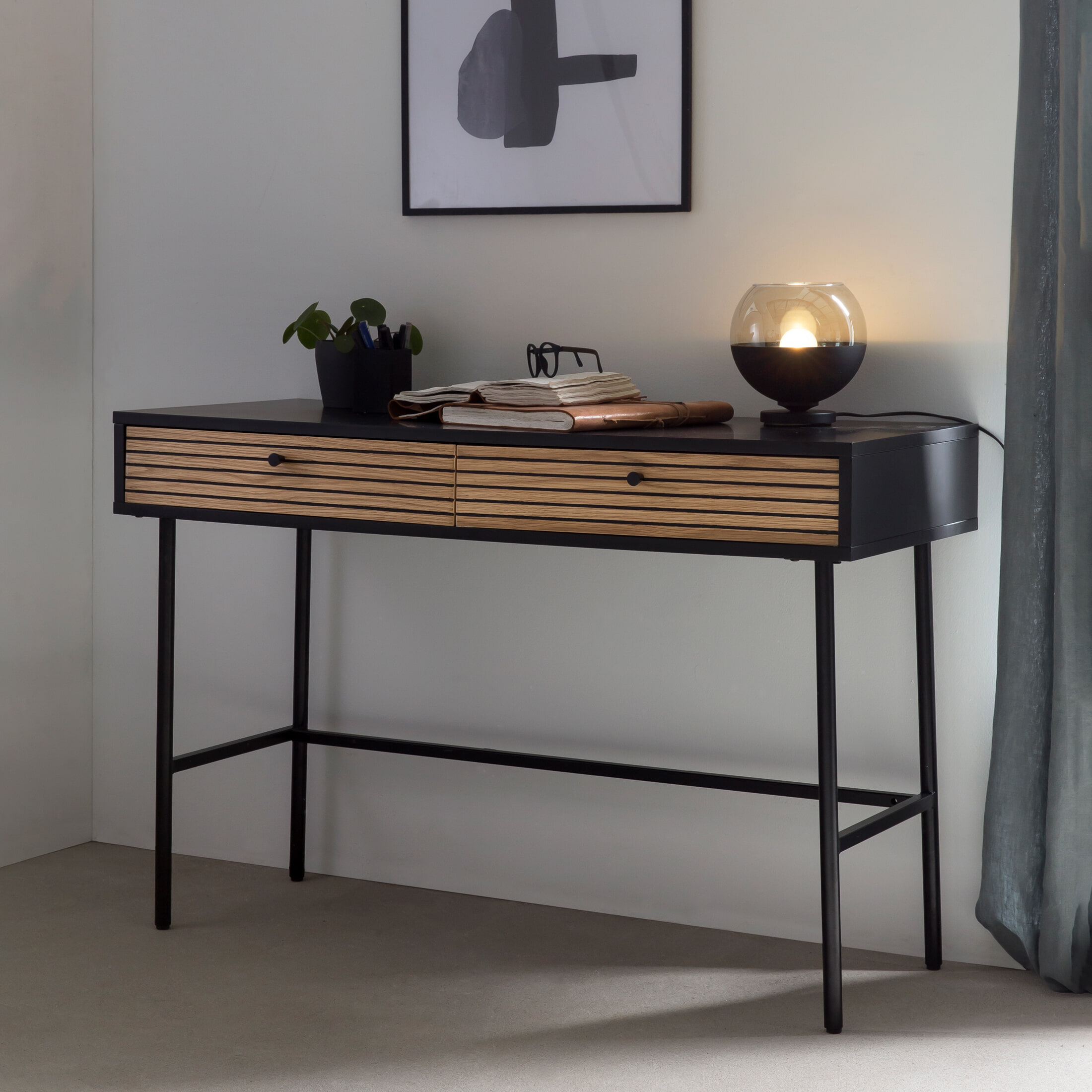 Scandinavische stijl geïnterpreteerd op een moderne manier! Het bureau biedt je eenvoudige Scandinavische elegantie. De combinatie tussen de zwarte romp van MDF-hout met melamine coating en het eiken echt houtfineer zorgt voor een groot contrast. Het MDF-houten front heeft een eiken echt houtfineer en is daardoor een echte blikvanger. Het bureau heeft twee laden en biedt dus voldoende opbergruimte voor je schrijfgerei. Het zwarte frame is mat gepoedercoat en zorgt voor een stevige stand. Het bureau is de ideale metgezel in je thuiskantoor.