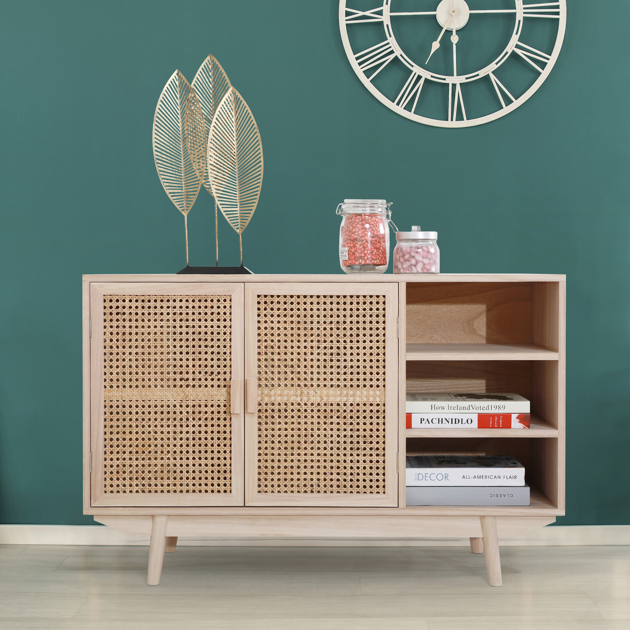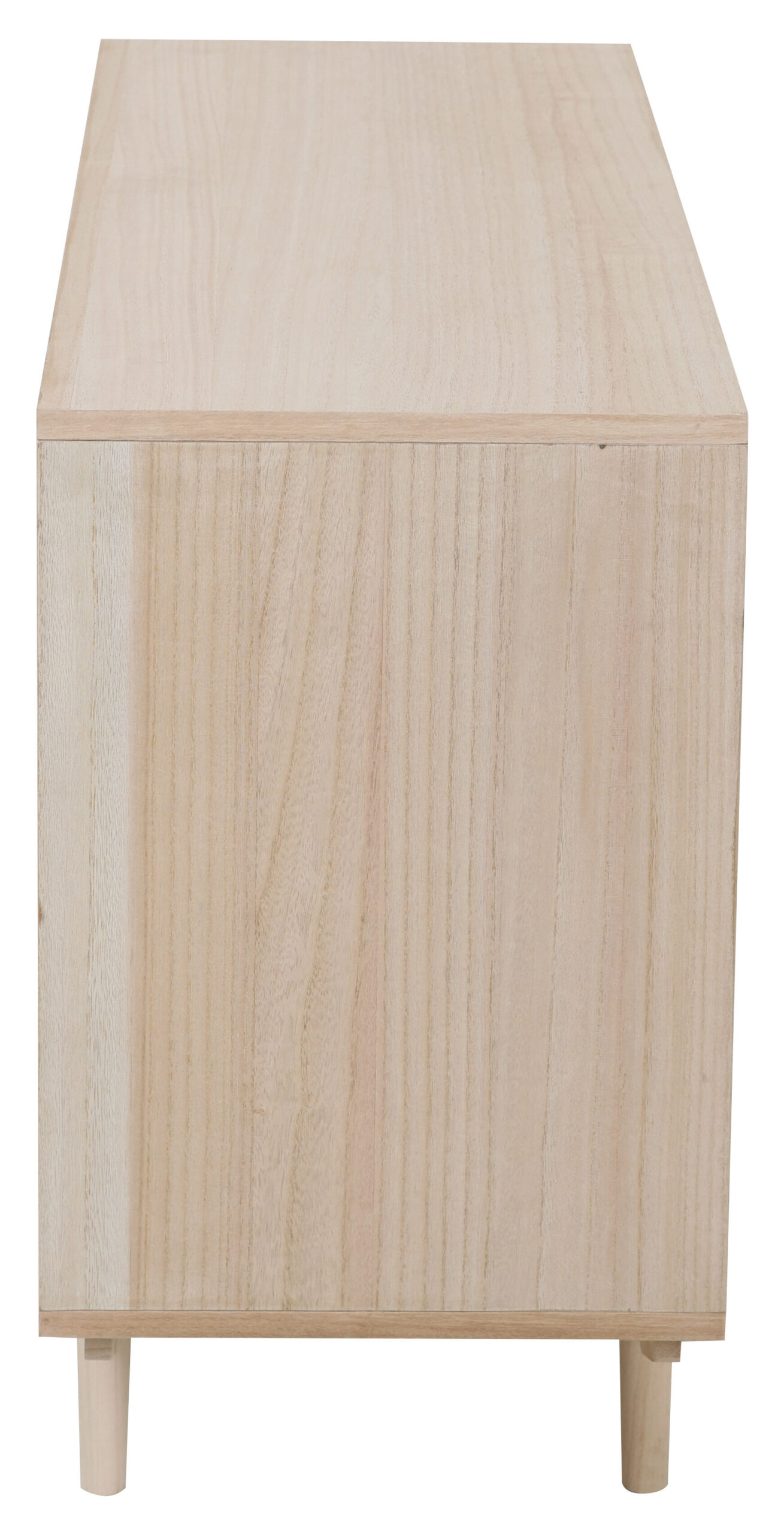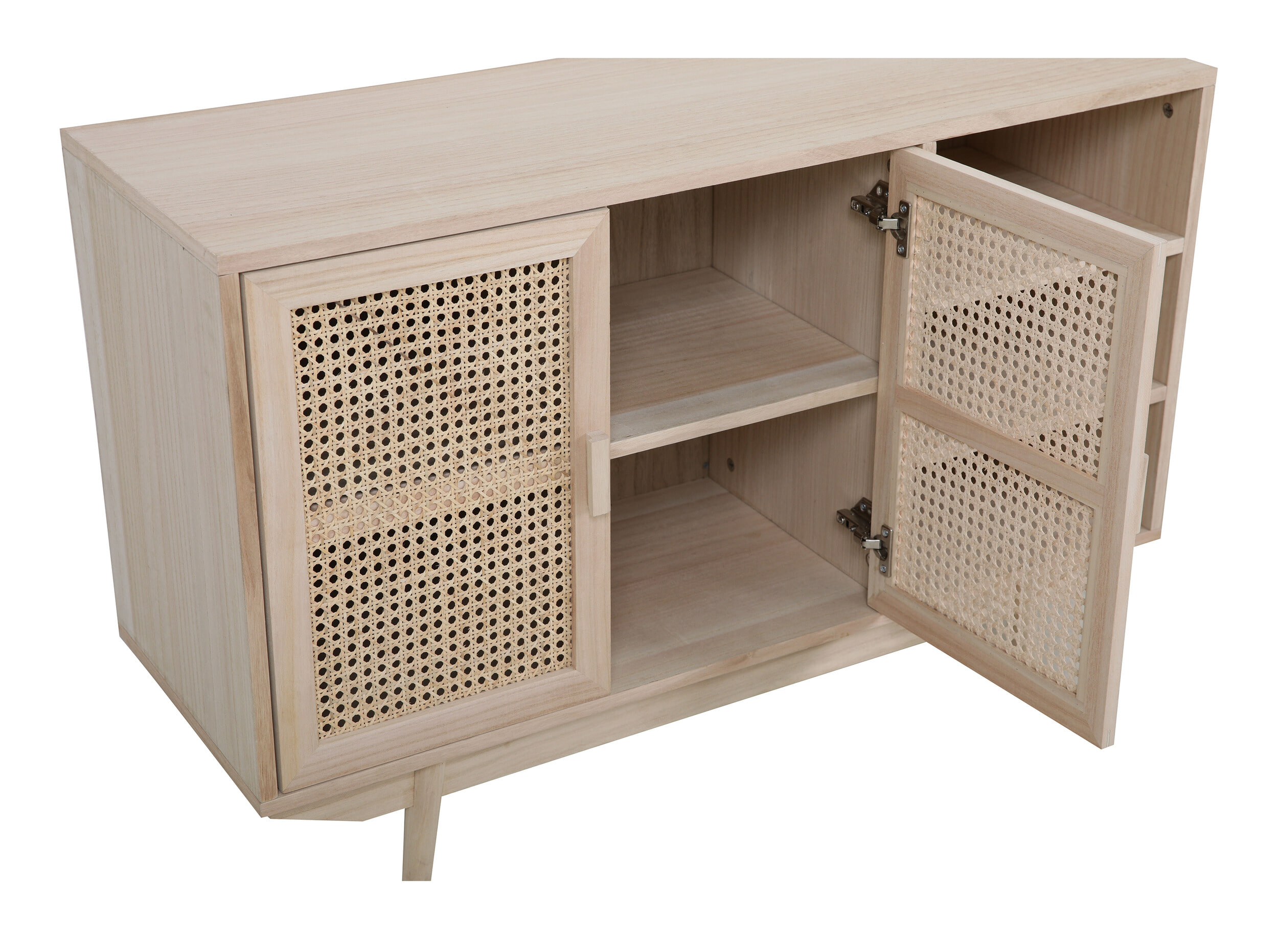 Deze buffetkast in natuurlijk design is een echte blikvanger. De natuurlijke kleur maakt deze ladekast tot iets heel bijzonders. Achter twee deuren met rotan vlechtwerk aan de voorkant krijg je veel gesloten opbergruimte voor diverse alledaagse dingen. Drie open vakken bieden extra ruimte. De romp van MDF werd bekleed met Paulownie houtfineer. De 4 poten zijn ook van Paulownie hout. Op de plank is voldoende ruimte voor decoratieve voorwerpen of bloemen. Meubels van natuurlijke materialen passen helemaal in de trend van die tijd. Het dressoir is ook morgen nog eigentijds en kan prachtig gecombineerd worden met bestaande interieurs.