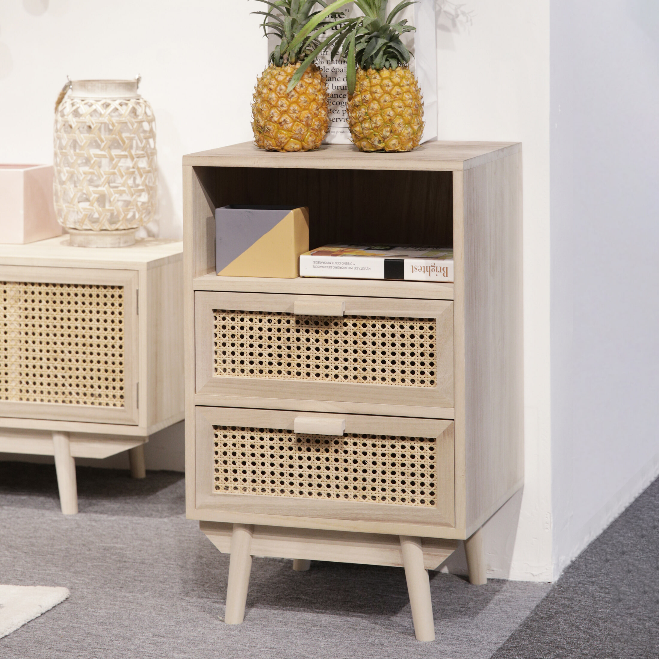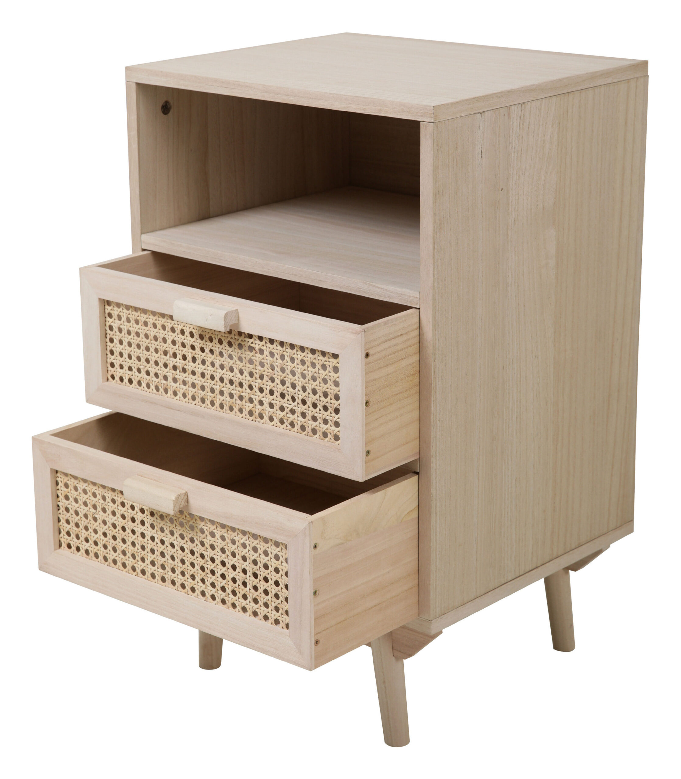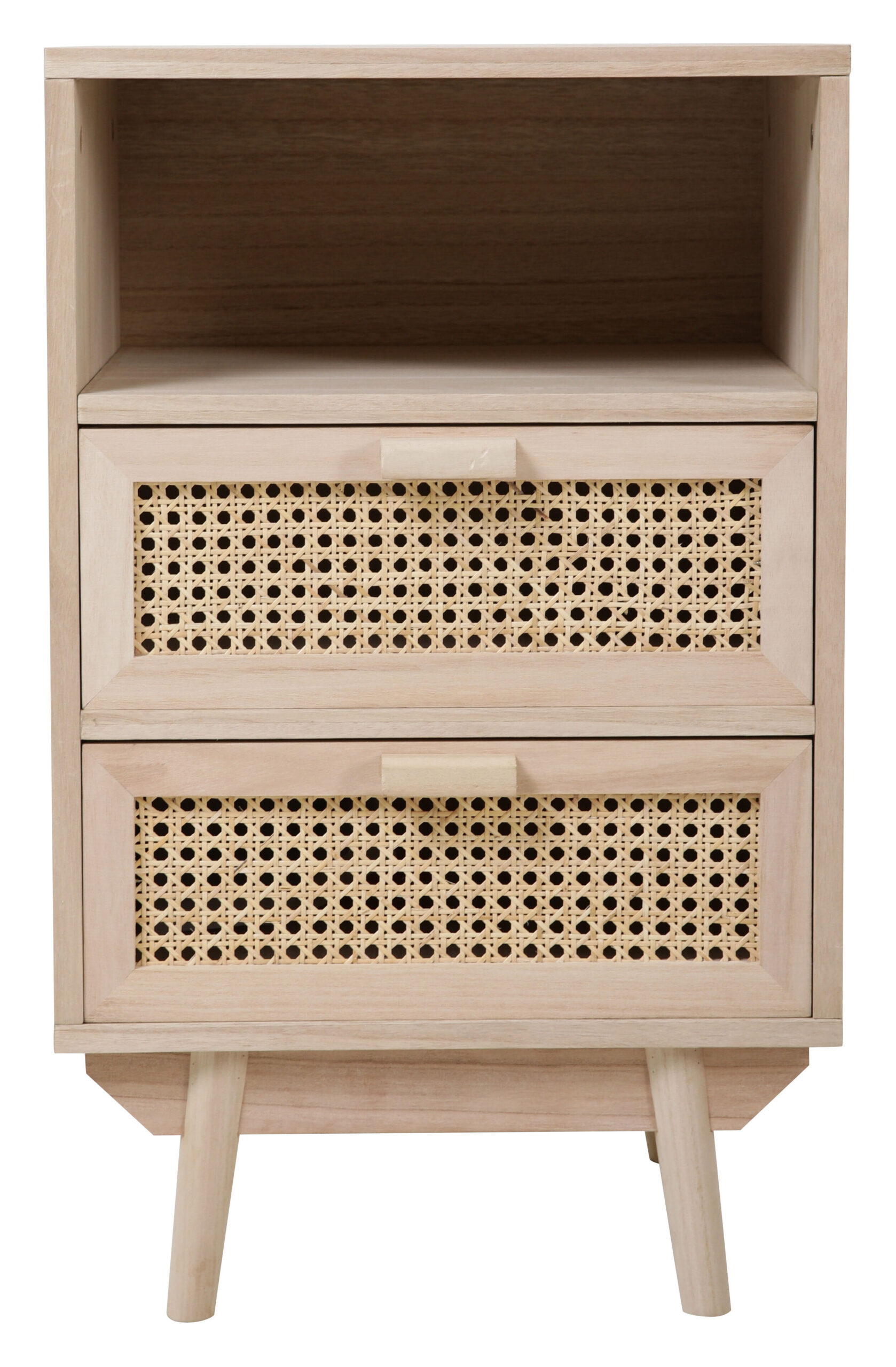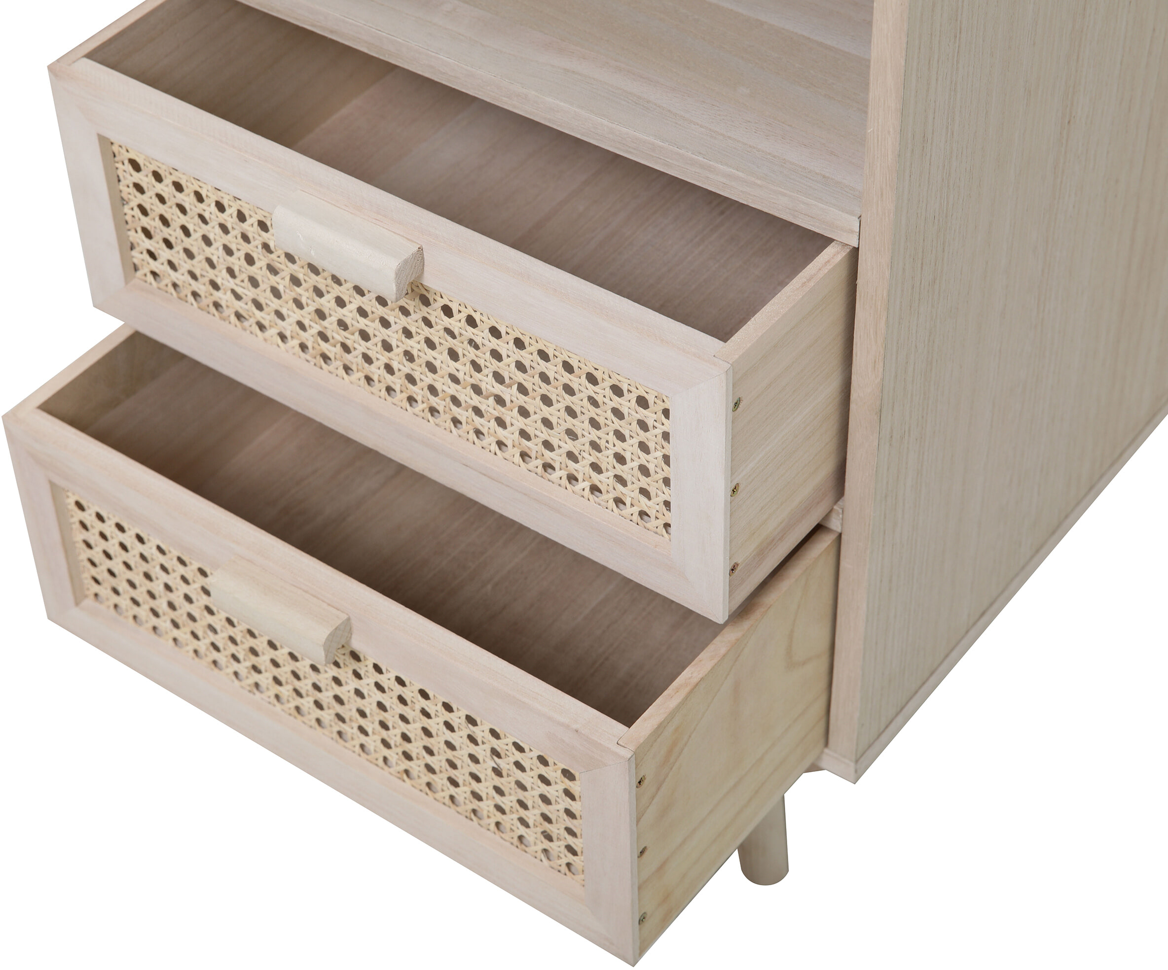 Ladekast ‘Hanny’ van Artistiq brengt een natuurlijke en luchtige sfeer in je interieur. Gemaakt van MDF, afgewerkt met licht paulownia houtfineer, straalt dit meubel rust en eenvoud uit. De laden met stijlvol rotan vlechtwerk voegen een speels, bohemian accent toe. Aan de bovenkant vind je een open vak, ideaal om je mooiste decoraties uit te stallen.