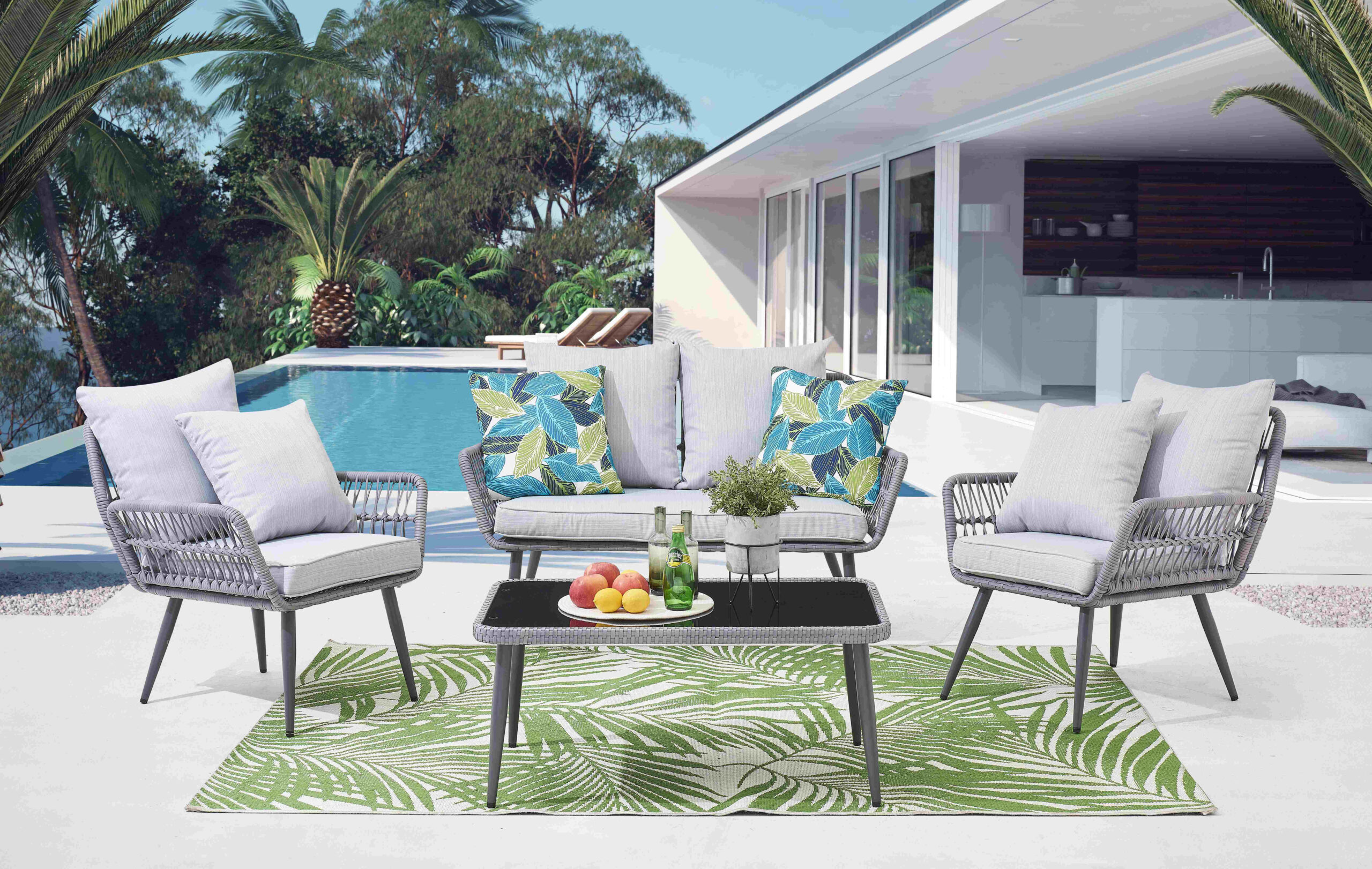 - Materiaal: Polyrotan (weer- en UV bestendig), gepoedercoat metaal onderstel en stoffen kussen (100% polyester). Tafel heeft een glazen blad