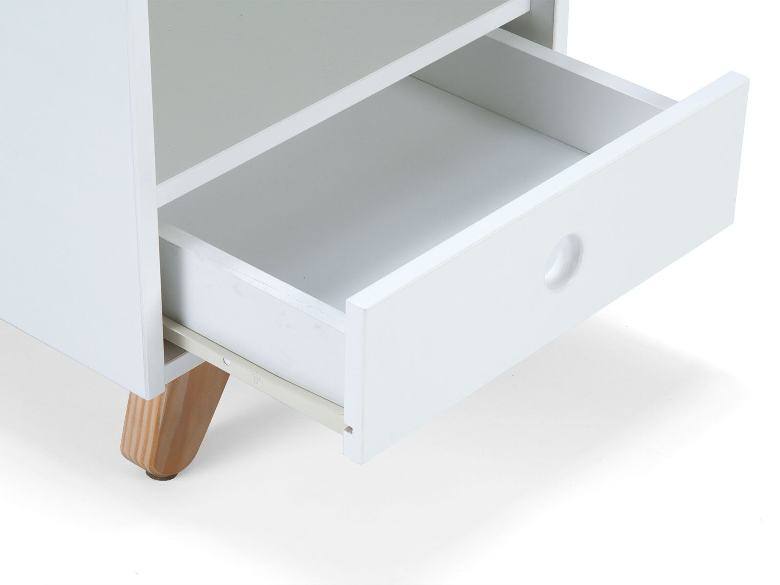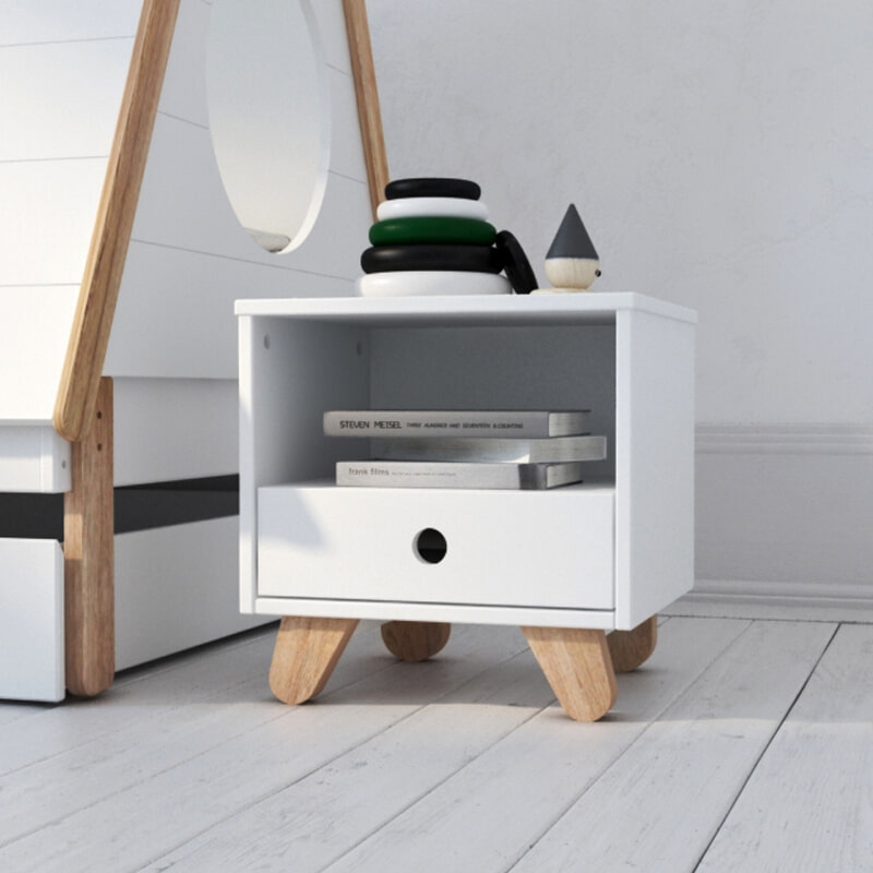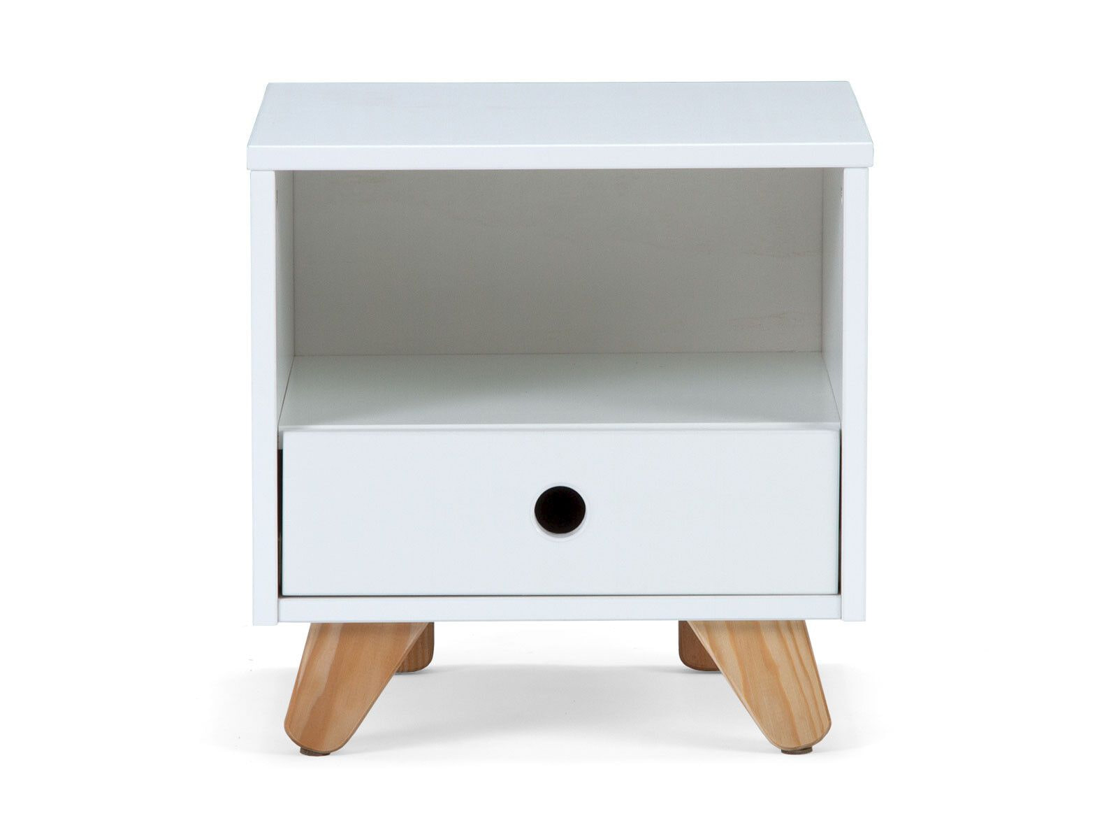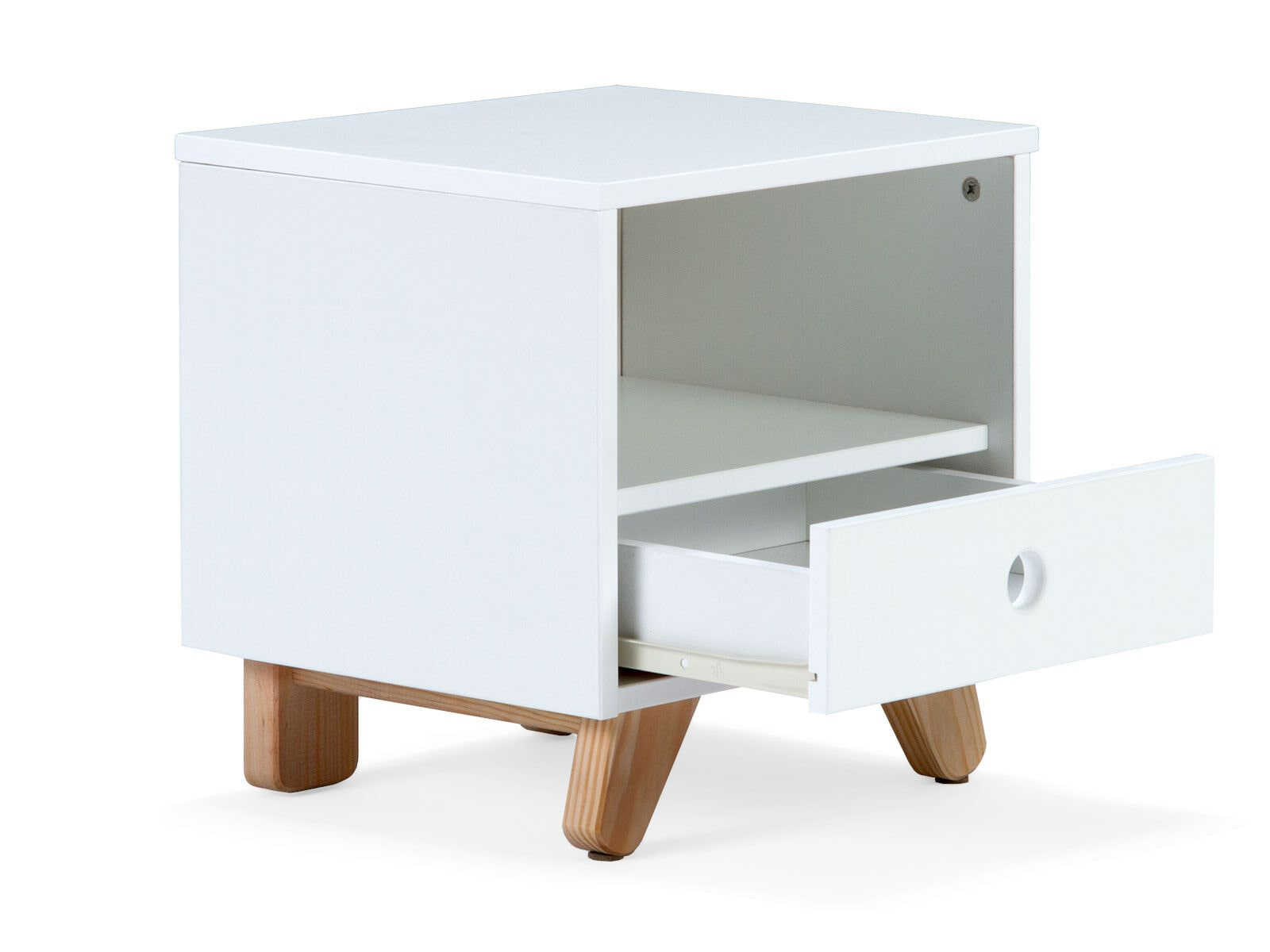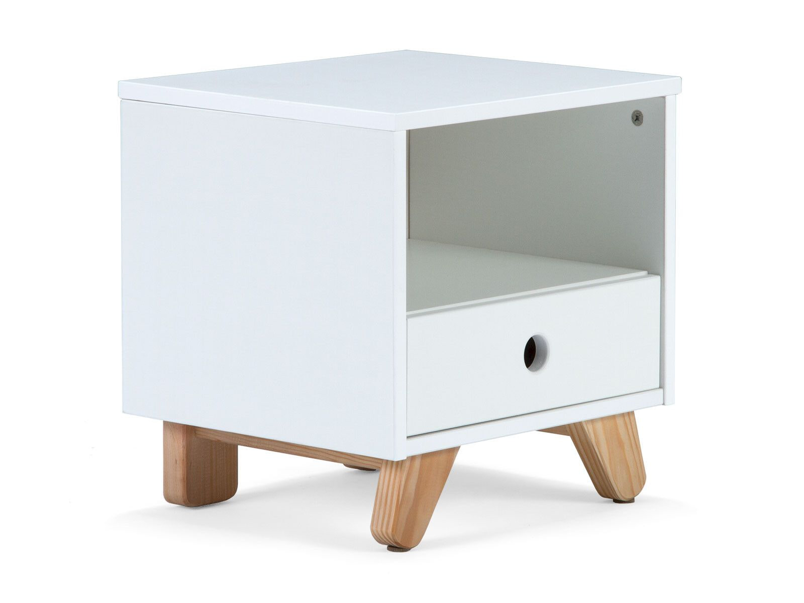 Dit nachtkastje in klassiek Scandinavisch design biedt praktische opbergruimte voor bedlampje en boeken, nog een open vak voor gemakkelijke toegang en nog een lade voor extra opbergruimte. De Scandinavisch-moderne kleurencombinatie van de witgelakte romp en het natuurlijke hout maken het nachtkastje tot een blikvanger. De eenvoud wordt onderstreept door de greeploze look met vingergaten. Schuine poten van grenenhout geven het nachtkastje een bijzonder moderne uitstraling.