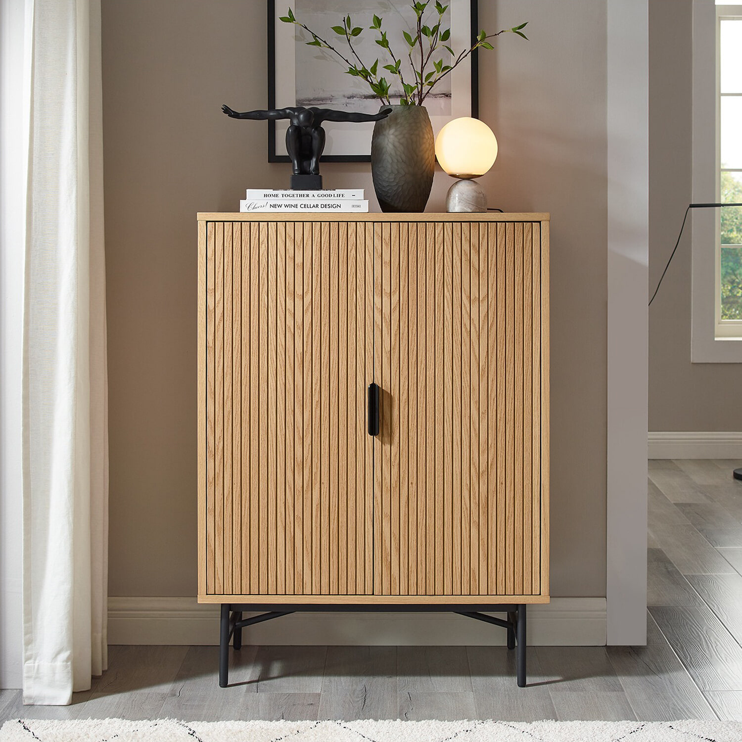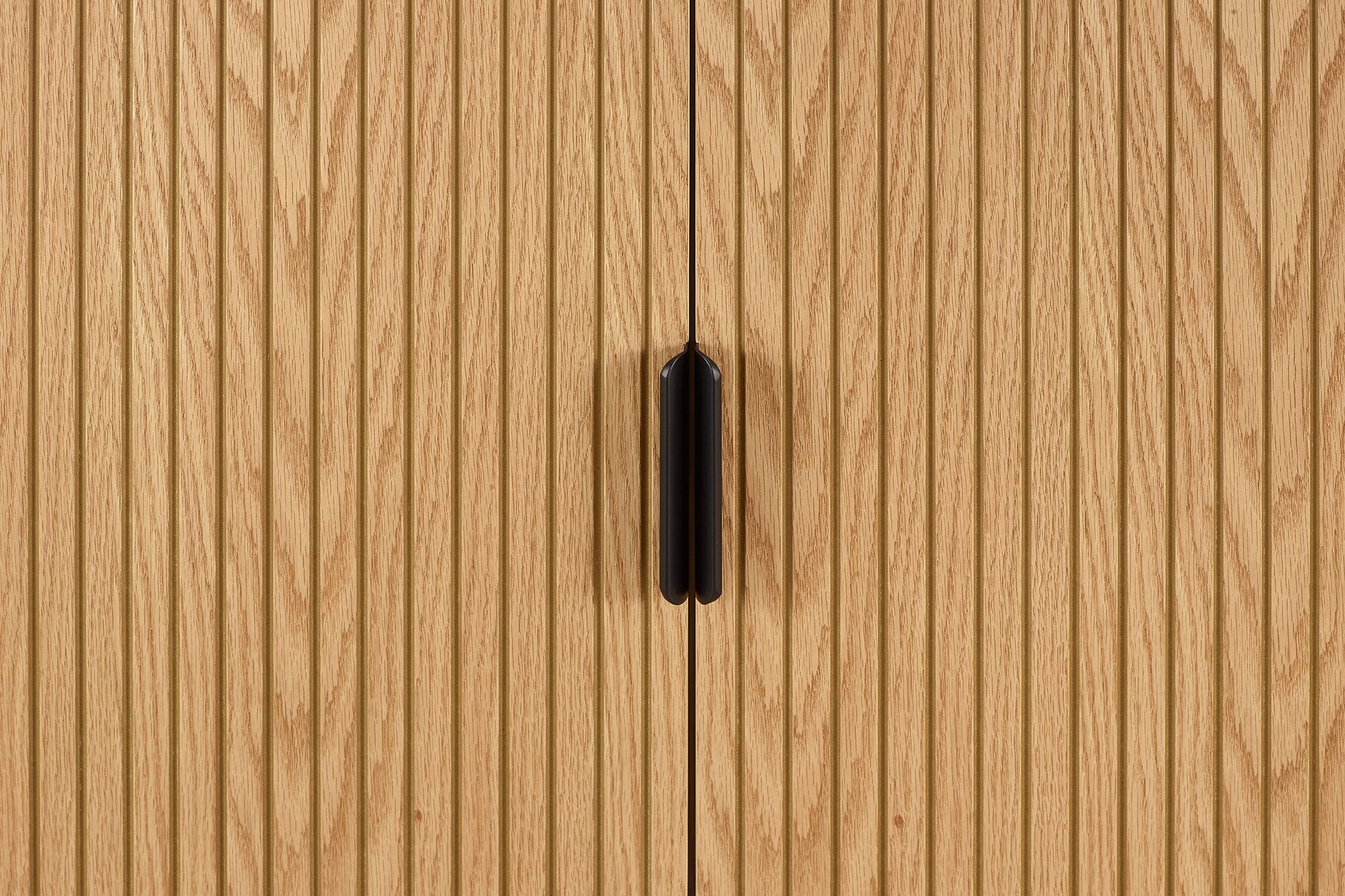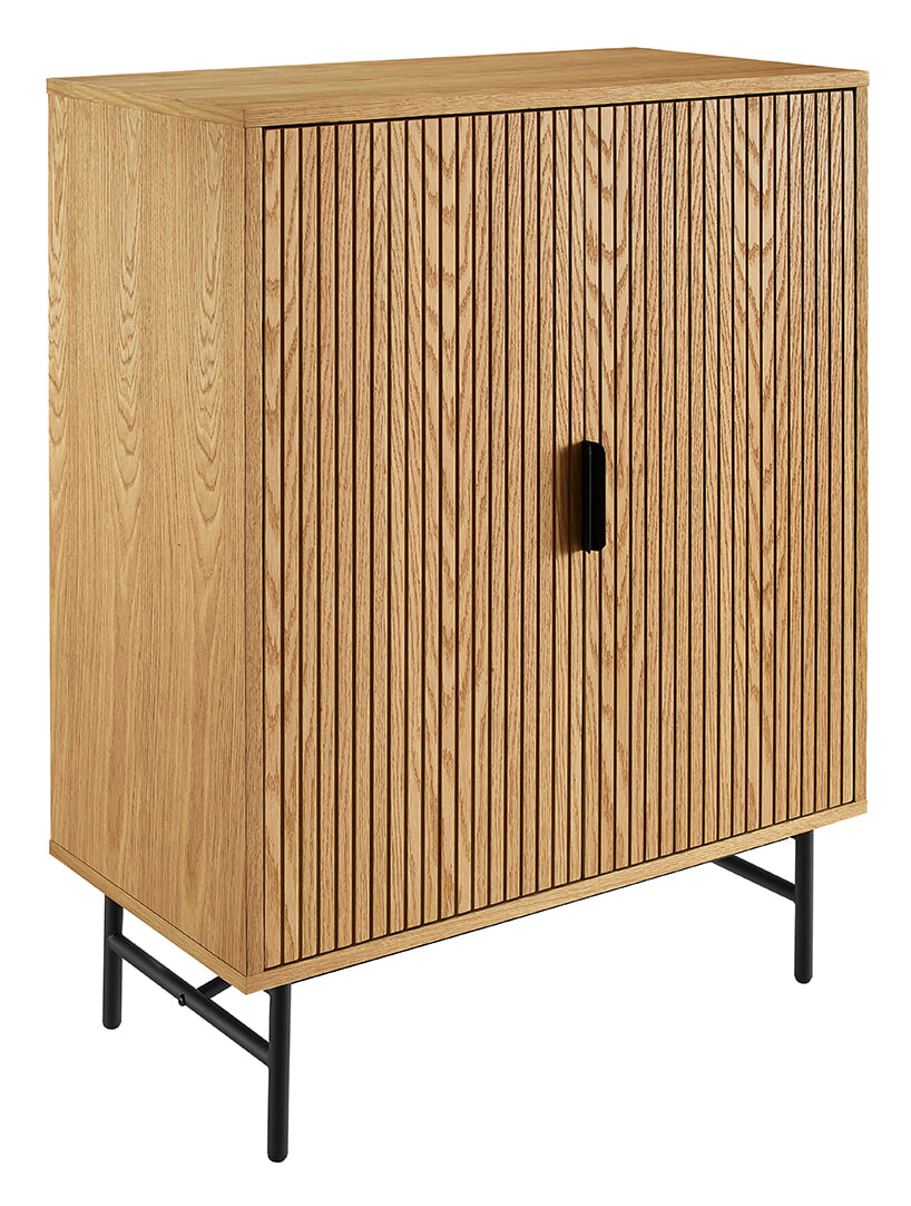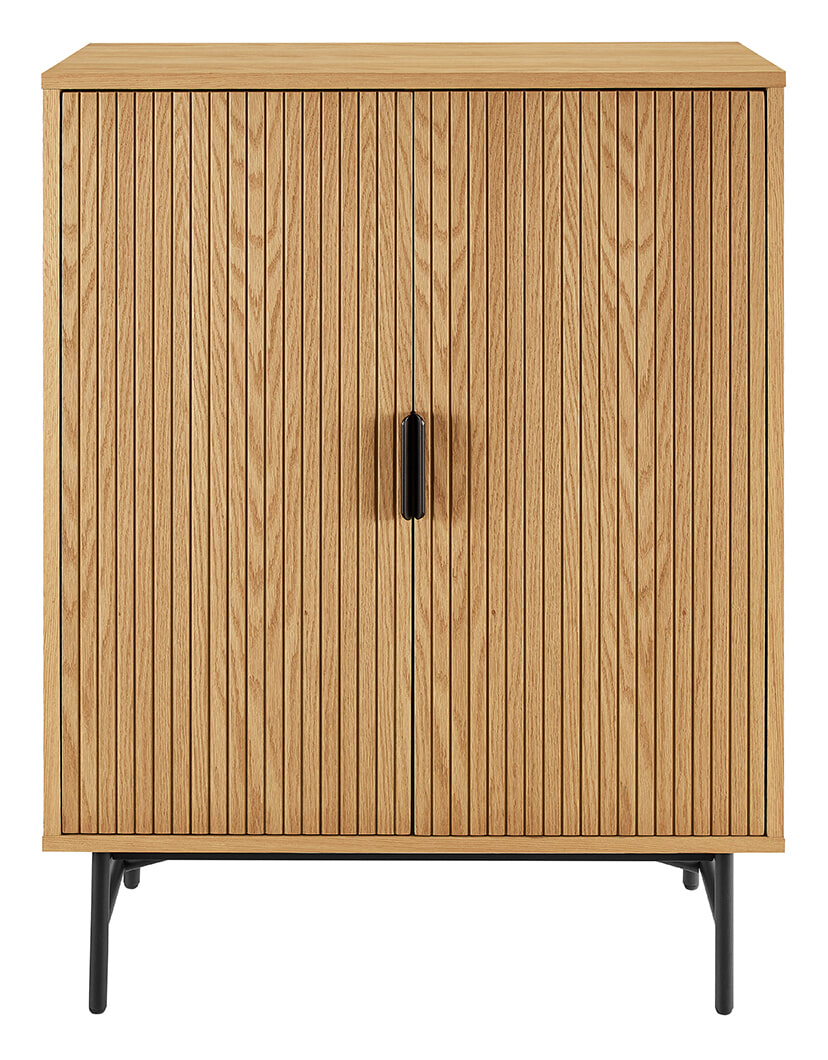 De Shoua opbergkast van Artistiq Living is een stijlvol meubel met een helder, Scandinavisch karakter. Gemaakt van eikenfineer, straalt de kast warmte en rust uit. De twee deuren zijn voorzien van een verfijnde latjesstructuur, wat diepte en ritme geeft aan het ontwerp.