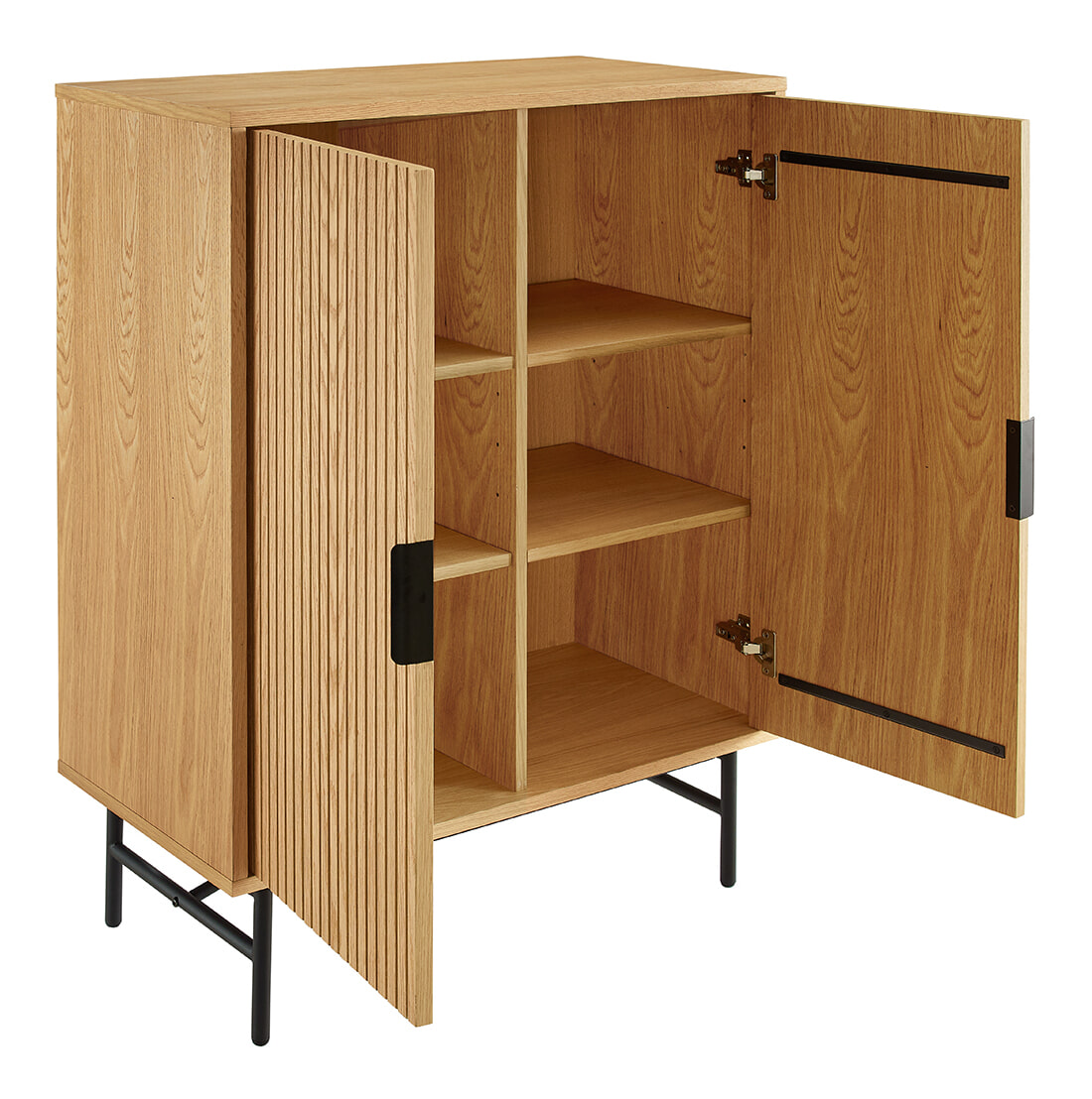 Metalen handgrepen en een hoog onderstel zorgen voor een krachtig contrast en een moderne, luchtige uitstraling.Achter de deuren bevinden zich zes vakken, netjes verborgen achter het grafische lijnenspel van het front. Shoua is een kast waarin materiaal, vorm en detail perfect in balans zijn. Ingetogen en toch uitgesproken.