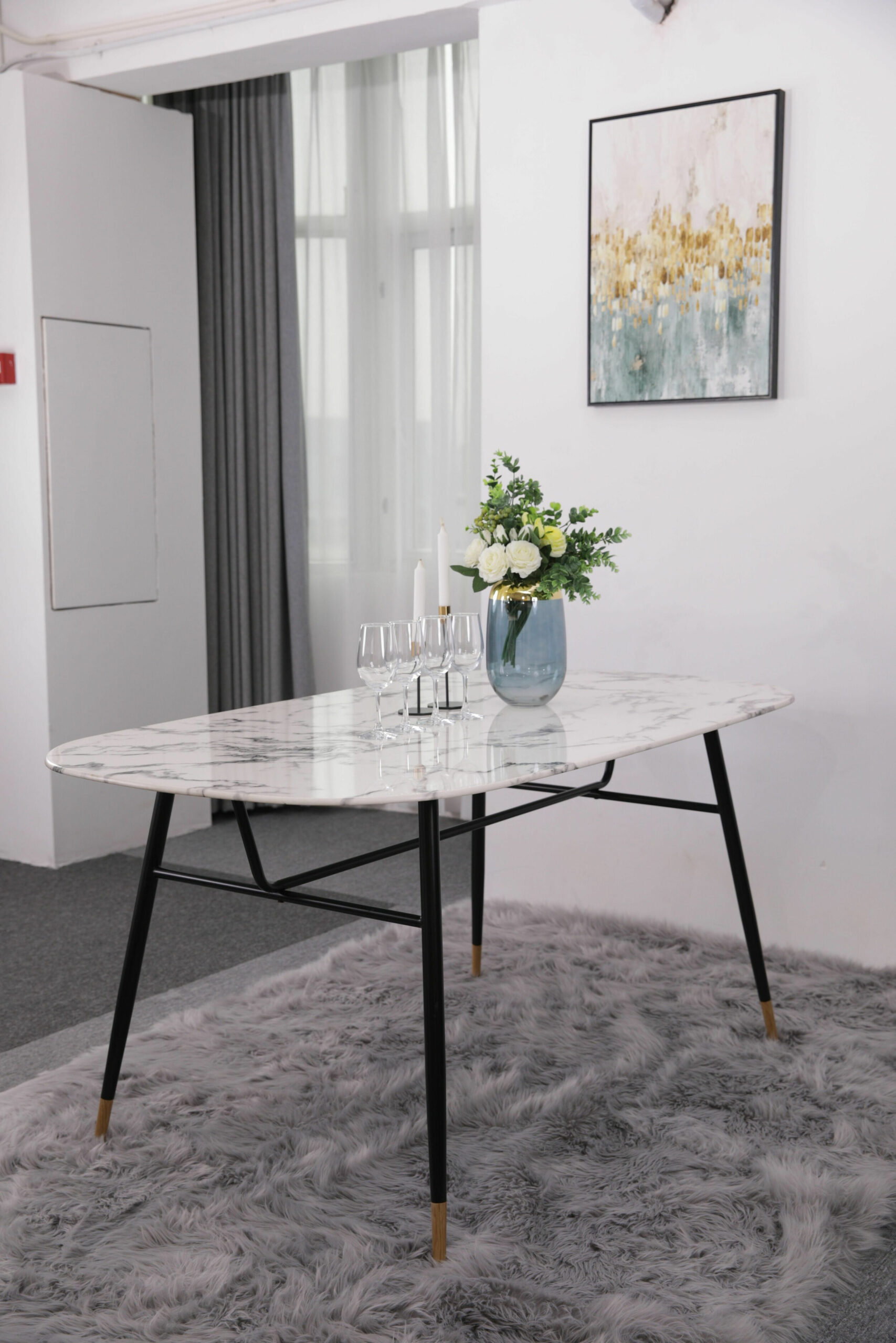 - Materiaal: Glazen blad met marmerlook en gepoedercoat metalen frame