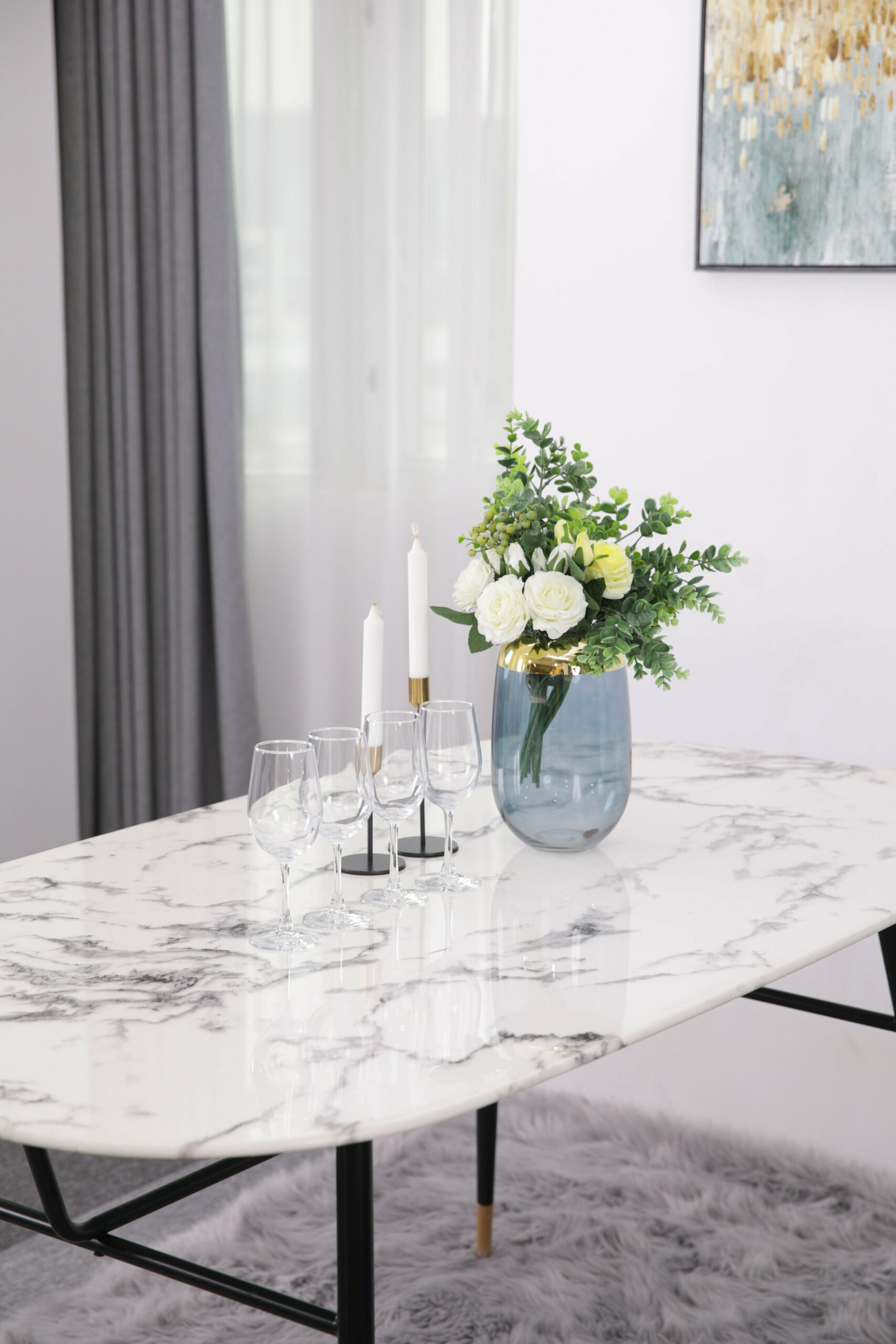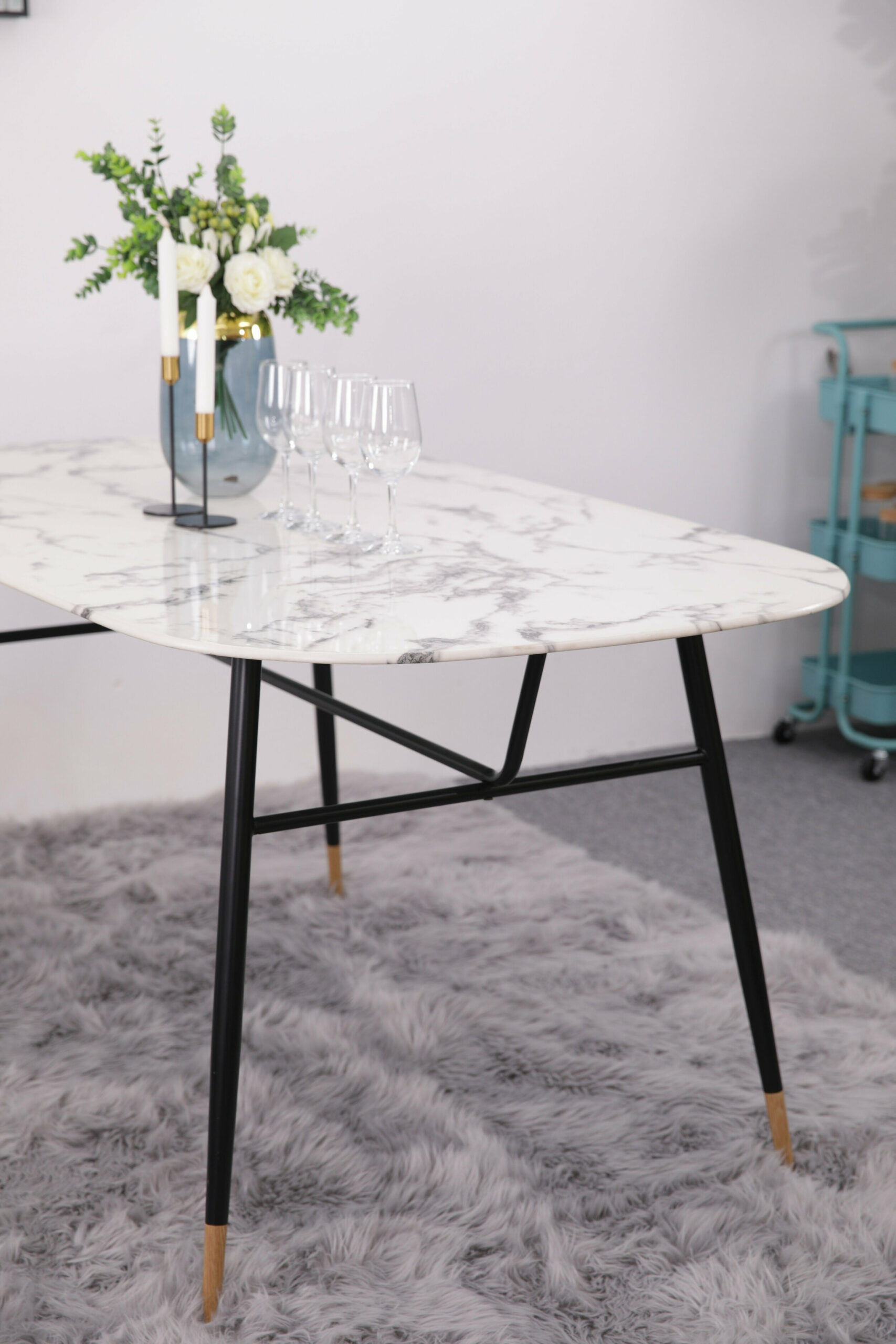 Deze elegante eettafel met een filigraan metalen frame en een afgerond glazen blad in marmerlook maakt je eethoek veel eleganter.
