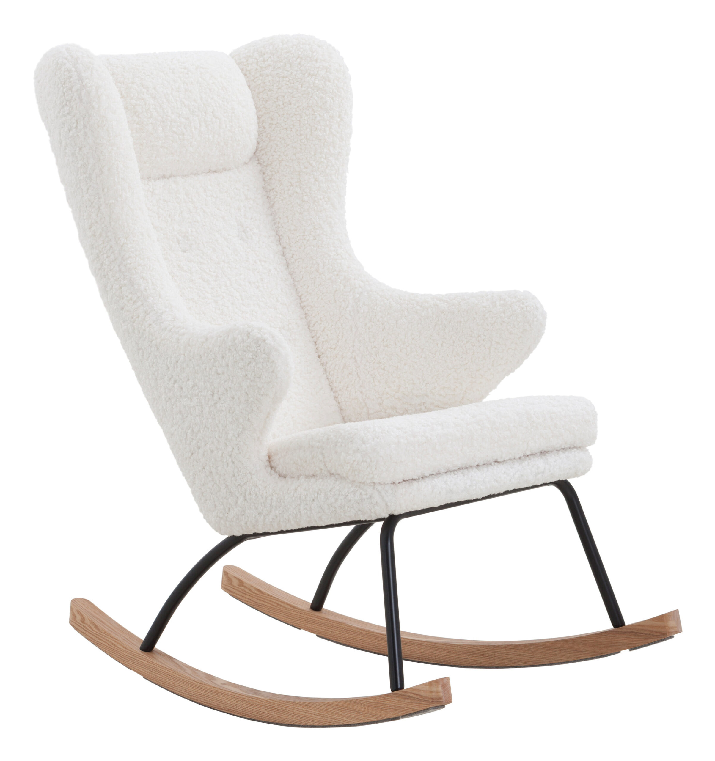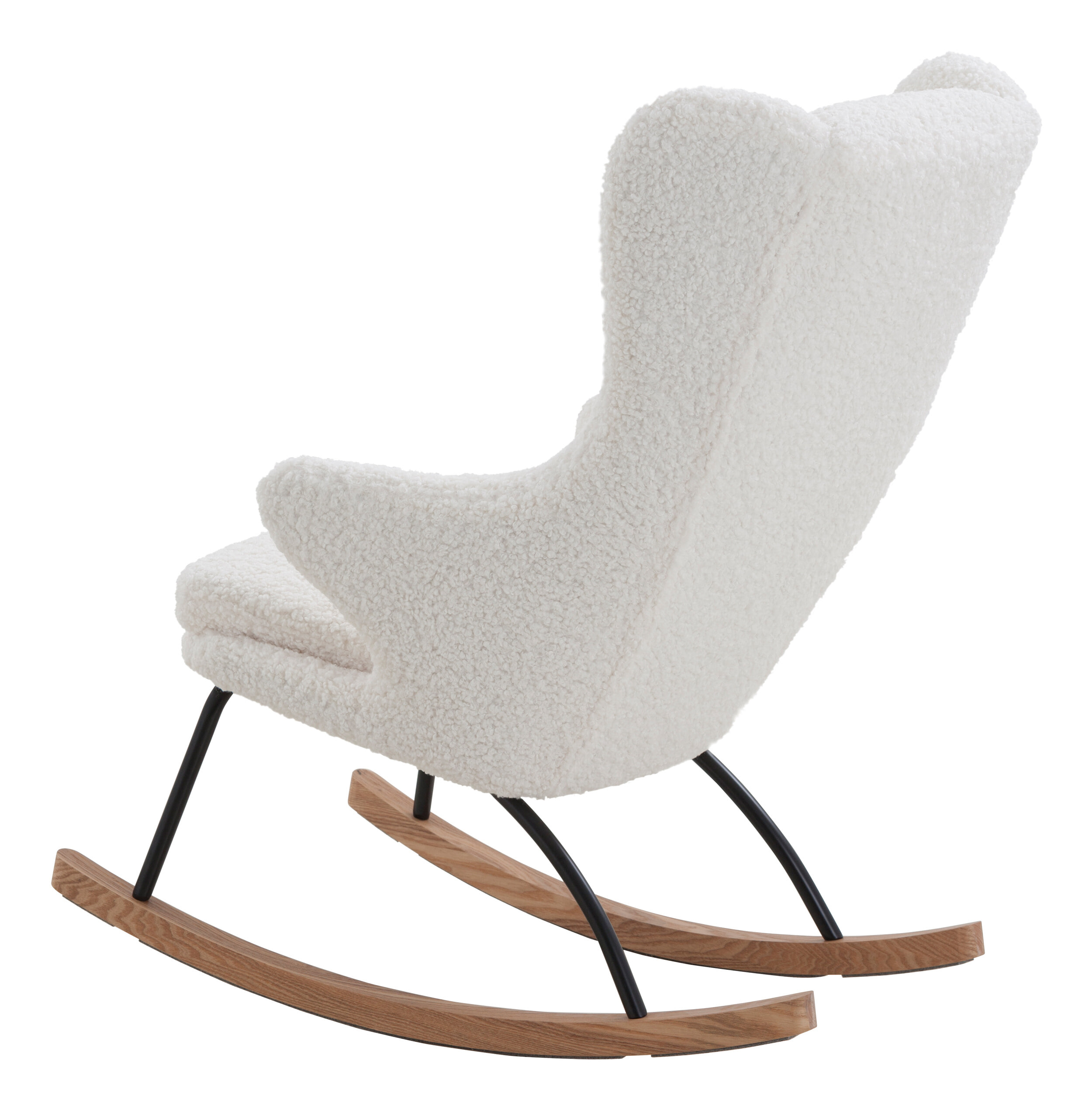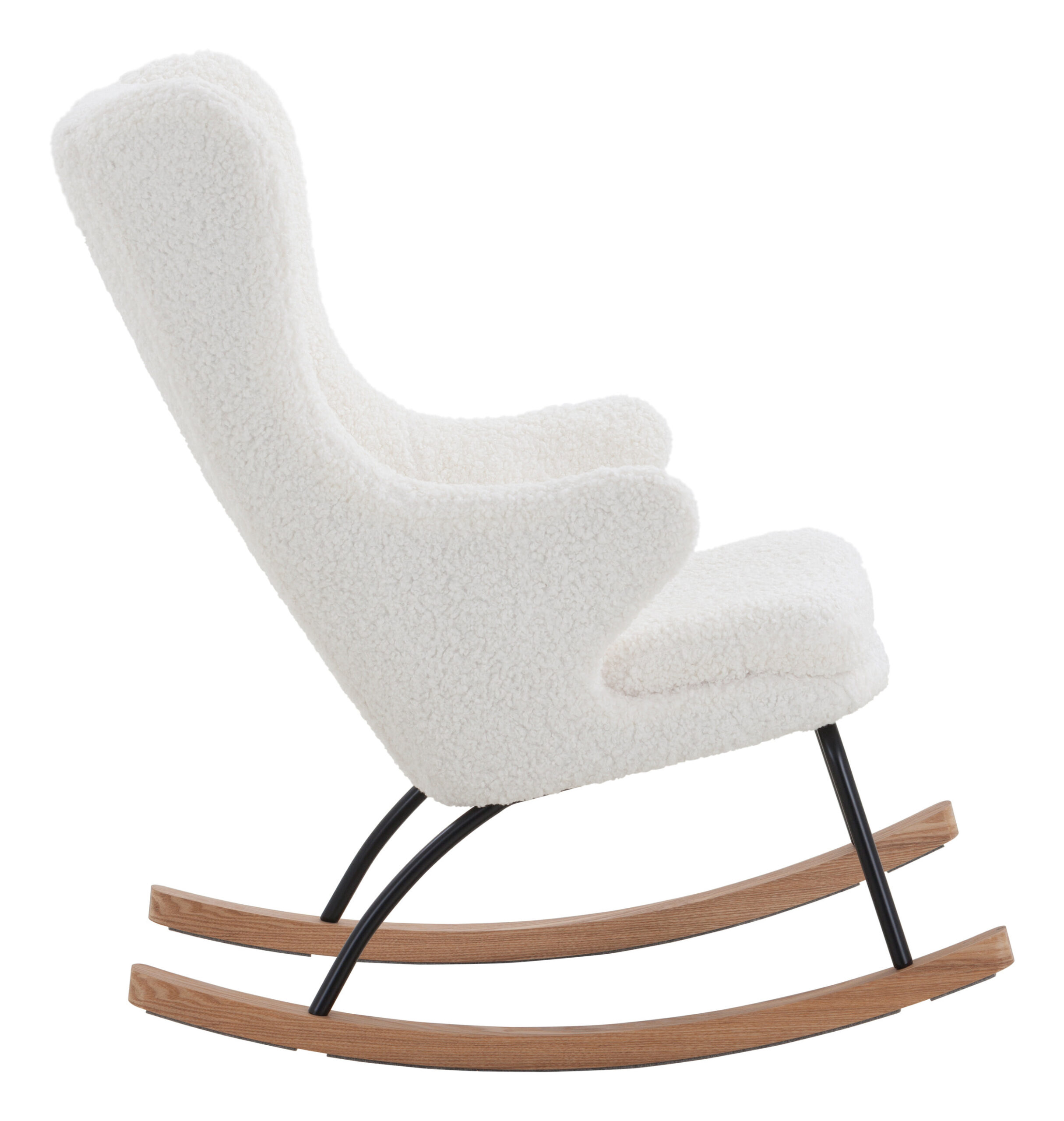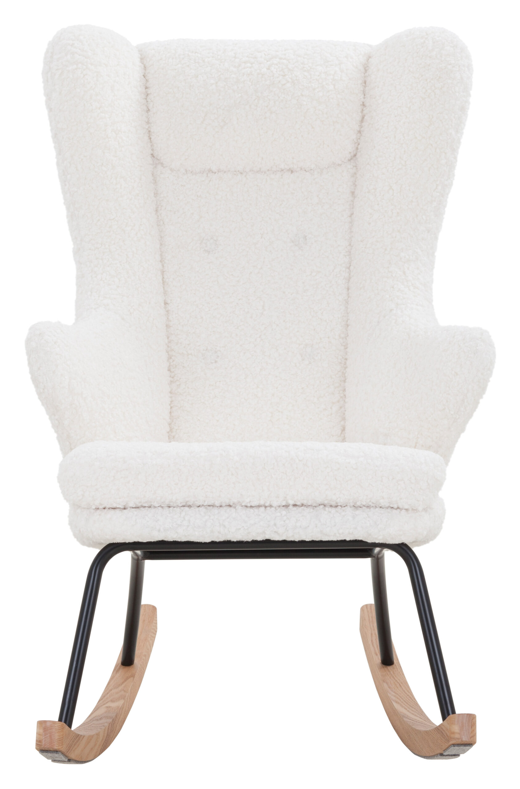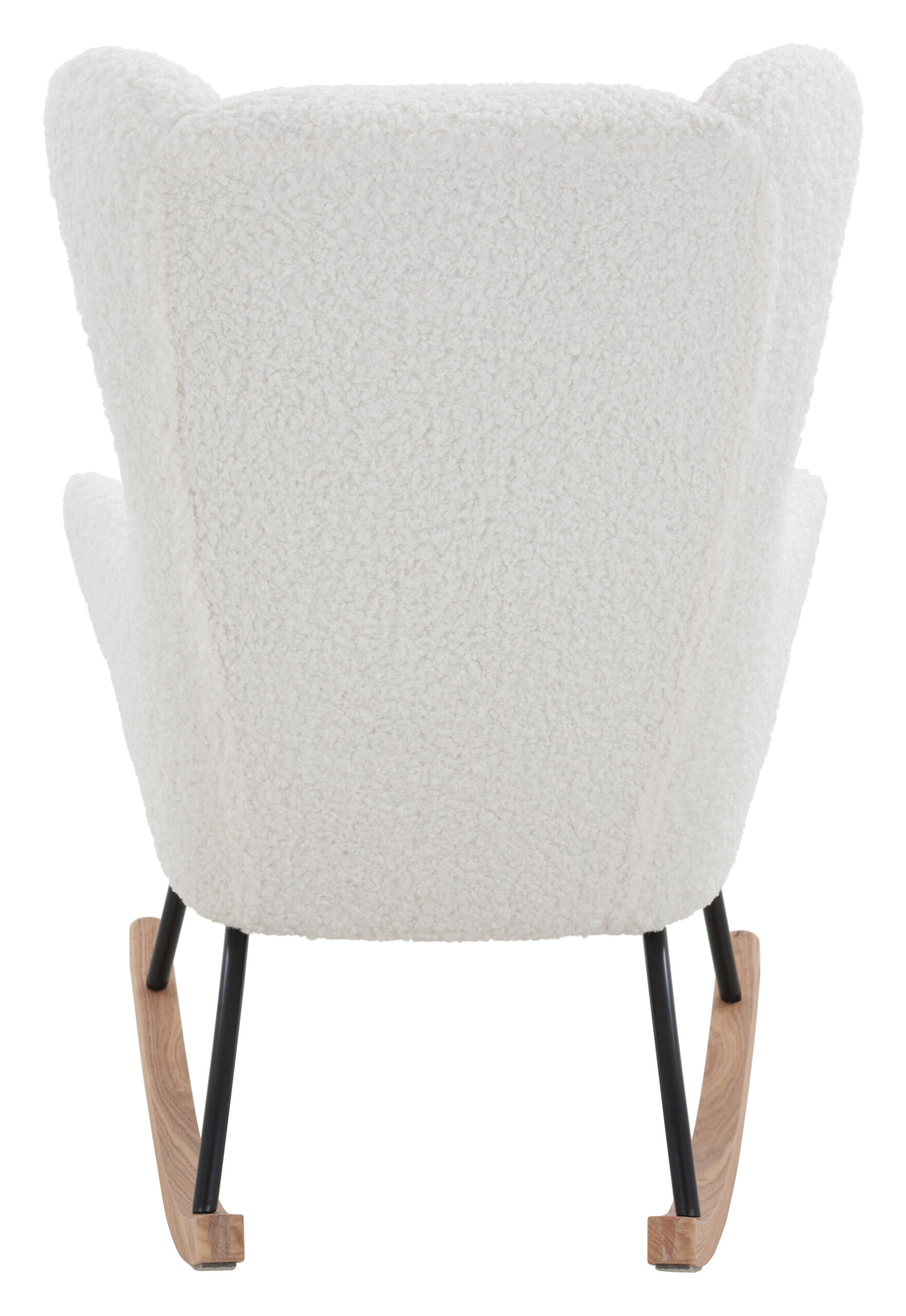 Deze gezellige schommelfauteuil presenteert zich in het trendy Scandinavische ontwerp. Hij biedt een moderne uitstraling met klassieke elementen en zijn gebogen lijnen maken hem tot een blikvanger. De decoratieve zitting heeft een extra hoge rugleuning in de stijl van de vleugelstoel. Direct hiermee verbonden zijn de comfortabele armleuningen in een uitlopende vorm. Ze harmoniëren perfect met het zitkussen, dat naar voren toe afgerond is. Door de aangename bekleding biedt de schommelstoel veel zitcomfort. De aaibare bekleding van teddybont, die zacht aanvoelt, draagt daar ook toe bij. De fauteuil is gecombineerd met lopers van massief hout, die stevig verbonden zijn met het stabiele frame van gepoedercoat metaal.