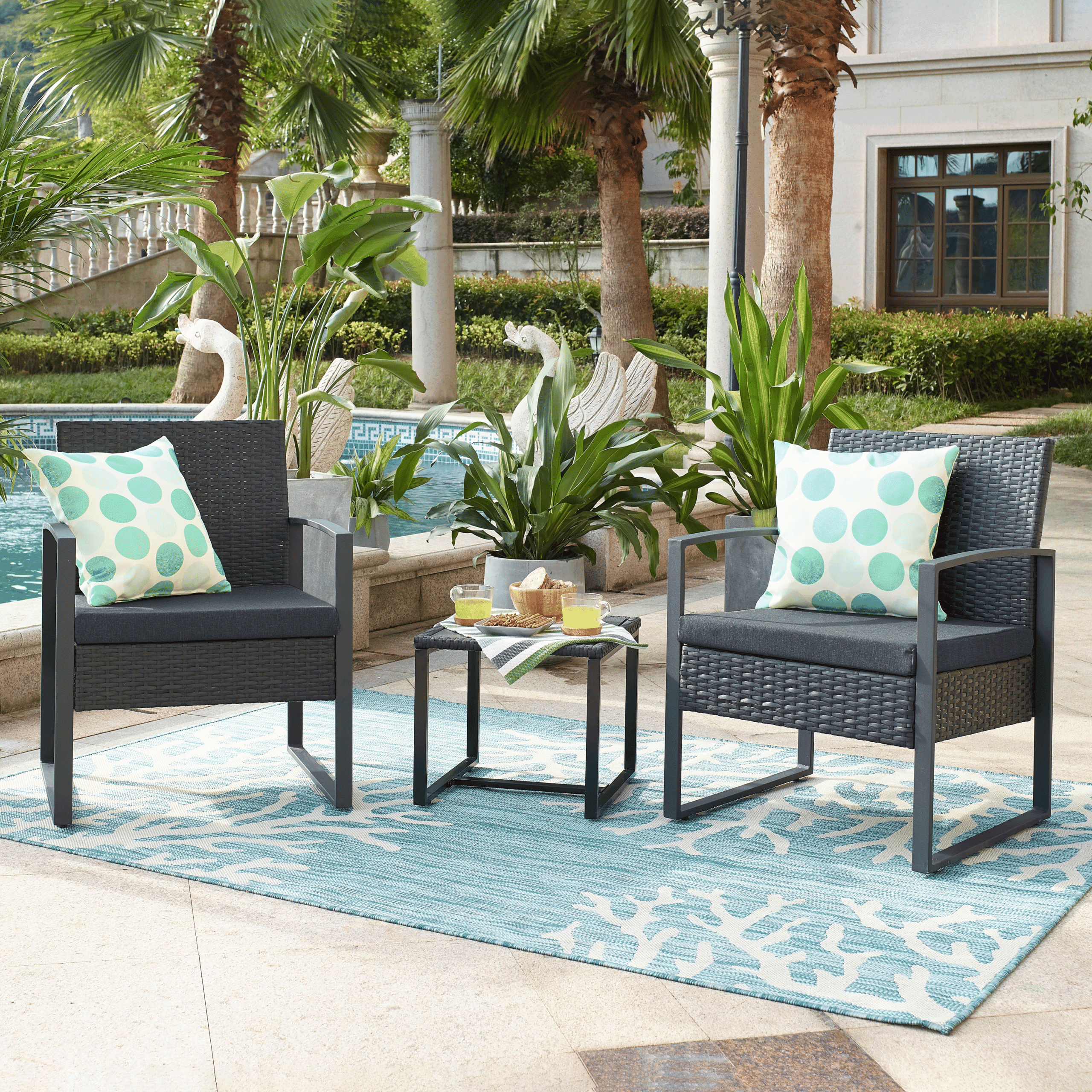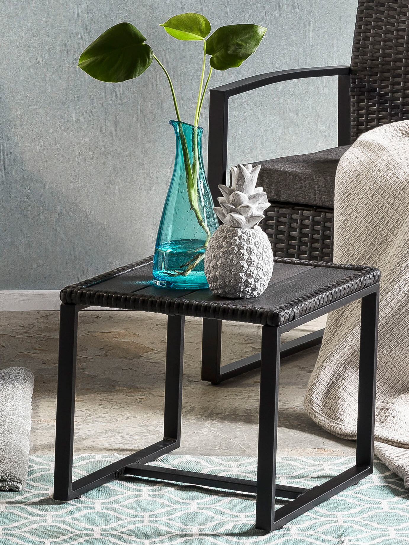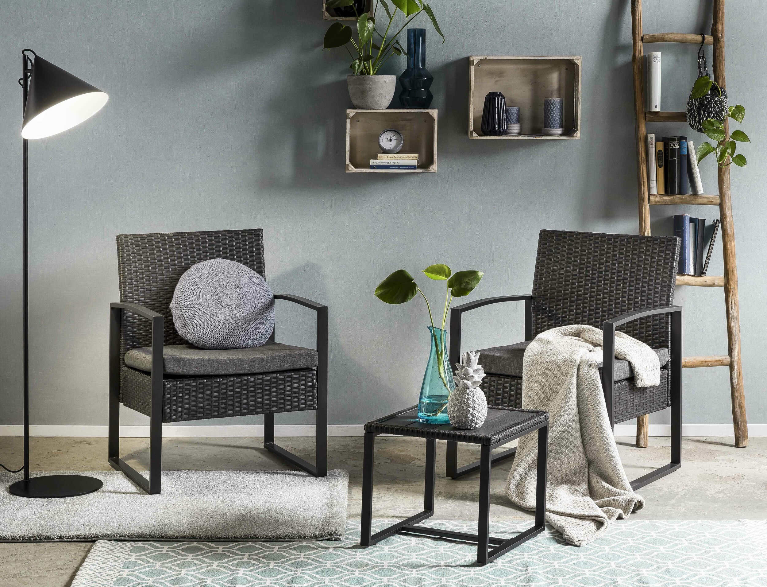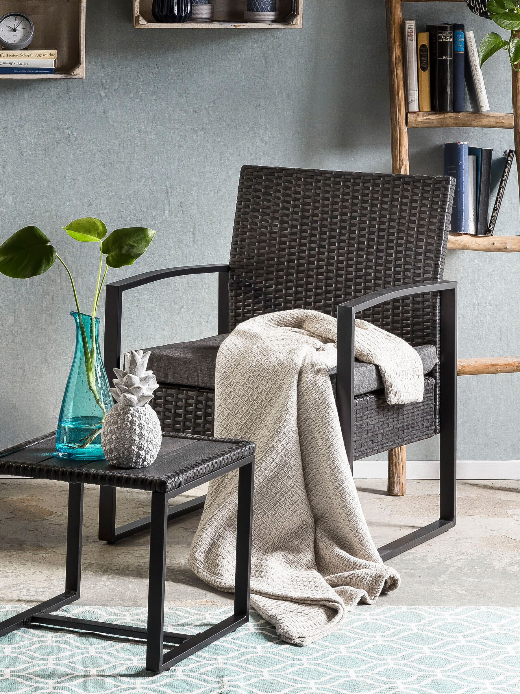 - Materiaal: Gecoat aluminium en kunststof rattan