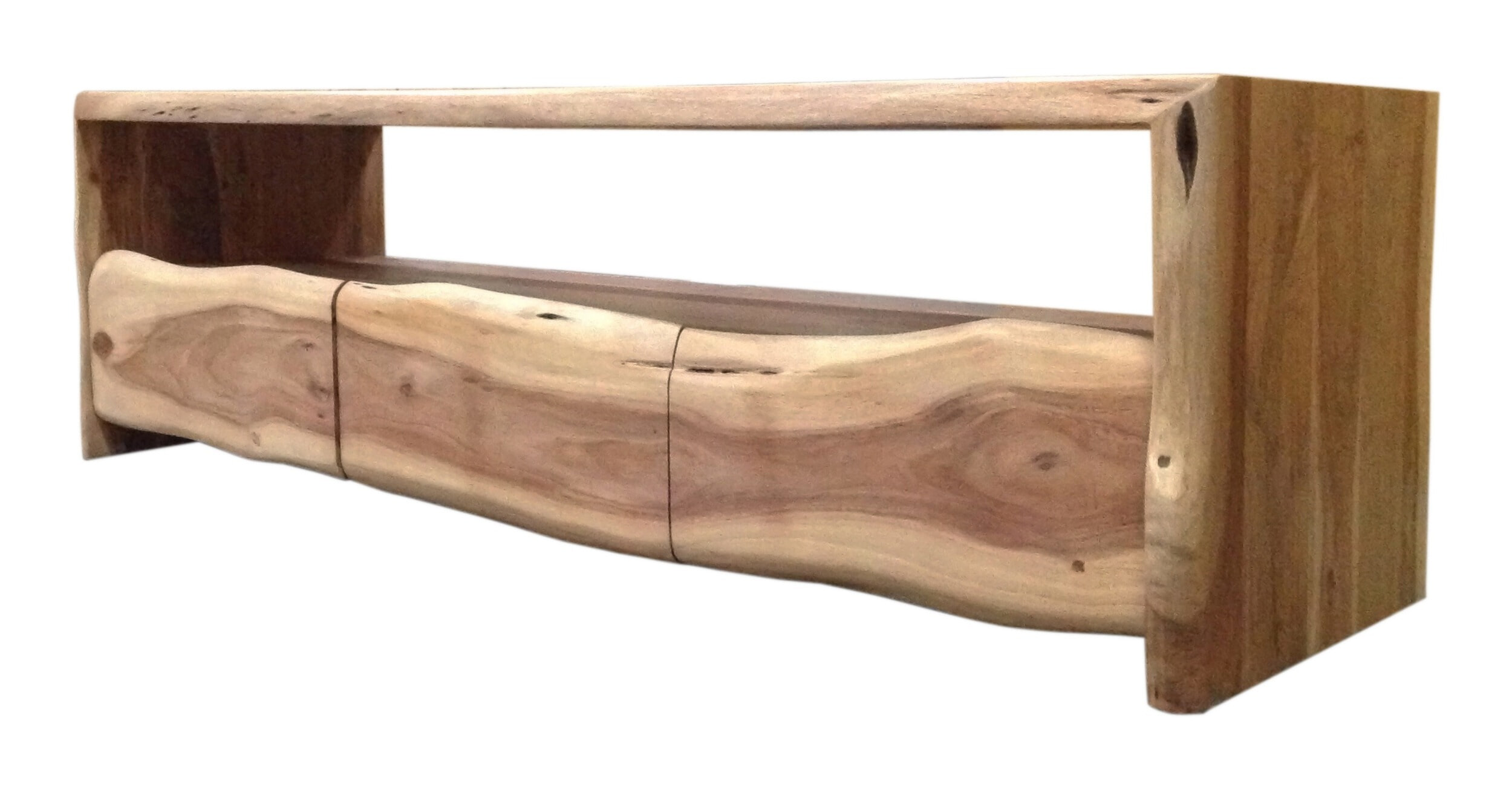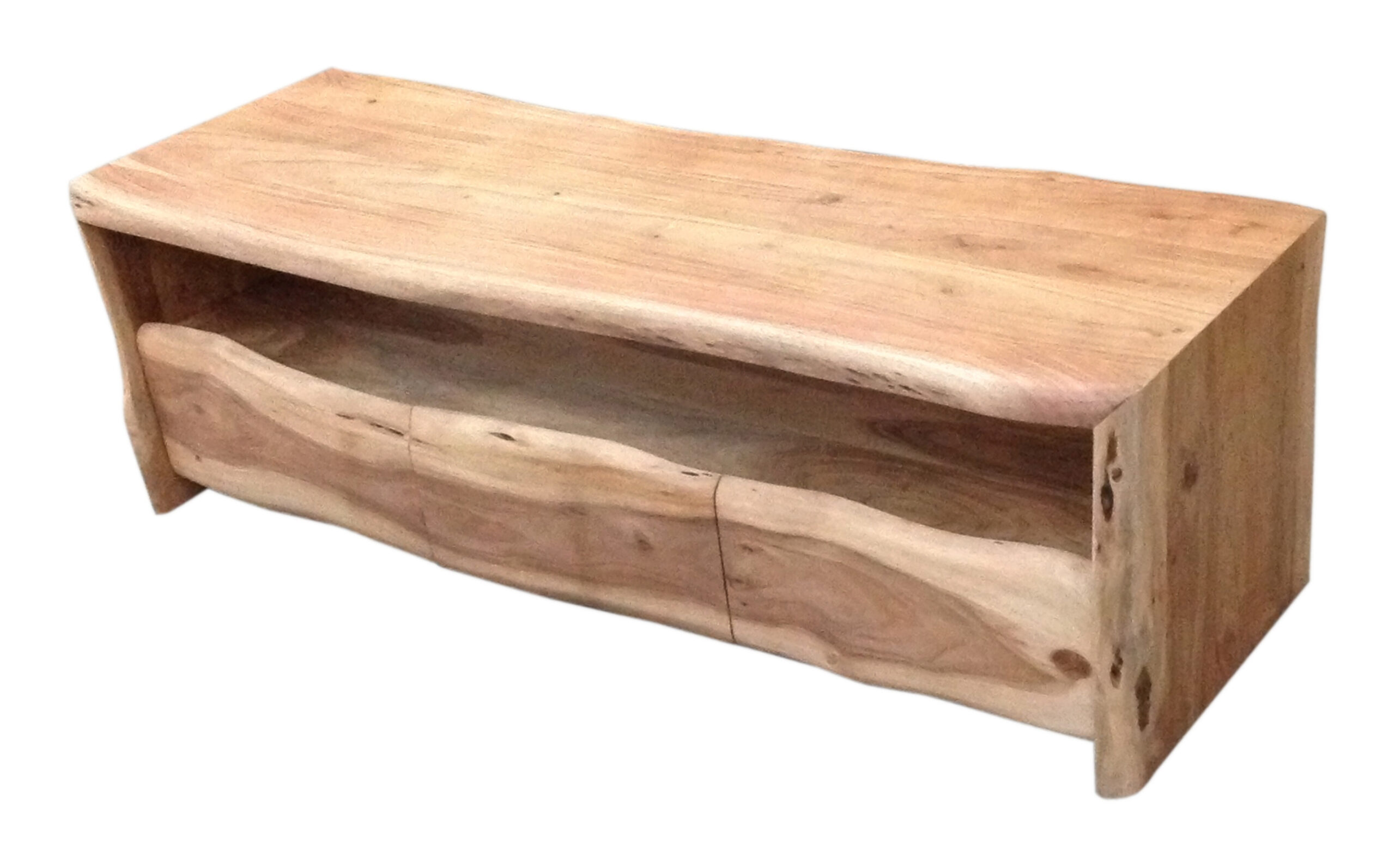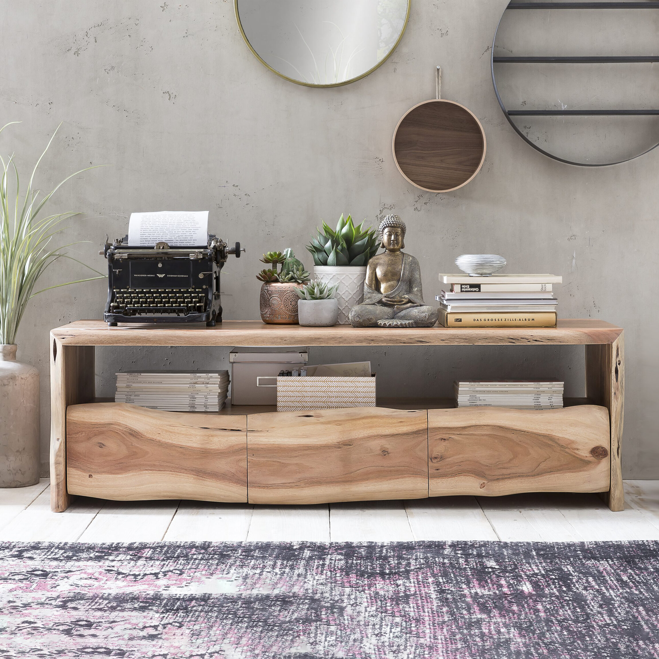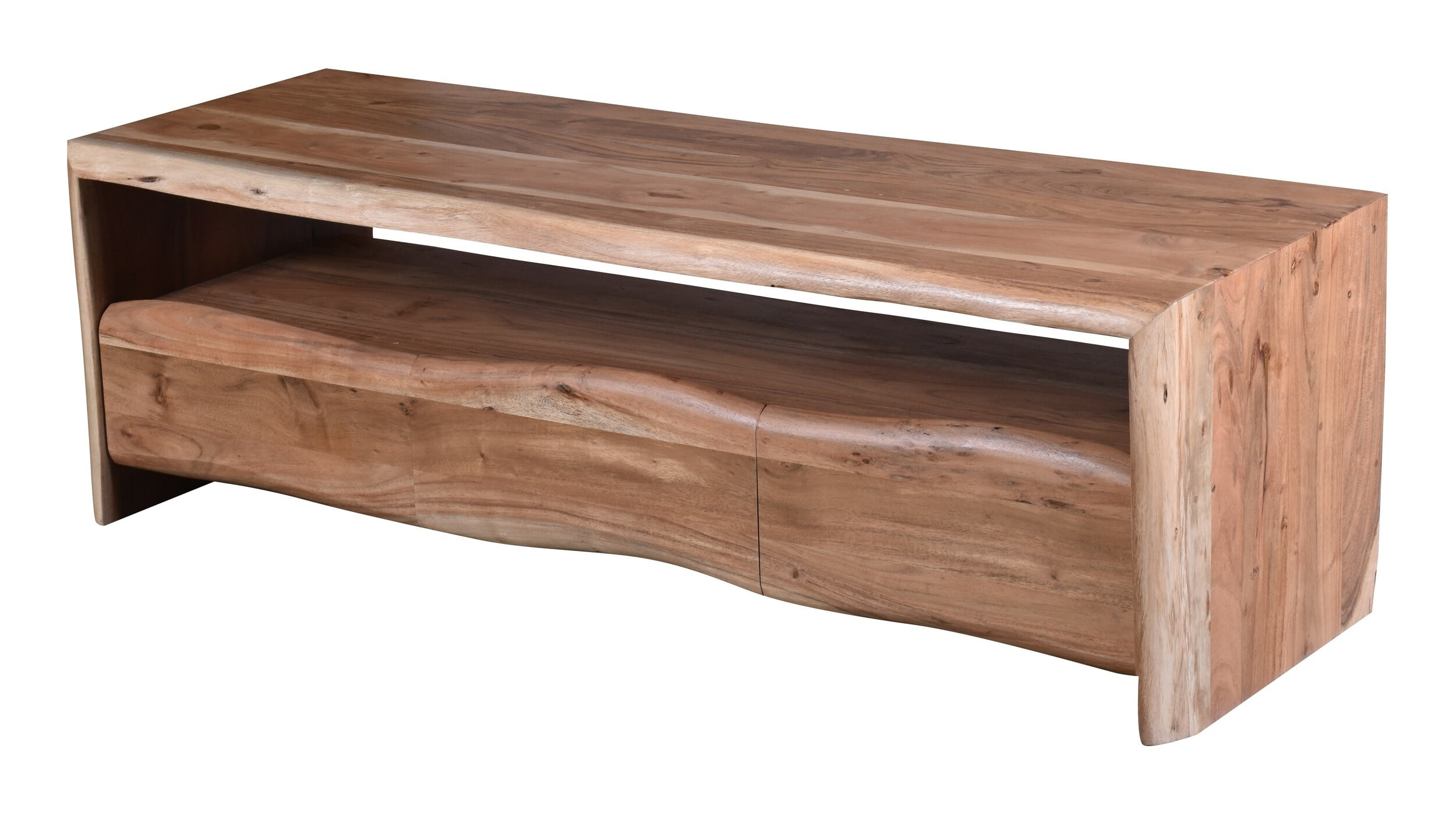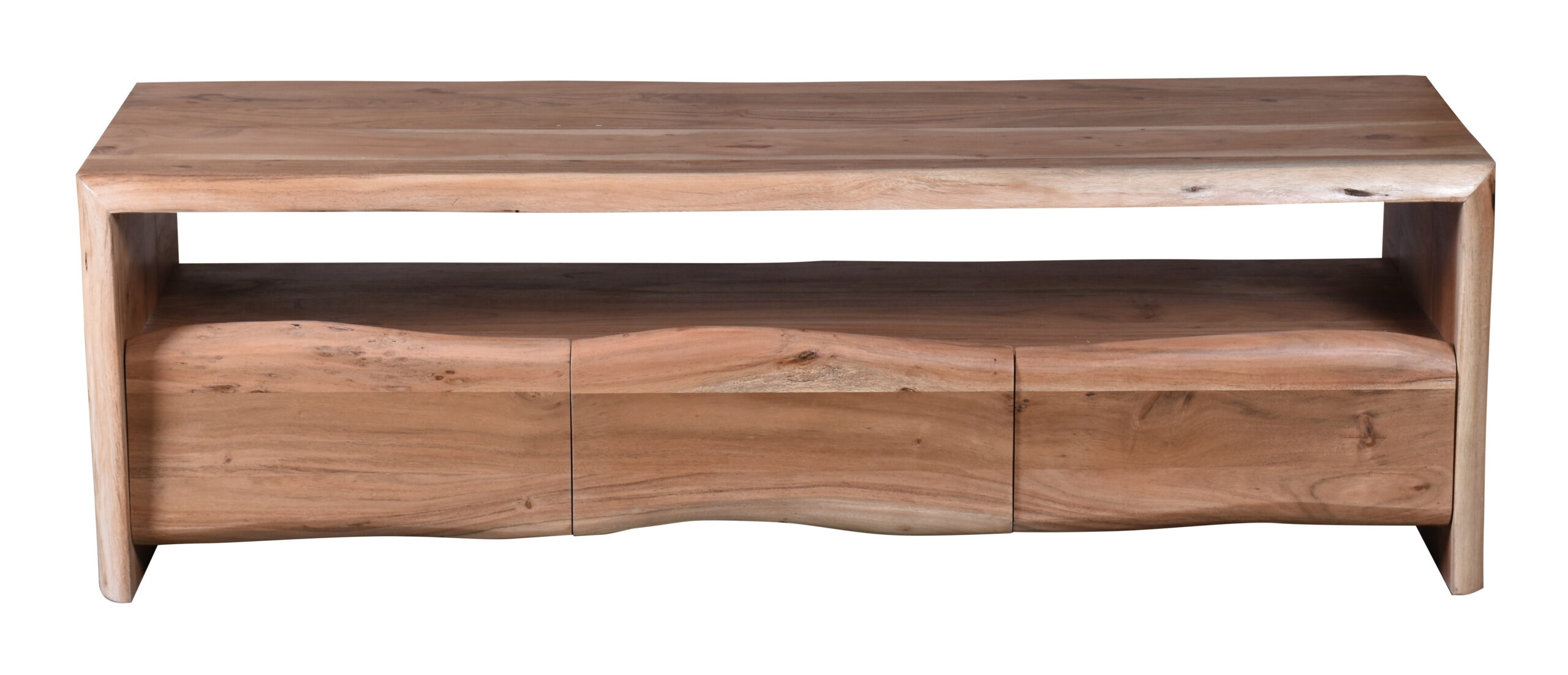 Massief acacia met dat zekere iets, natuurlijk gegroeide vormen van hout worden het stijlbepalende element van de meubels – ja, de natuur is hier niet getrimd. Daarom zit er veel kunst in de productie, want je moet elke plank zorgvuldig lezen en de juiste rangschikking ten opzichte van elkaar vinden, zodat er een samenhangend beeld ontstaat zoals hier. Uiteindelijk is geen van deze eindproducten hetzelfde, zodat elk van deze fascinerende meubelstukken gegarandeerd uniek is. Als je van het echte werk houdt en op zoek bent naar iets bijzonders, dan ben je hier aan het juiste adres. 3 lades en het ruime open vak bieden diverse opbergmogelijkheden.