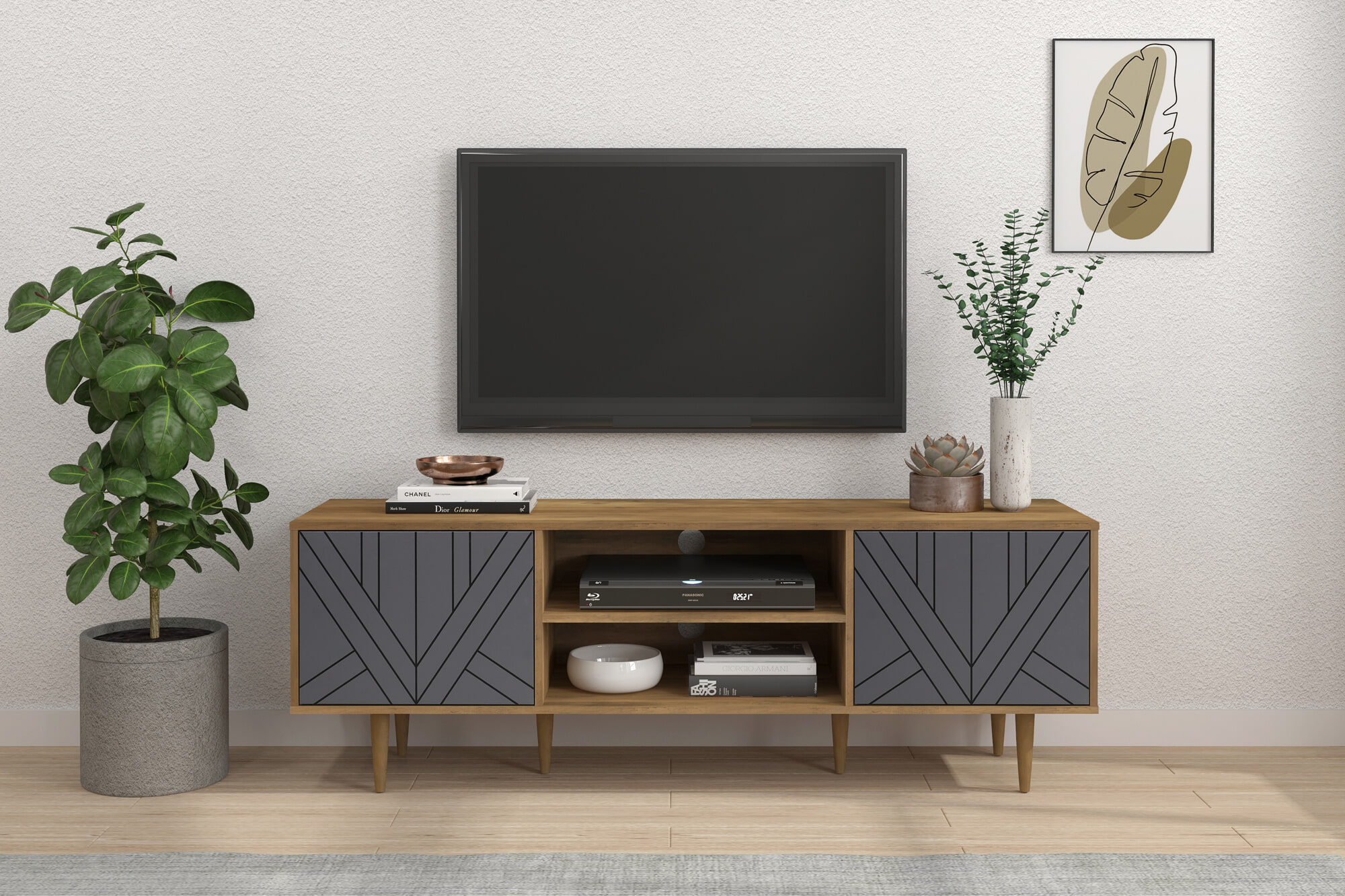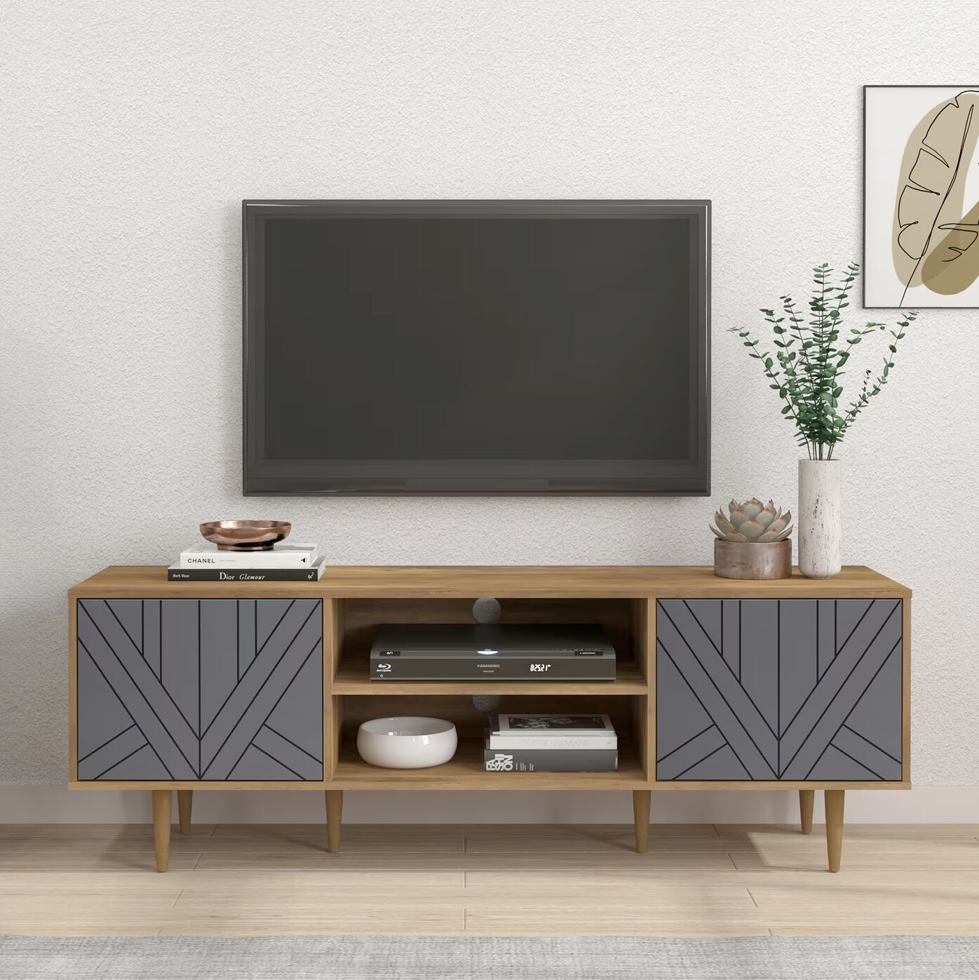 Het tijdloze lowboard in naturel met twee deuren in neutraal grijs met een geometrisch zwart lijnenpatroon biedt voldoende ruimte voor tv’s tot een formaat van 70 inch. Er is ruimte voor extra hifi-apparaten in de twee open vakken met kabelgoten. Afstandsbedieningen, losse kabels en andere kleine voorwerpen kunnen gemakkelijk worden opgeborgen achter de twee deuren, elk met een in hoogte verstelbare plank. De push-to-open functie vergemakkelijkt het openen van de deuren. Dit lowboard is ook morgen nog eigentijds en kan prachtig gecombineerd worden met je bestaande interieur. De poten zijn hoog genoeg zodat er een stofzuigrobot onderdoor kan rijden. Je kunt zien dat je de juiste beslissing hebt genomen door voor het lowboard te kiezen.