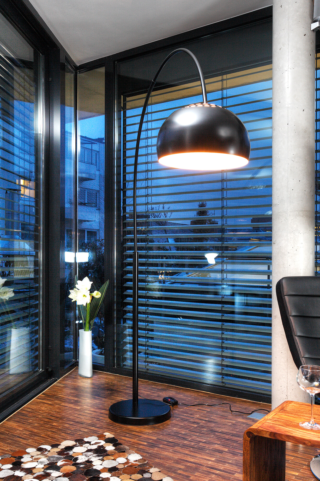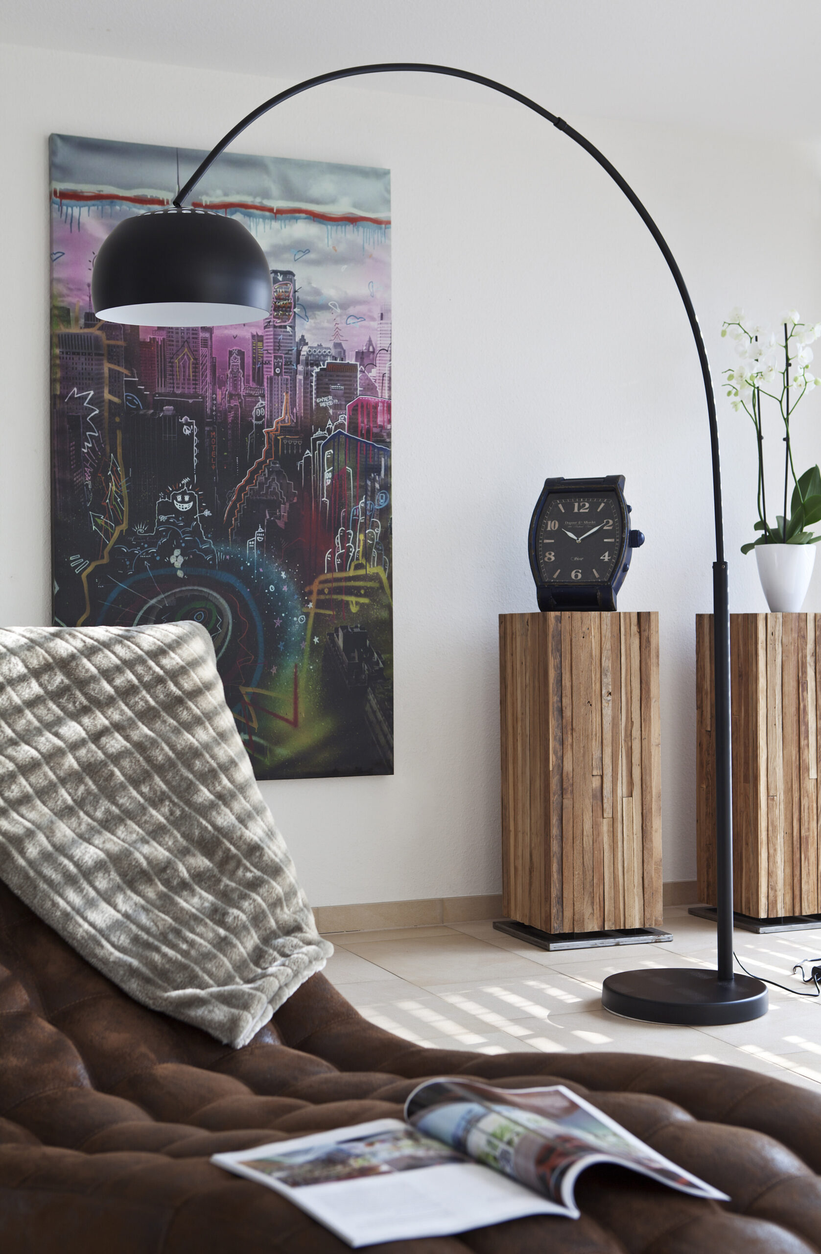De booglamp staat voor verfijnd lounge design in de stijl van de jaren 60 en 70. De royale lampenkap heeft een diameter van 33 cm. Terwijl de lampenkap en de boog van metaal zijn, is de zware en tegelijk mooie voet van marmer en te vinden onder een zwart gelakte plaat. Dit ziet er niet alleen extravagant uit, maar biedt de vloerlamp ook een enorme stabiliteit. De lamp wordt handig in- of uitgeschakeld via een voetschakelaar. Dankzij de gebogen vorm kan de booglamp in elke lees- of tv-hoek worden geïntegreerd. Het aangenaam warme licht en de meegeleverde dimschakelaar zorgen voor een gezellige sfeer in elke kamer.