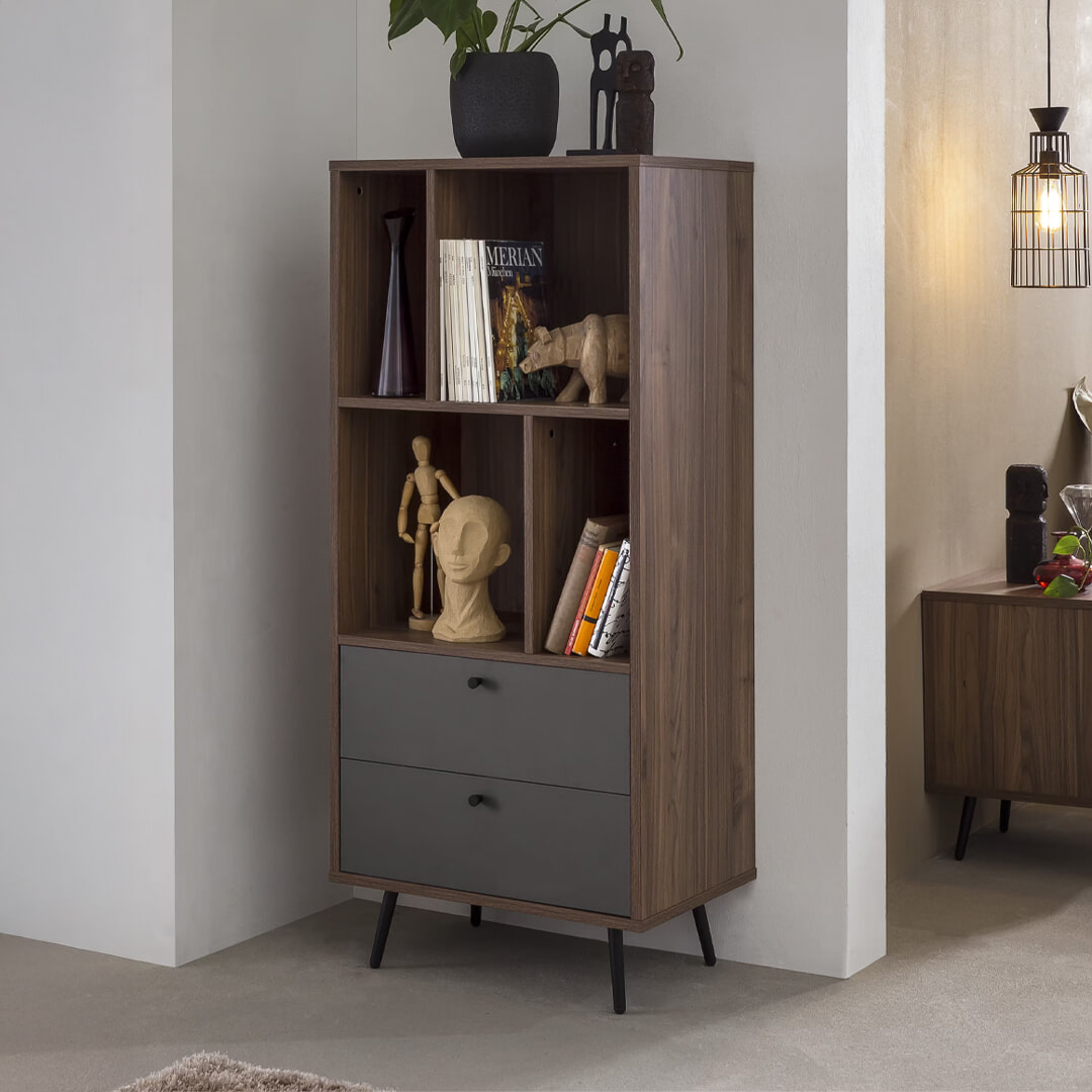 Het lineaire ontwerp van deze boekenkast combineert walnootkleurig en grijs MDF-hout met mat zwart gelakte metalen poten. Met vier vakken en twee laden biedt de 138 cm hoge boekenkast veel open en gesloten opbergruimte voor allerlei spullen. De poten van matzwart metaal zorgen voor een stevige stand. De vier open vakken hebben een asymmetrisch ontwerp en passen daarmee helemaal bij de trend. Gebruik hem in je woonkamer met je favoriete boeken en decoratieve voorwerpen. Dit chique meubel kan met zijn minimalistische stijl in alle woonruimtes worden geïntegreerd en blijft toch een blikvanger. De boekenkast is gewoon de ideale aanvulling op je interieur!