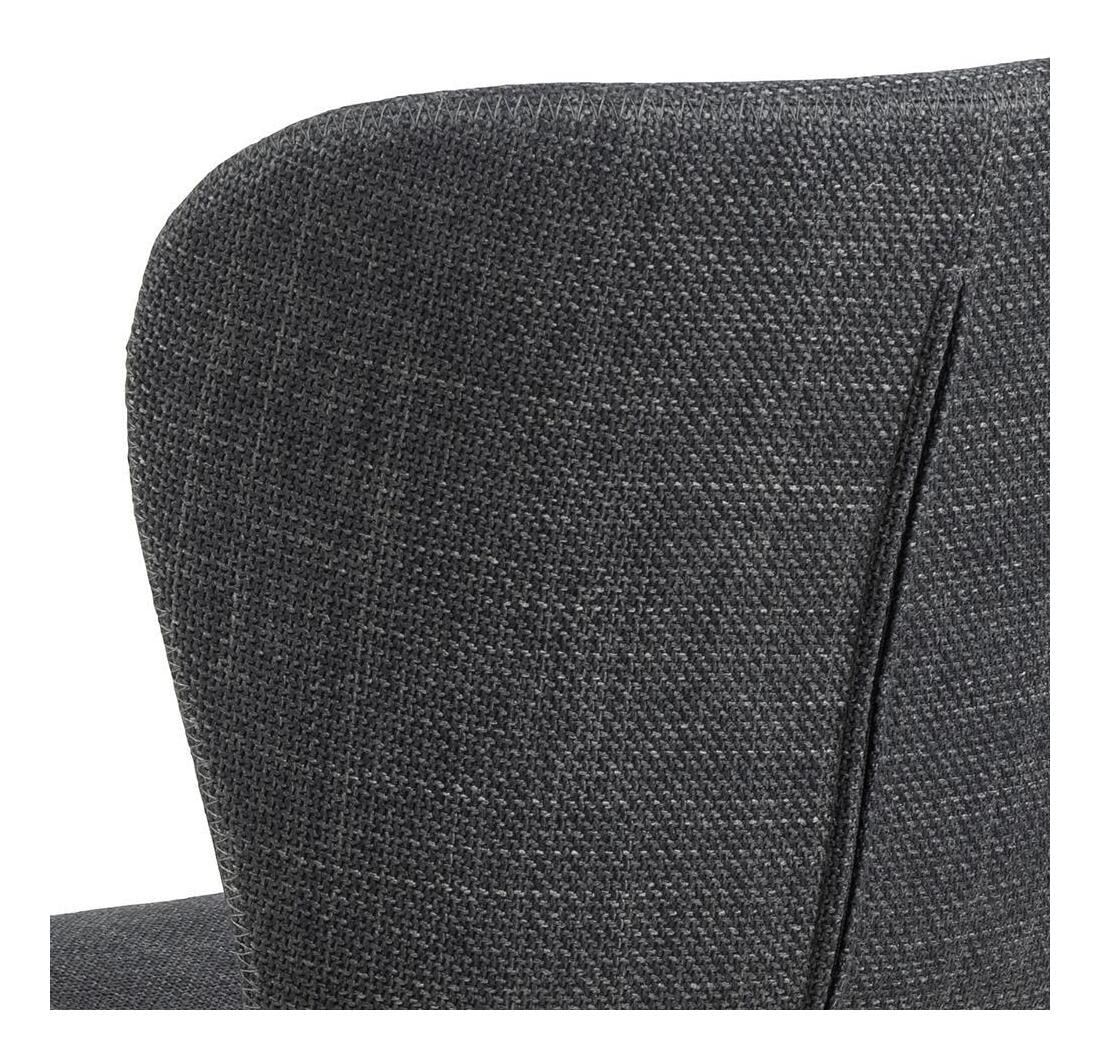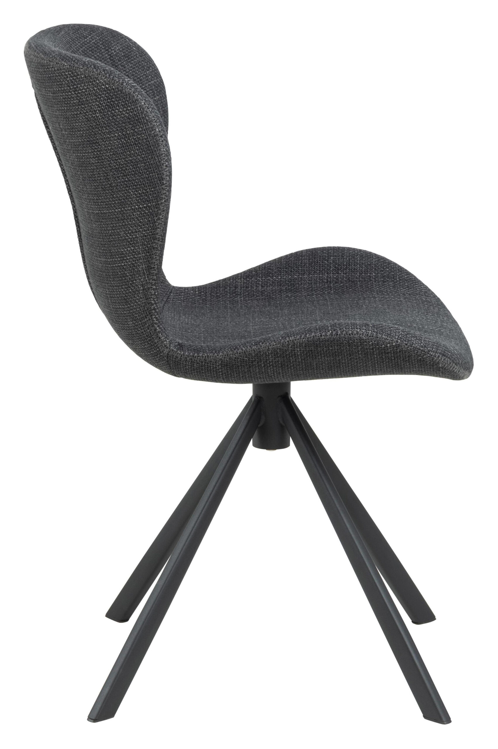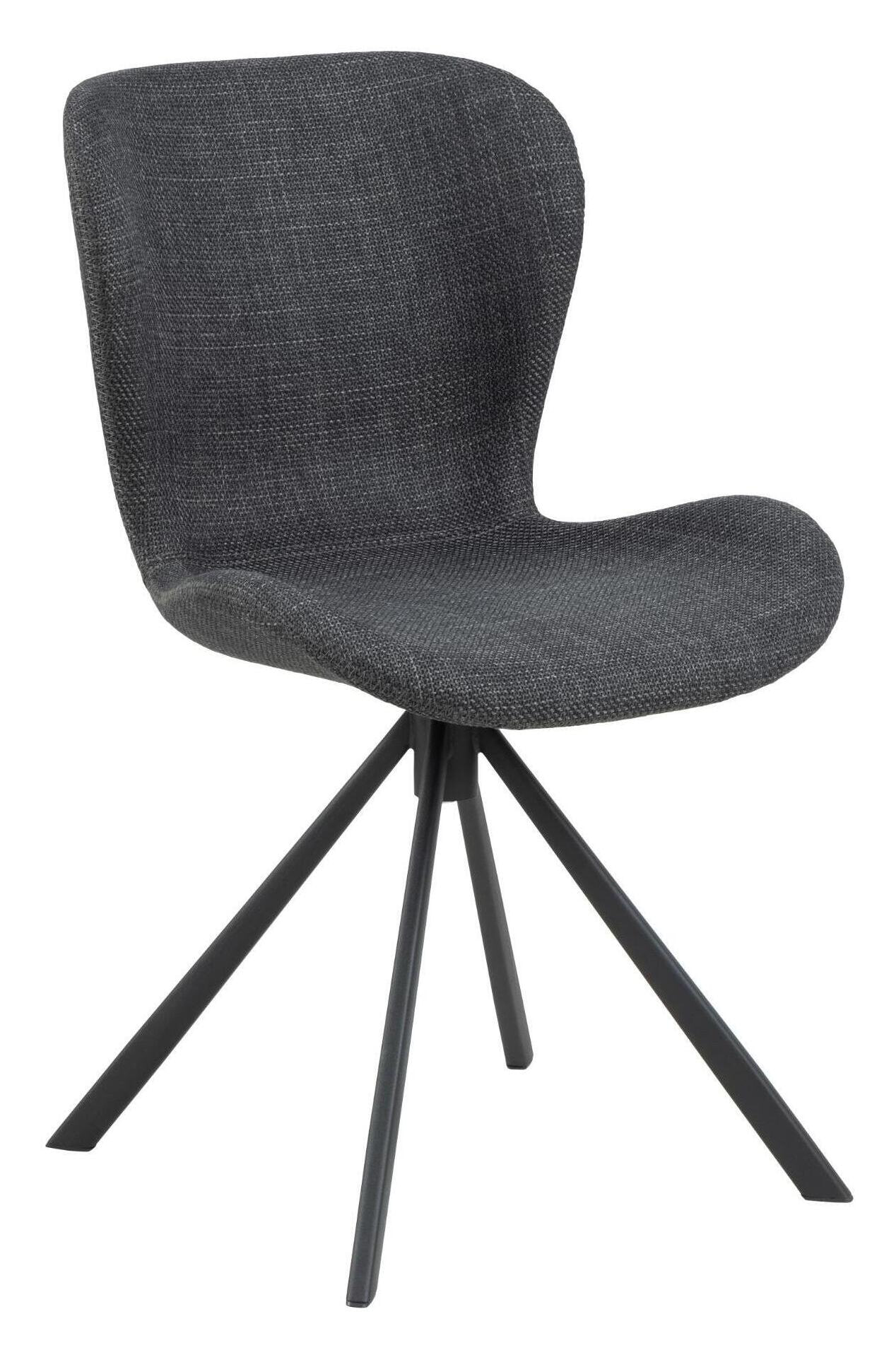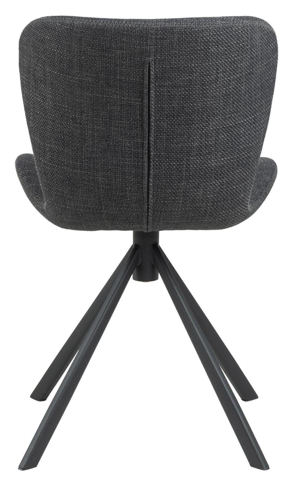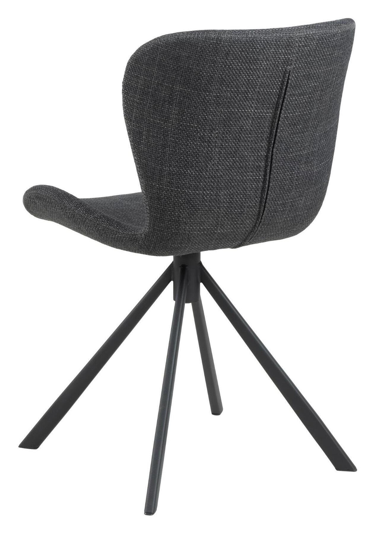 Zitten in deze eetkamerstoel voelt bijna te mooi om waar te zijn. Voor een comfortabele ervaring is de stoel ontworpen met een organisch gevormde zitting met een omarmende rugleuning. Hij is bekleed met een gestructureerde stof met een tweekleurig effect in donkergrijs, wat goed past bij het zwarte 4-sterren metalen onderstel. Het onderstel heeft een draaifunctie om het moderne karakter te benadrukken.