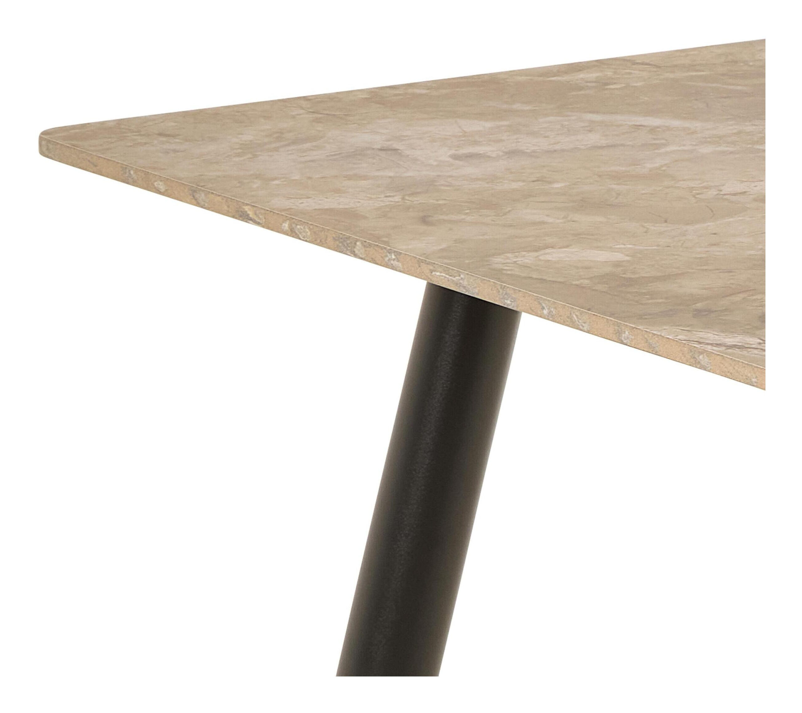 Deze minimalistische eettafel is ontworpen met duurzame materialen, waardoor hij ideaal is voor dagelijks gebruik. Het rechthoekige tafelblad is gemaakt van zwart keramiek met subtiele aderen, een materiaal dat bekend staat om zijn hitte- en krasbestendige eigenschappen. Voor een evenwichtige look is hij afgewerkt met kegelvormige poten van zwart staal. Hij biedt comfortabel plaats aan 4 personen.