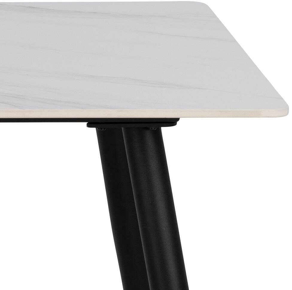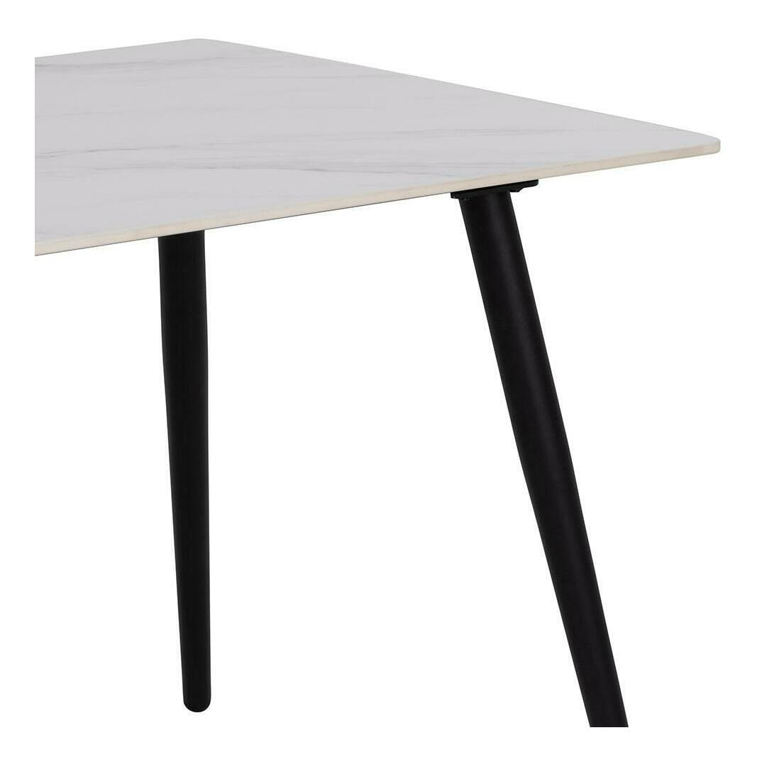 Deze minimalistische eettafel is ontworpen met duurzame materialen, waardoor hij ideaal is voor dagelijks gebruik. Het rechthoekige tafelblad is gemaakt van zwart keramiek met subtiele aderen, een materiaal dat bekend staat om zijn hitte- en krasbestendige eigenschappen. Voor een evenwichtige look is hij afgewerkt met kegelvormige poten van zwart staal. Hij biedt comfortabel plaats aan 4 personen.