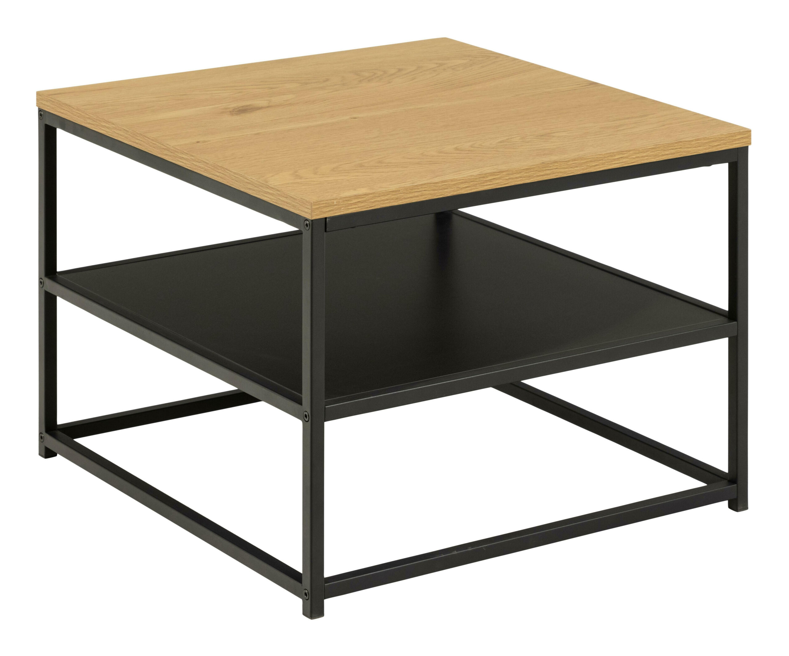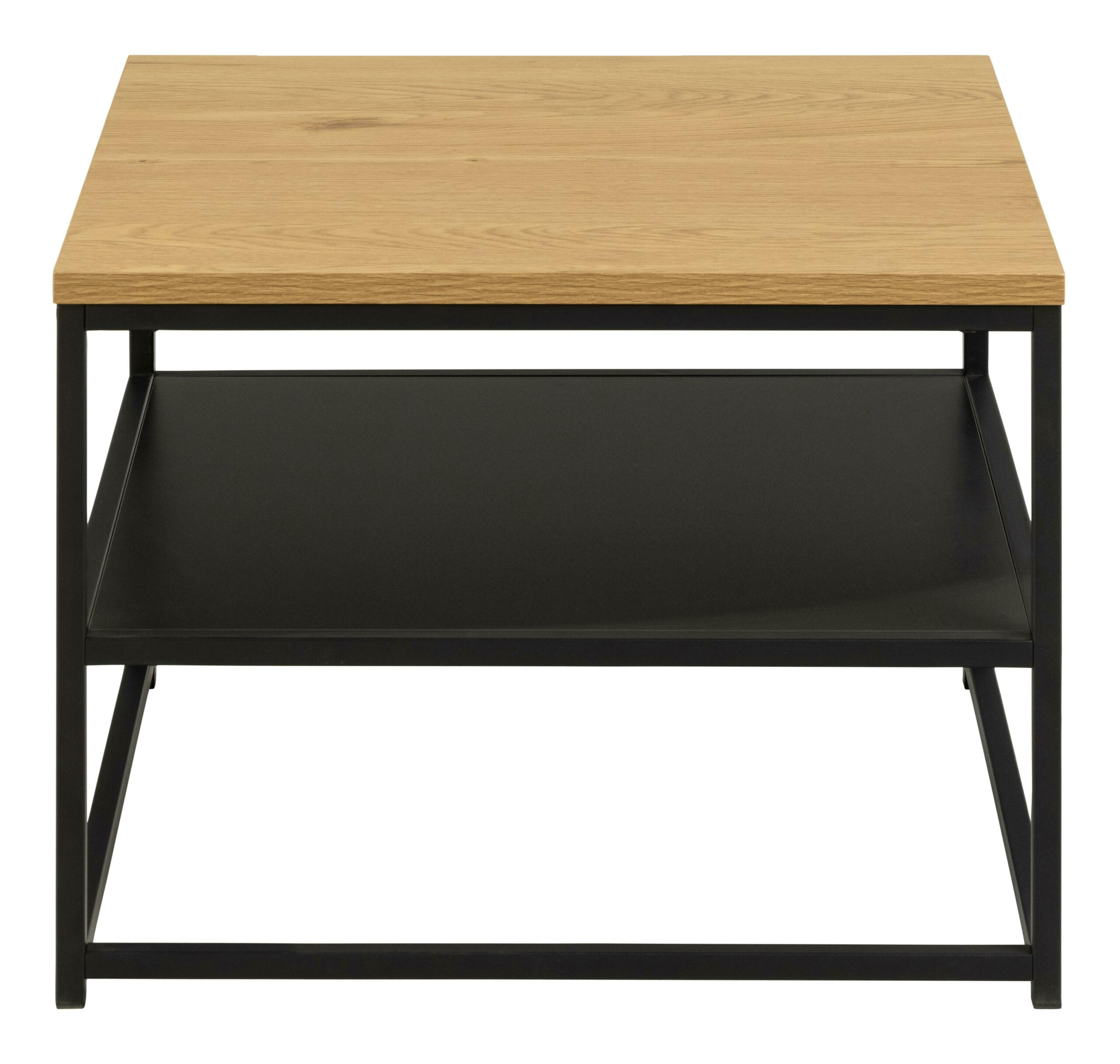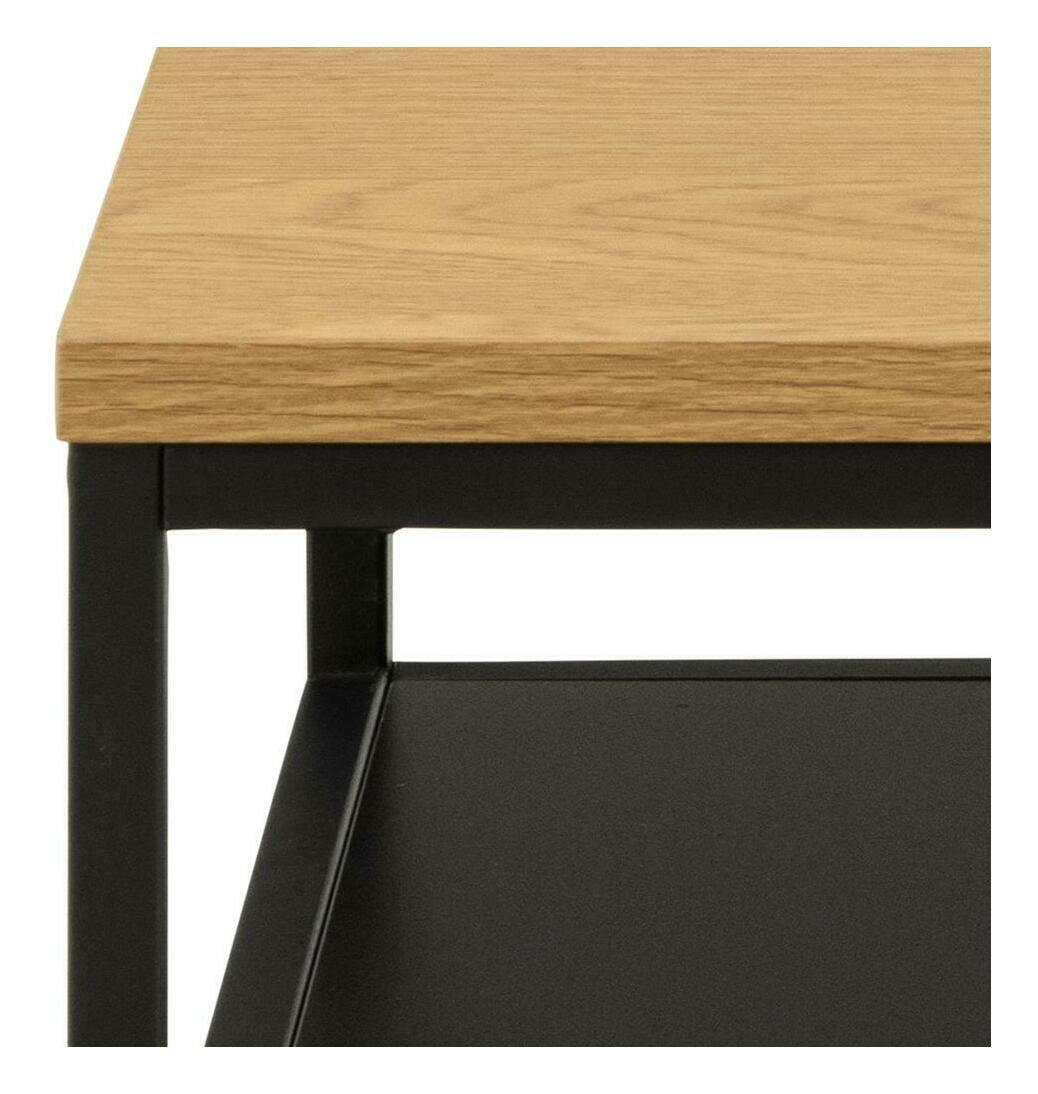 Een moderne, chique en praktische salontafel? Je hebt het. Door het melamine tafelblad is de tafel gemakkelijk schoon te vegen. De combinatie van wild eiken melamine en zwart metalen onderstel geeft de tafel een krachtige uitstraling. Het vierkante metalen onderstel zorgt ook voor stevigheid. Gebruik de plank als een plek voor kleine opslag, zoals tijdschriften, een afstandsbediening voor de tv, maar ook bits en bobs.