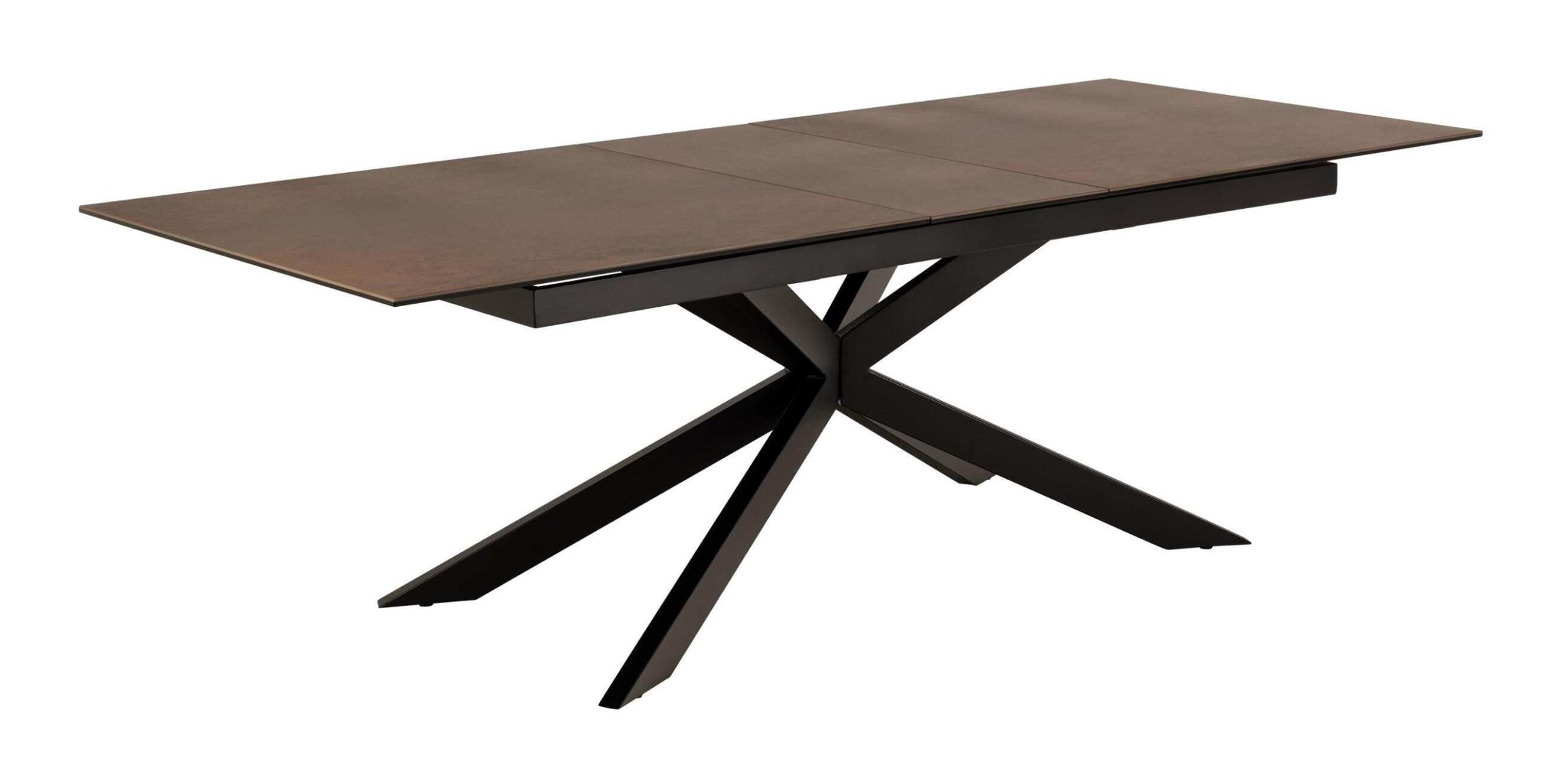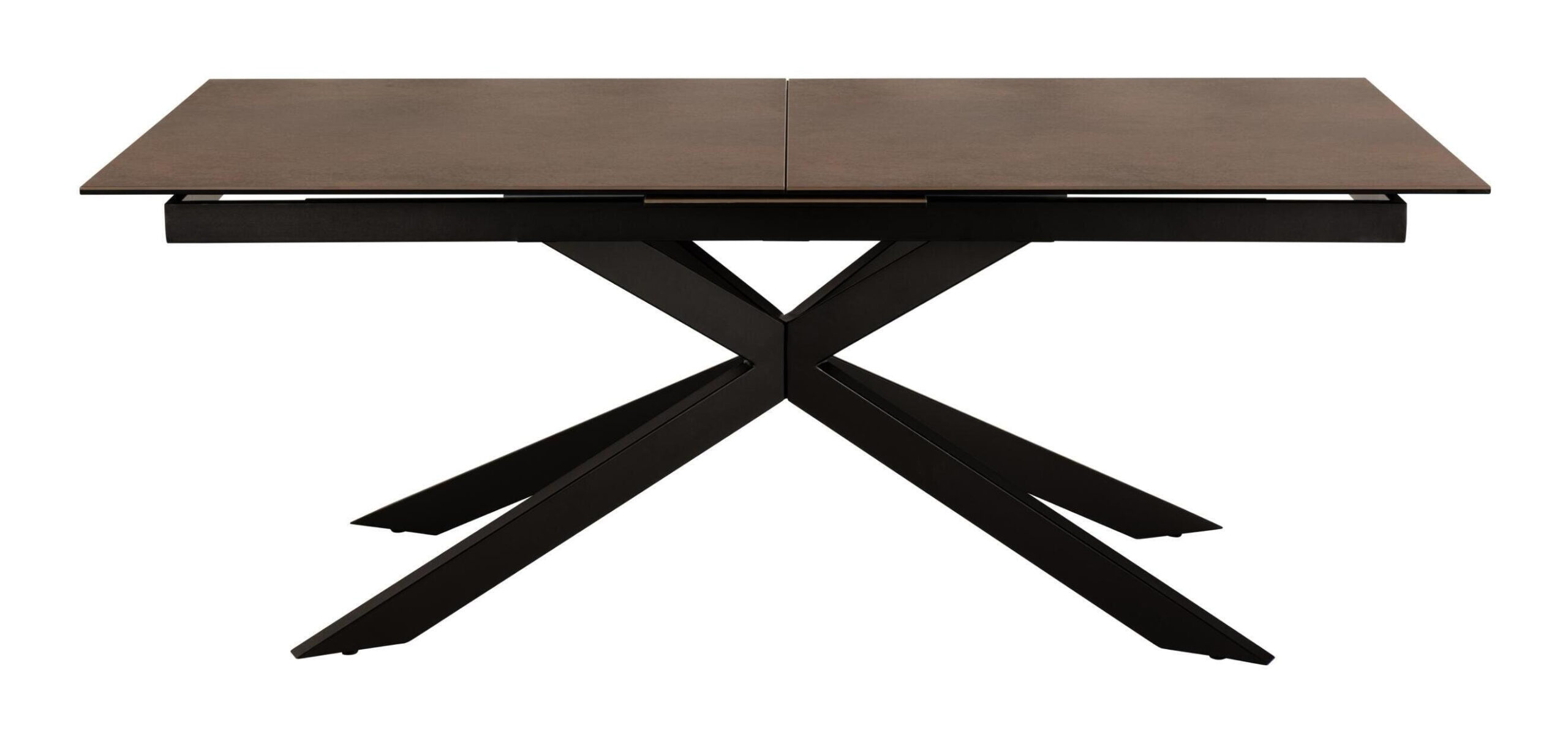 Kijk eens naar dat roestbruine tafelblad van keramiek dat een industriële uitstraling geeft. De tafel kan eenvoudig worden verlengd dankzij de synchrone verlenging. Trek zachtjes aan het uiteinde van de tafel en het bijpassende verlengstuk verschijnt in het midden. De look wordt afgemaakt met het kruisvormige zwarte onderstel dat zo is geplaatst dat je comfortabel rond de tafel kunt zitten.