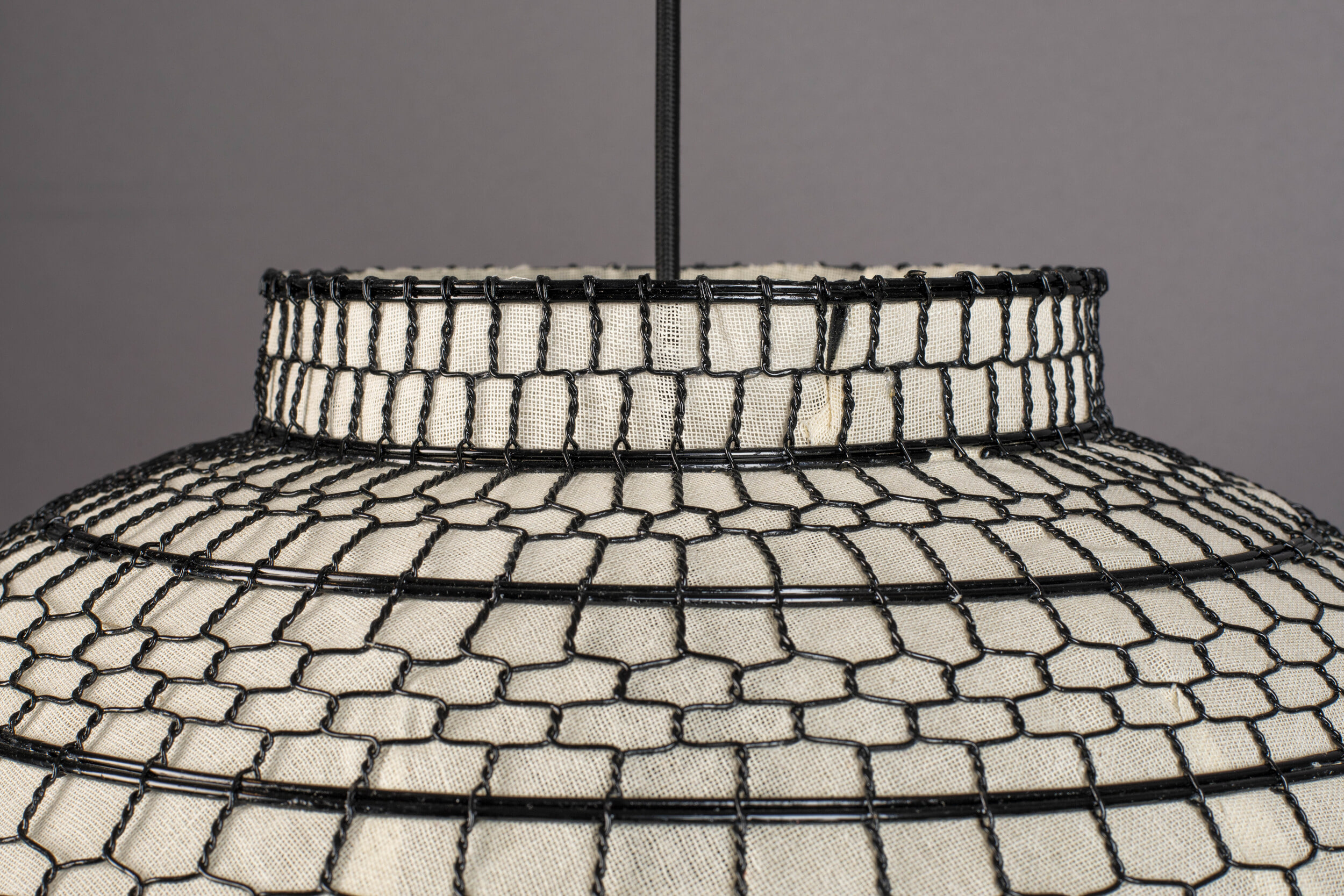 - Materiaal: Zwart ijzeren kap met witte linnen stof, zwart stoffen kabel