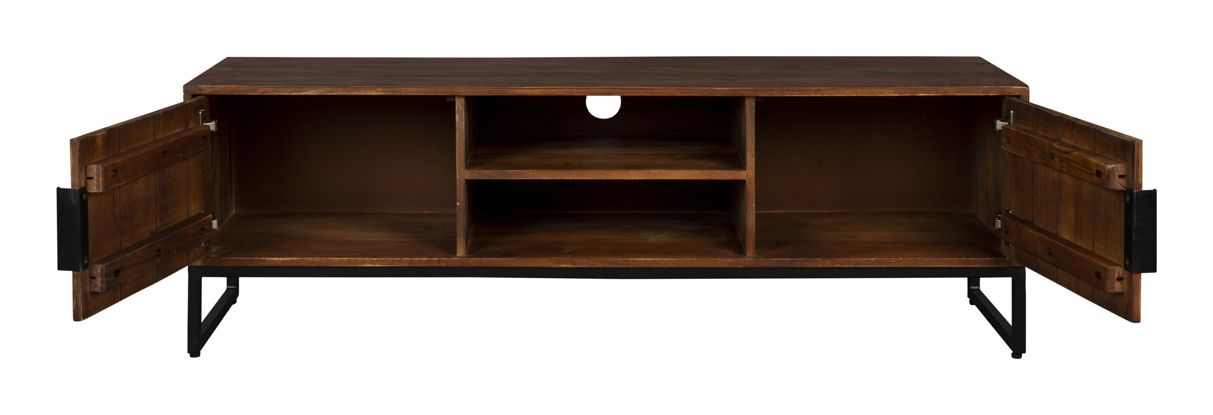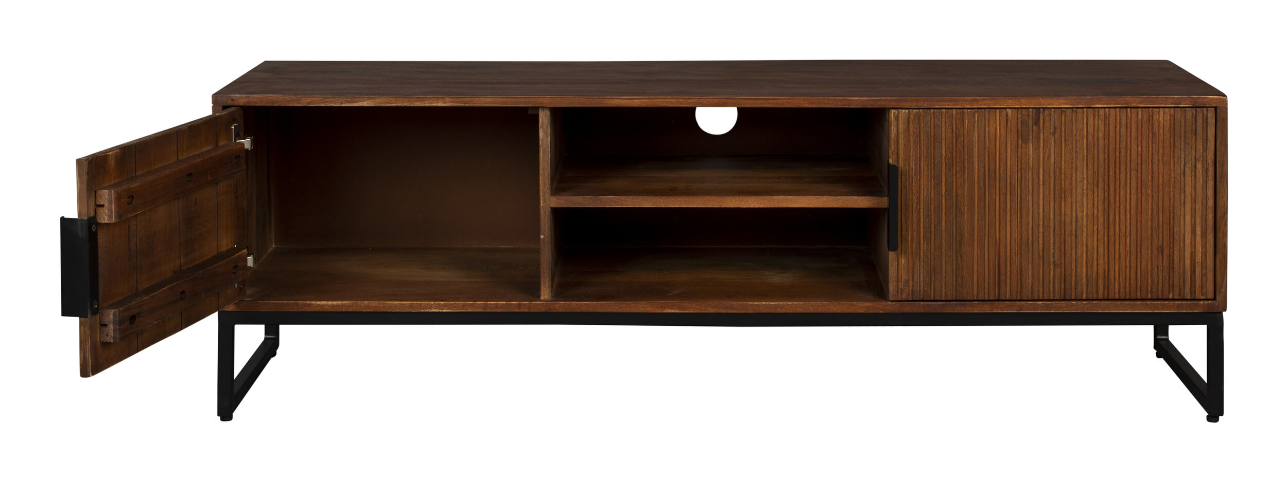 TV-meubel ‘Saroo’ is een prachtige mix van retro charme en modern design. Gemaakt van massief mangohout, straalt dit meubel warmte en karakter uit. De subtiele latjes in het hout en de matzwarte stalen details geven Saroo een vintage uitstraling die perfect past in een retro interieur.