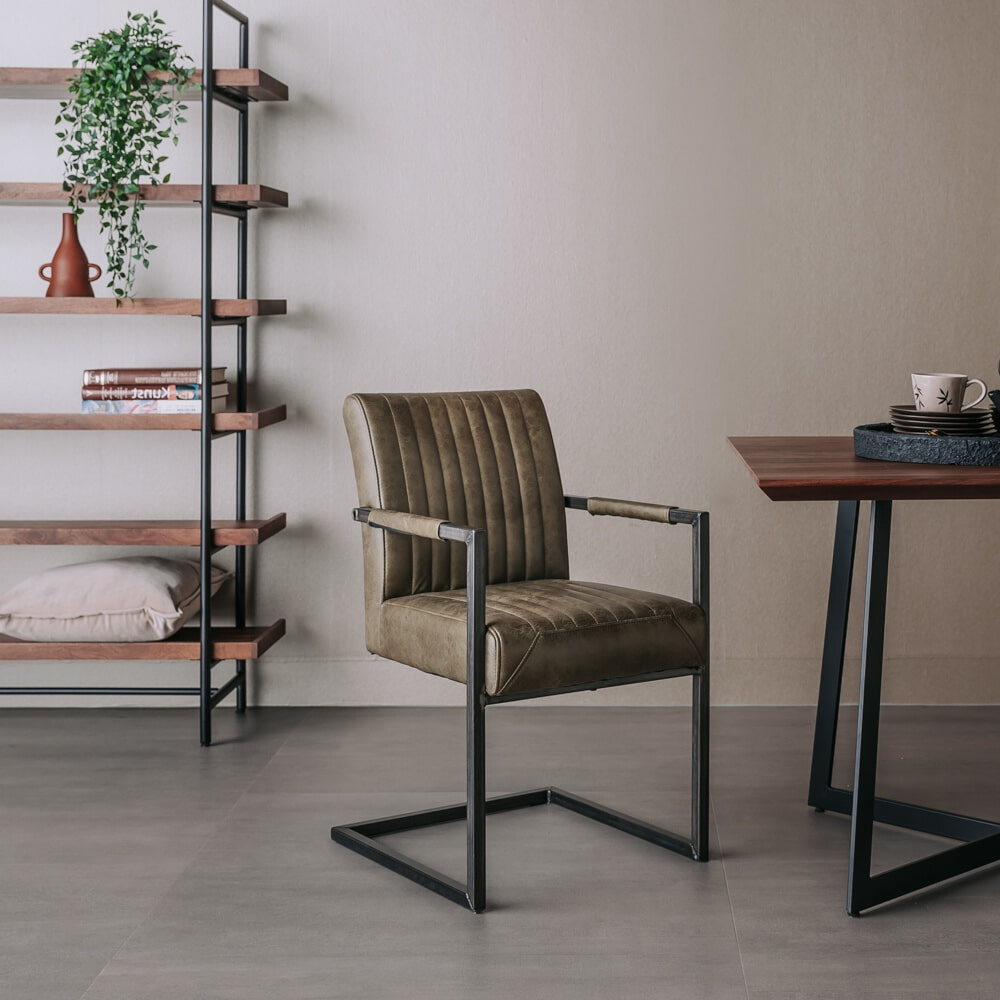 De stoel heeft een mooie lederlook zitting en de verticale stiksels geven het geheel een bijzondere en speelse look. Het kunstleder op de stoel is makkelijk schoon te houden. Haal er een vochtig doekje overheen en je stoel is weer als nieuw. Het metalen onderstel is gemaakt van vintage afgewerkt staal en de armleggers zijn bekleed met het hoogwaardige kunstleder. Zo zit je urenlang comfortabel op deze stoel.
