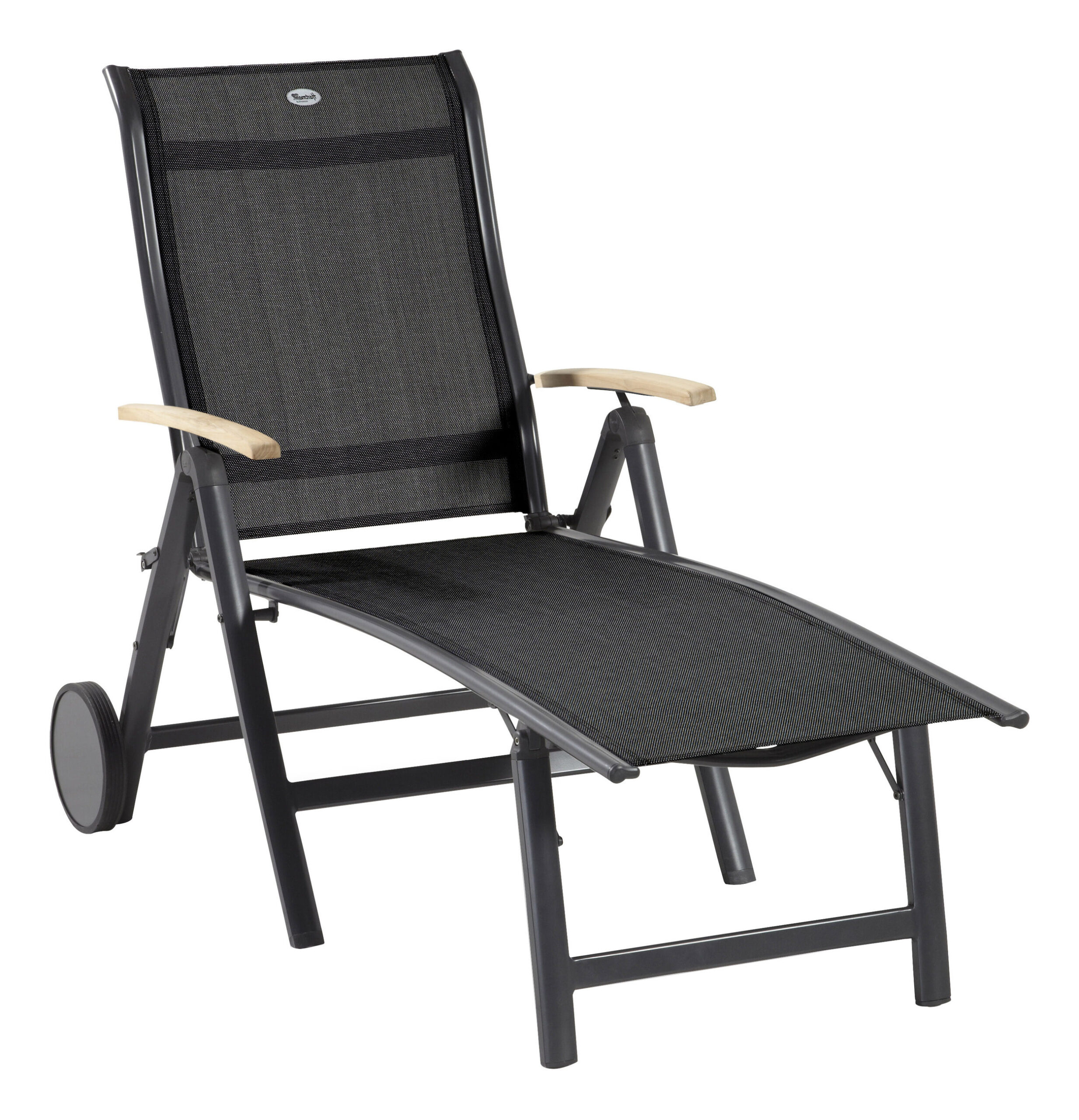 - Materiaal: Aluminium, textileen en teakhouten armleuning