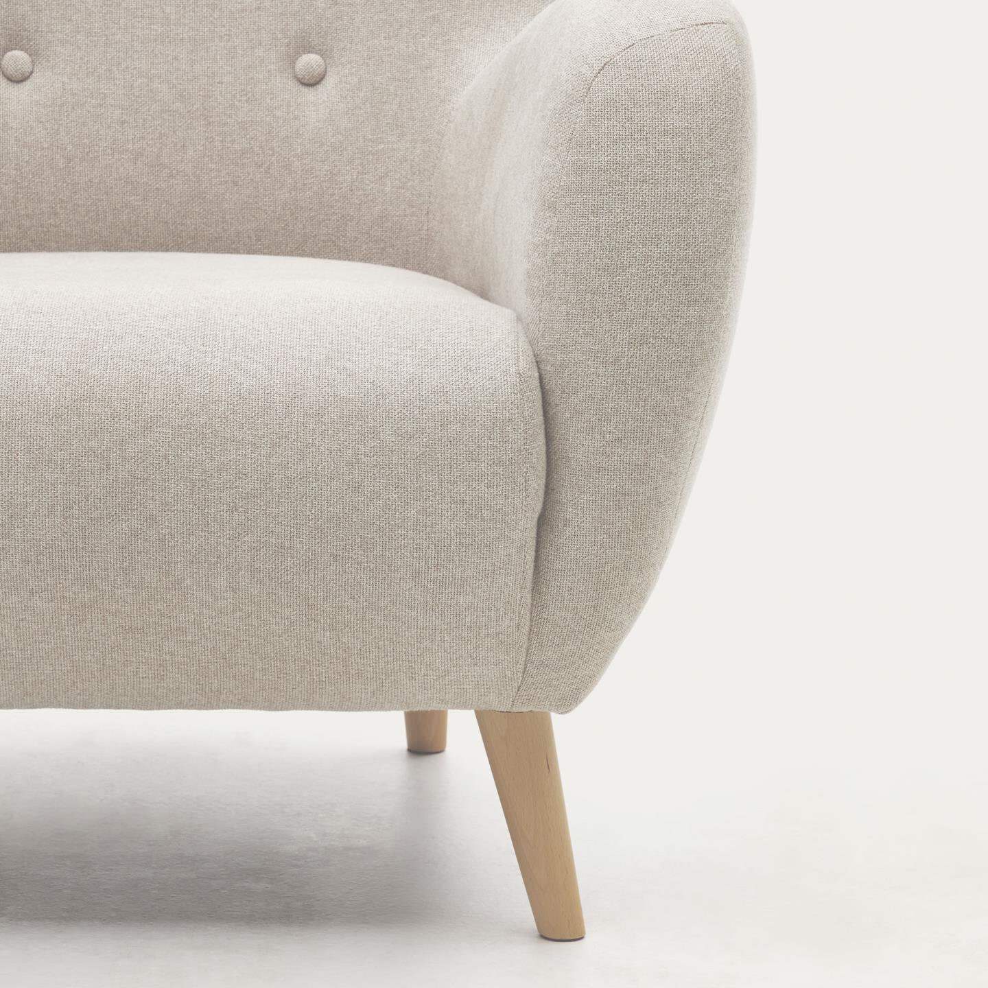 • Fauteuil bekleed met beige structuurstof. Poten van massief beukenhout.