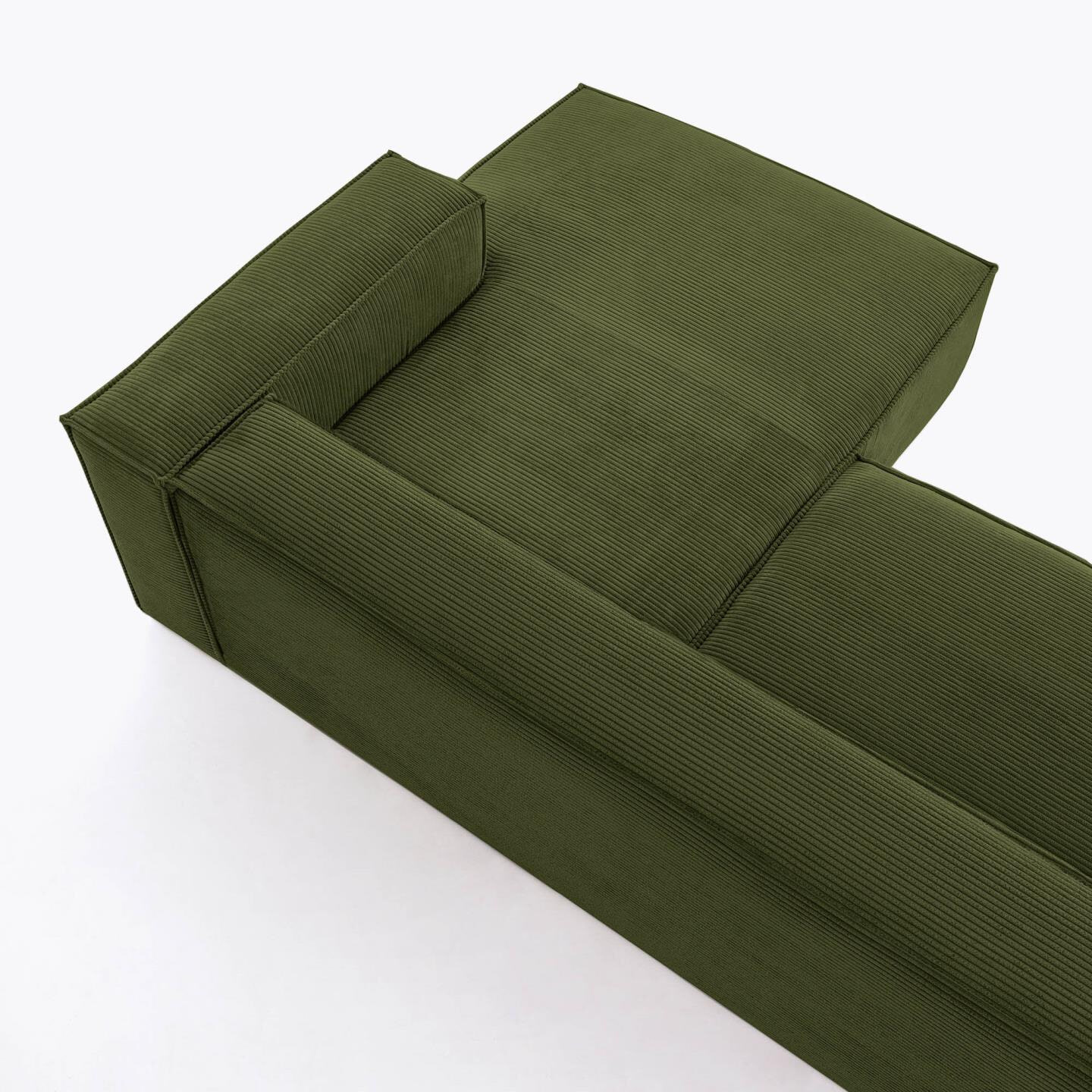 - 2-zitsbank met chaise longue bekleed met dik ribfluweel dat zeer zacht aanvoelt en een hoge weerstand heeft.