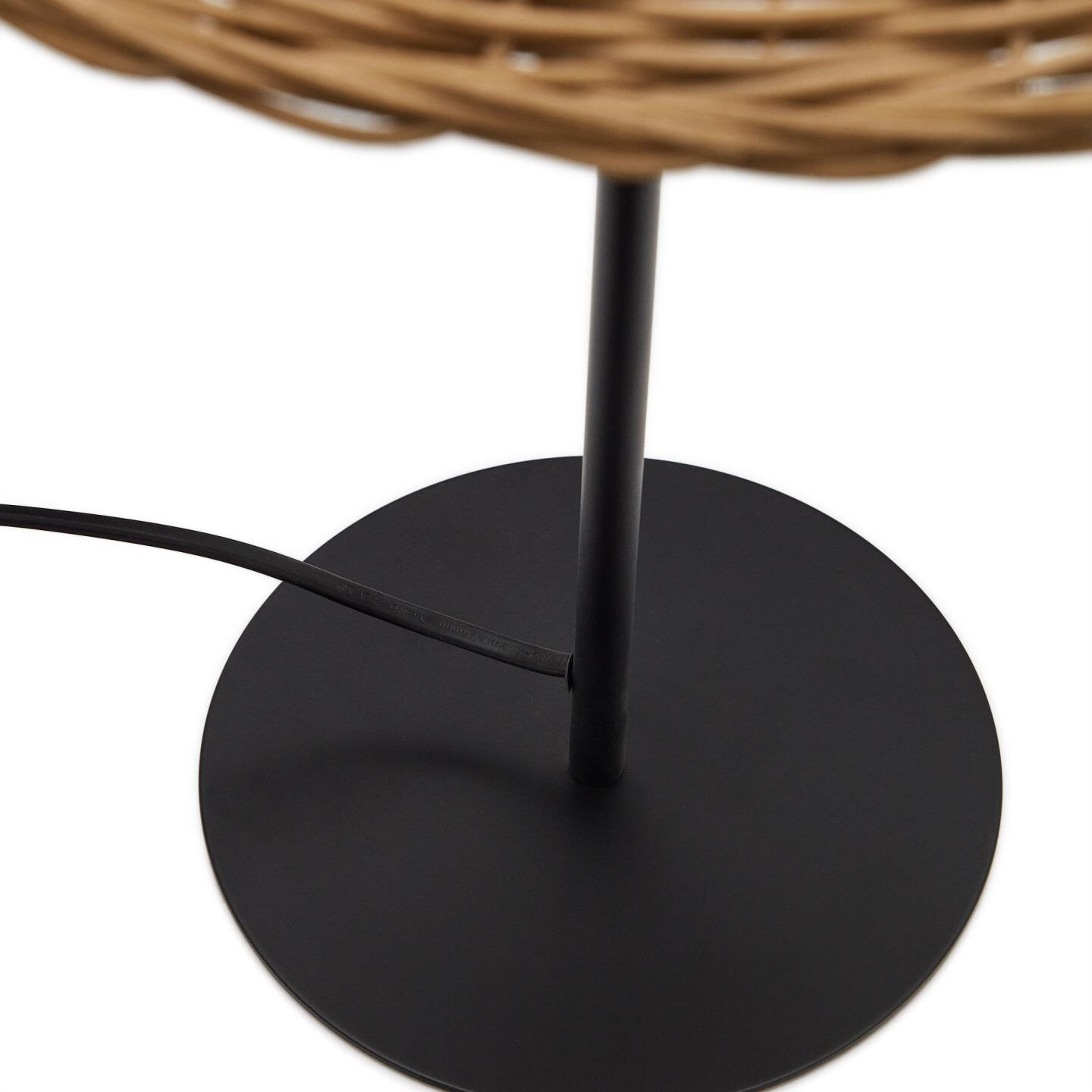 - Metalen tafellamp met zwarte afwerking en natuurlijke rotan lampenkap.