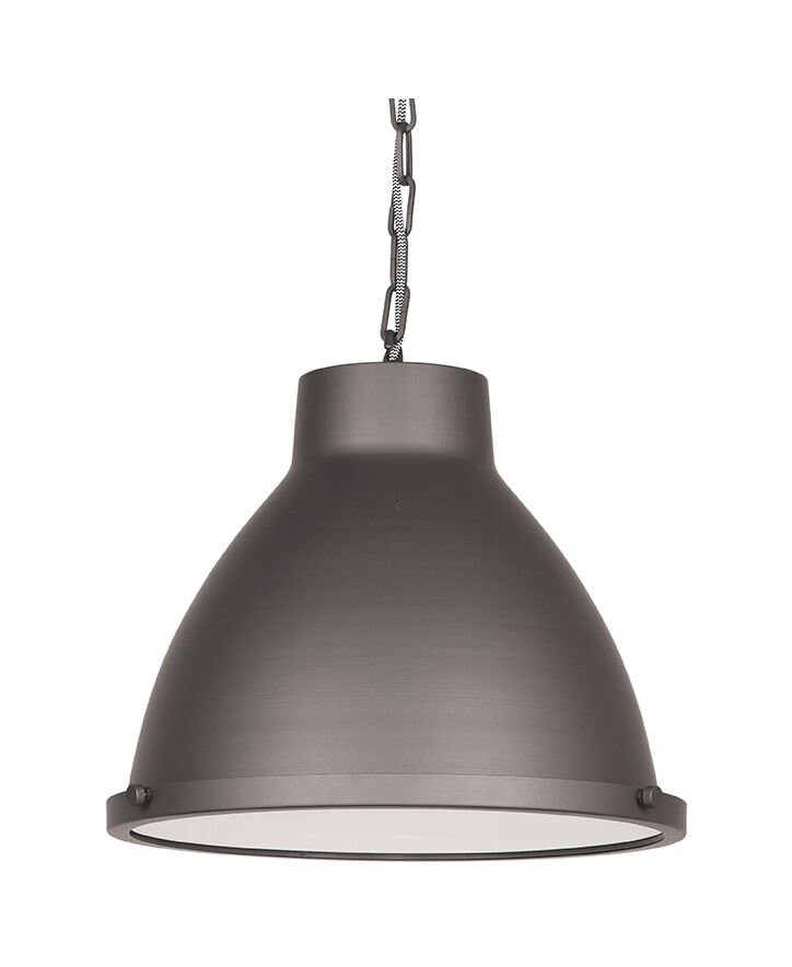 Hanglamp Industry bestaat uit een grote rondvormige kap die licht spits toeloopt. De kap is gemaakt van fijn afgewerkt metaal en uitgevoerd in de kleur burned steel. Hanglamp Industry is in het bezit van zeer fraaie details. Industry heeft een luxe glasplaat, voorzien van robuuste bouten. Deze glasplaat zorgt voor een luxe uitstraling en een mooie lichtspreiding wat zorgt voor extra sfeer.