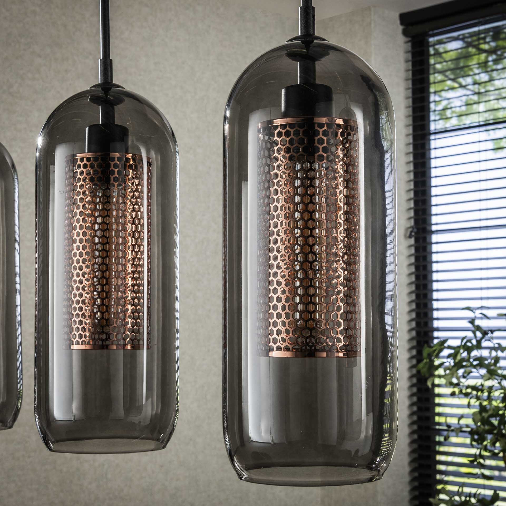 Deze hanglamp heeft vier mondgeblazen smoke glas kappen. Binnen deze kappen zitten vier cilindervormige koper mesh kappen verwerkt. Deze combinatie zorgt voor een trendy en chique uitstraling. Daarnaast wordt hierdoor het licht mooi gedoseerd door de ruimte verdeeld. De lamp is tot 150 cm in hoogte verstelbaar. Er wordt aanbevolen om LED lichtbron (8473) te gebruiken.