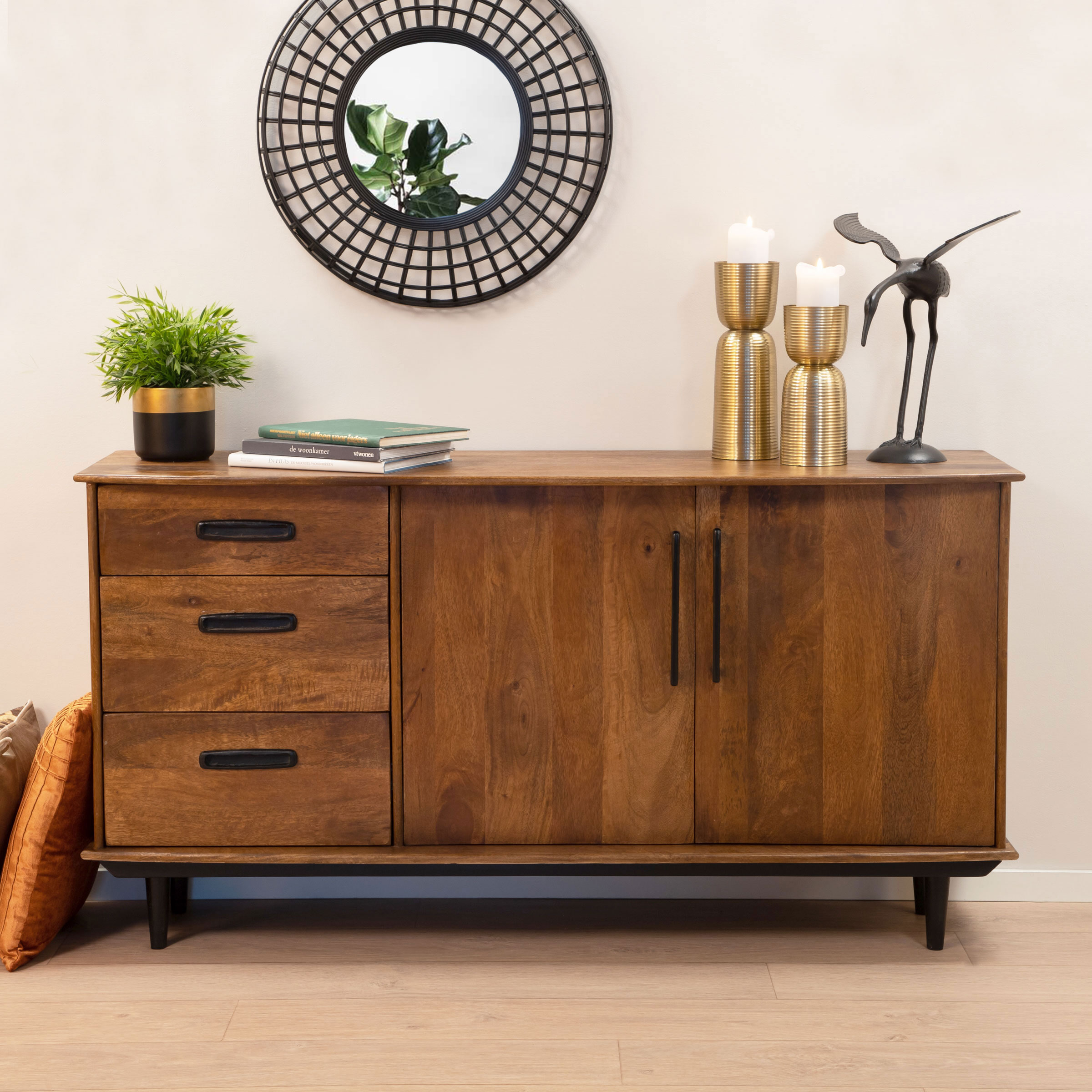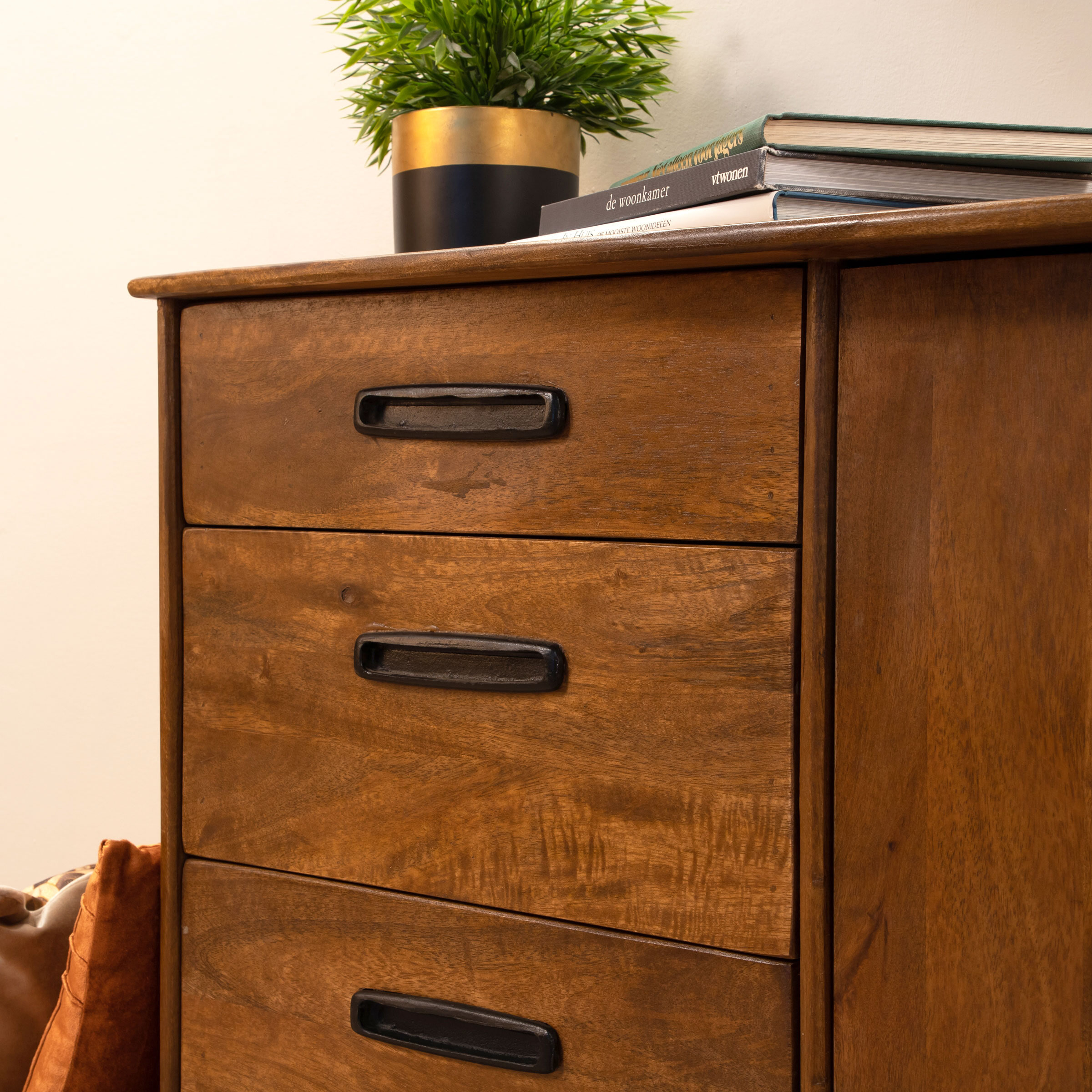 Ontdek de tijdloze elegantie van deze kast uit de Elias Collectie van Livingfurn, een stijlvolle collectie met meubels vervaardigd uit prachtig mangohout. Het licht-donker contrast, met zwarte accenten op onderstellen en handgrepen, geeft een eigentijdse uitstraling. De gladde afwerking van het mangohout zorgt voor een luxueuze look. Creëer een rustige leefomgeving door verschillende Elias items te combineren.