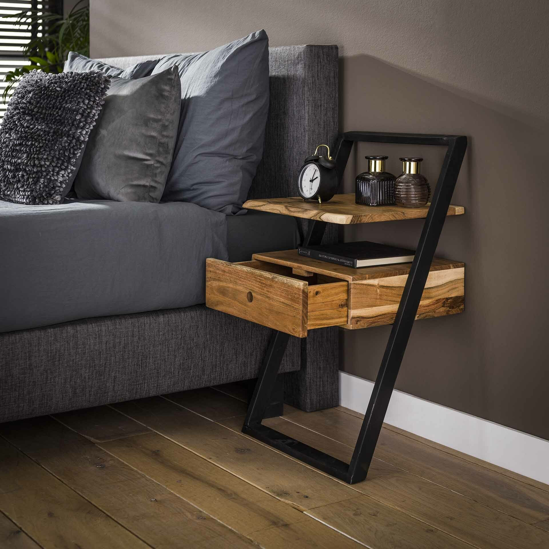 Dit trendy nachtkastje is uitgevoerd in acacia hout en gepoedercoat metaal. Het nachtkastje dient tegen de muur te staan en heeft 2 schroefgaatjes voor extra stevigheid. Dit nachtkastje is geschikt voor naast ieder bed!