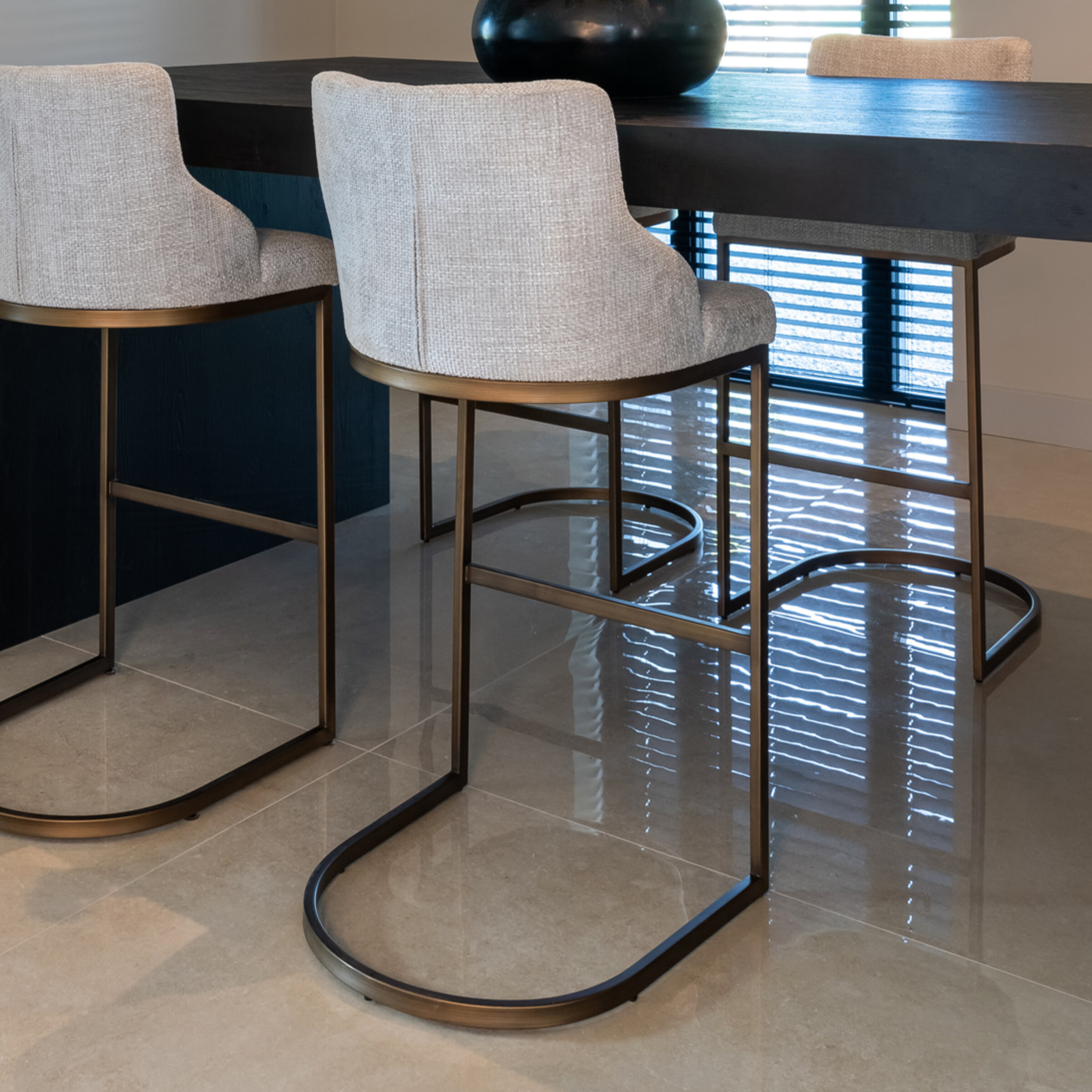 Het metalen onderstel is afgewerkt in een geborsteld gouden kleur. De combinatie van dit onderstel met de stof en kleur van de zitting maken van deze barstoel een waar plaatje. Dus zoek jij nog een of meerdere barstoelen voor in je keuken of eethoek, ga dan zeker voor ‘Bolton’ en geniet elke dag van deze prachtige stoel.