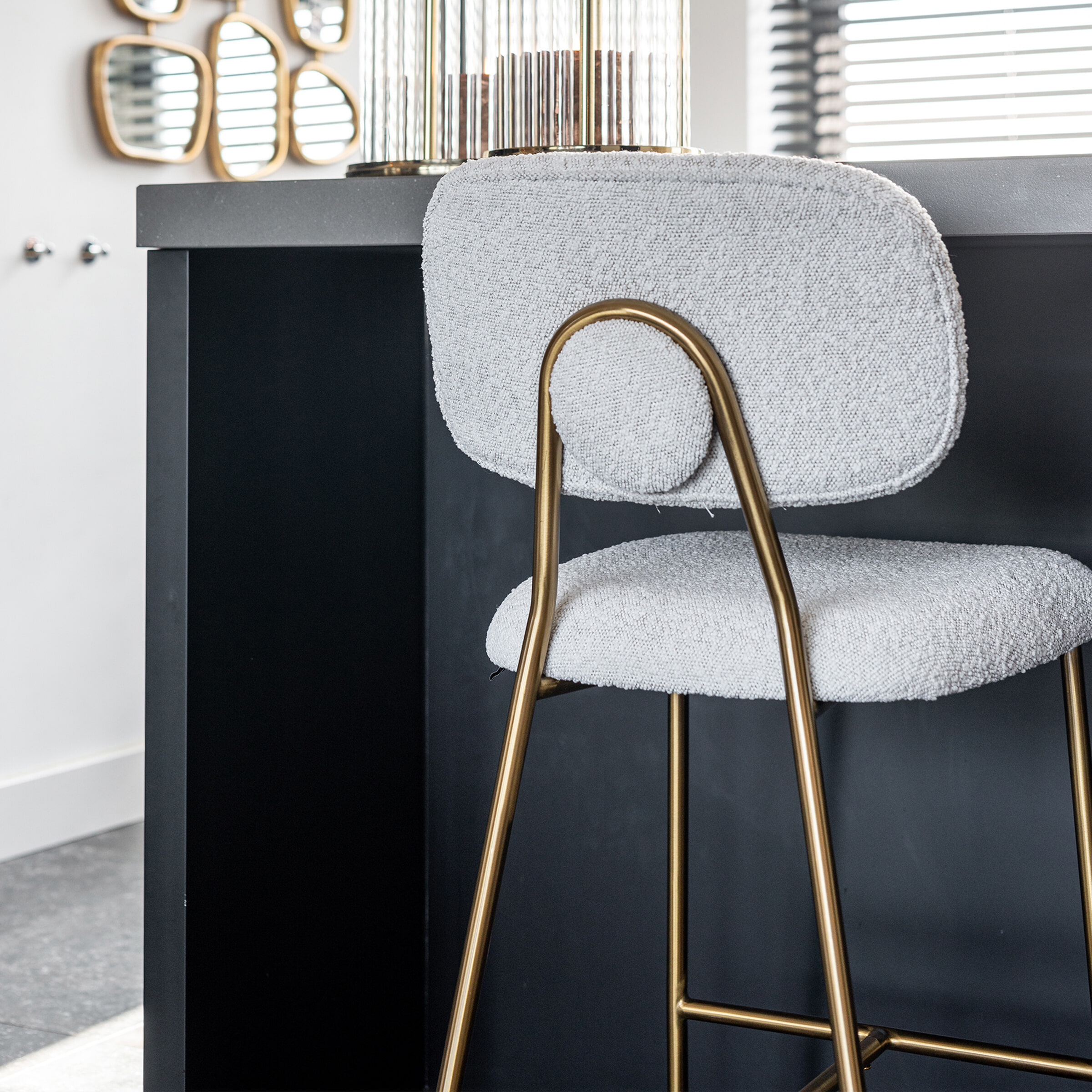 - Materiaal: RVS goud gecoat onderstel, zitting bekleed met luxe Bouclé 100% Polyester