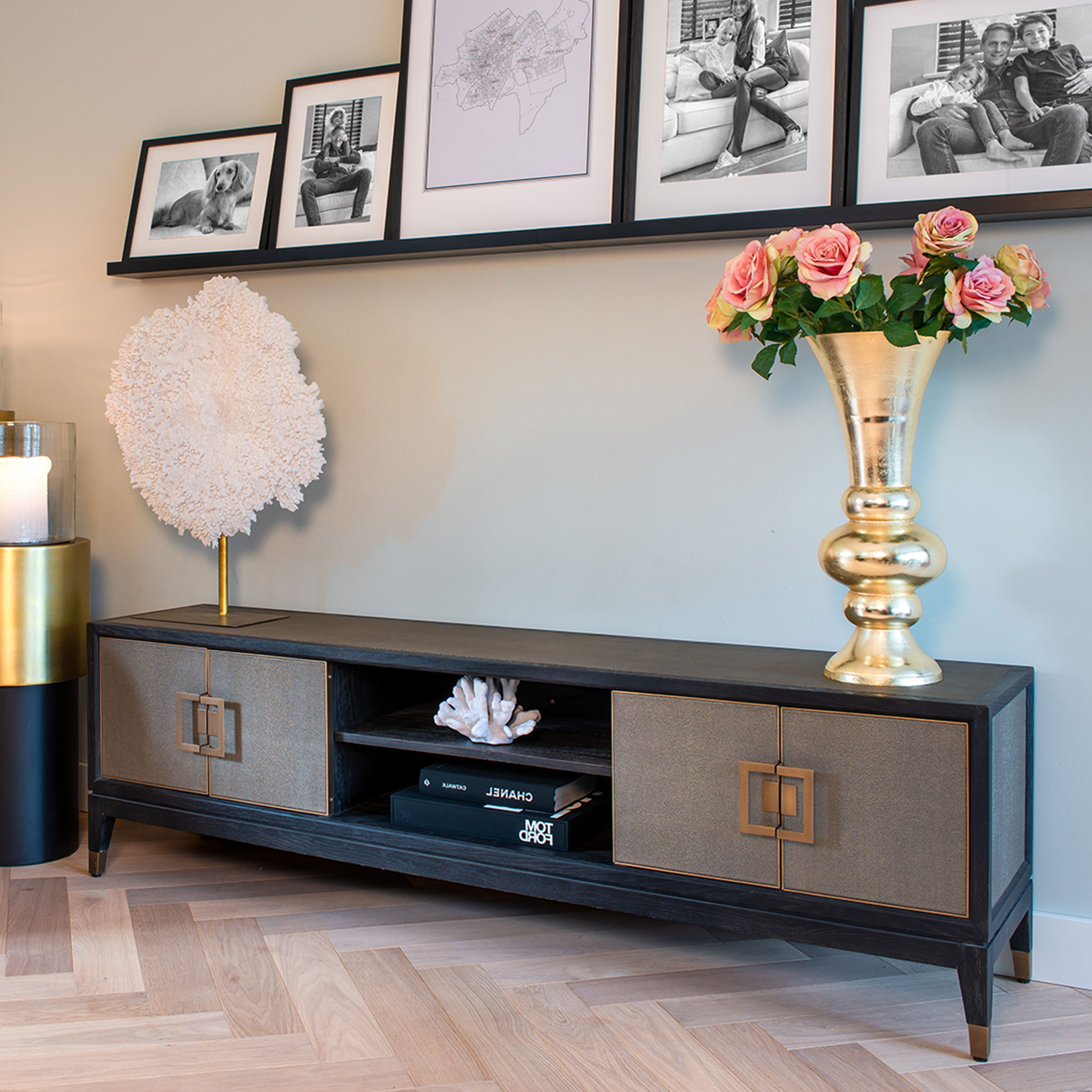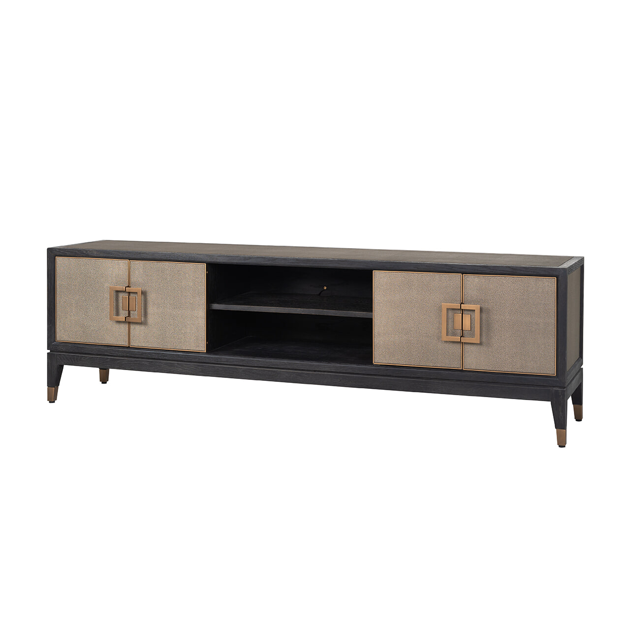 TV-dressoir Bloomingville heeft vier deuren en biedt genoeg opbergruimte voor al je spullen! De Bloomingville collectie is een verfijnde, luxe collectie gemaakt van segrijn / faux roggehuid van PU leer, zwart eiken en mat gouden details van metaal. Segrijn was populair in de Art Deco periode rond 1920 en geeft je moderne interieur een unieke touch!