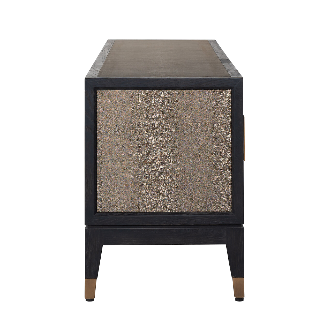 - Materiaal: Frame van Zwart Eikenhout, zij, boven en fronten bekleed met segrijn / faux roggehuid van PU-leder