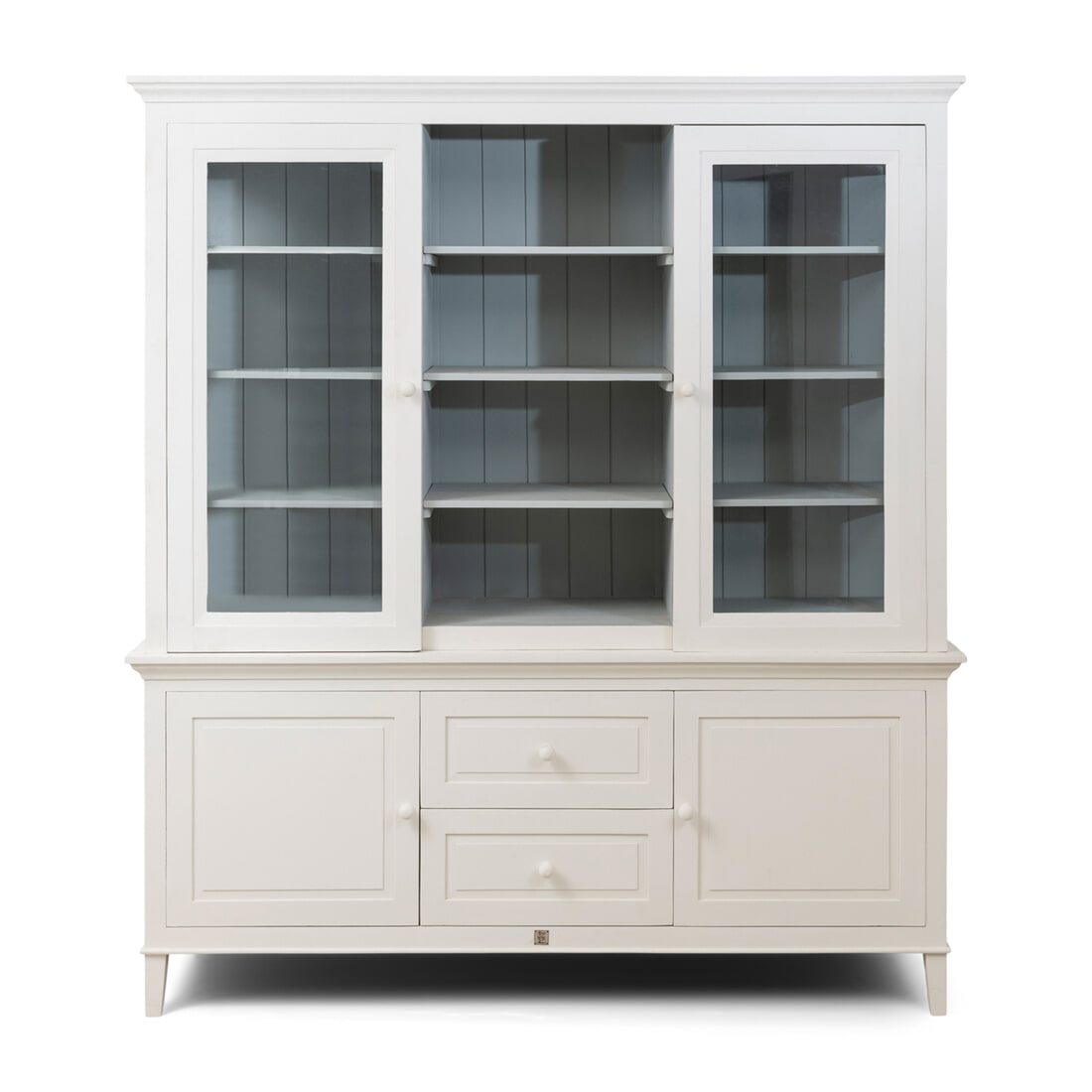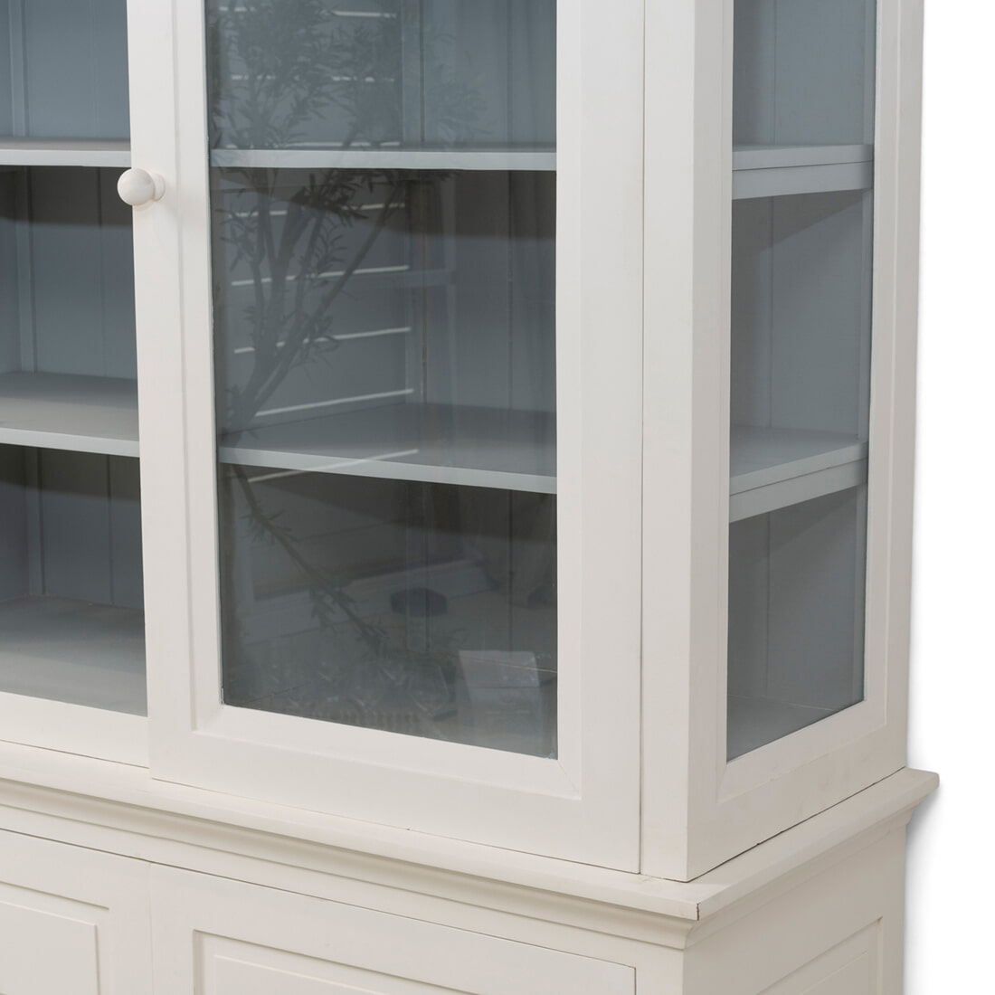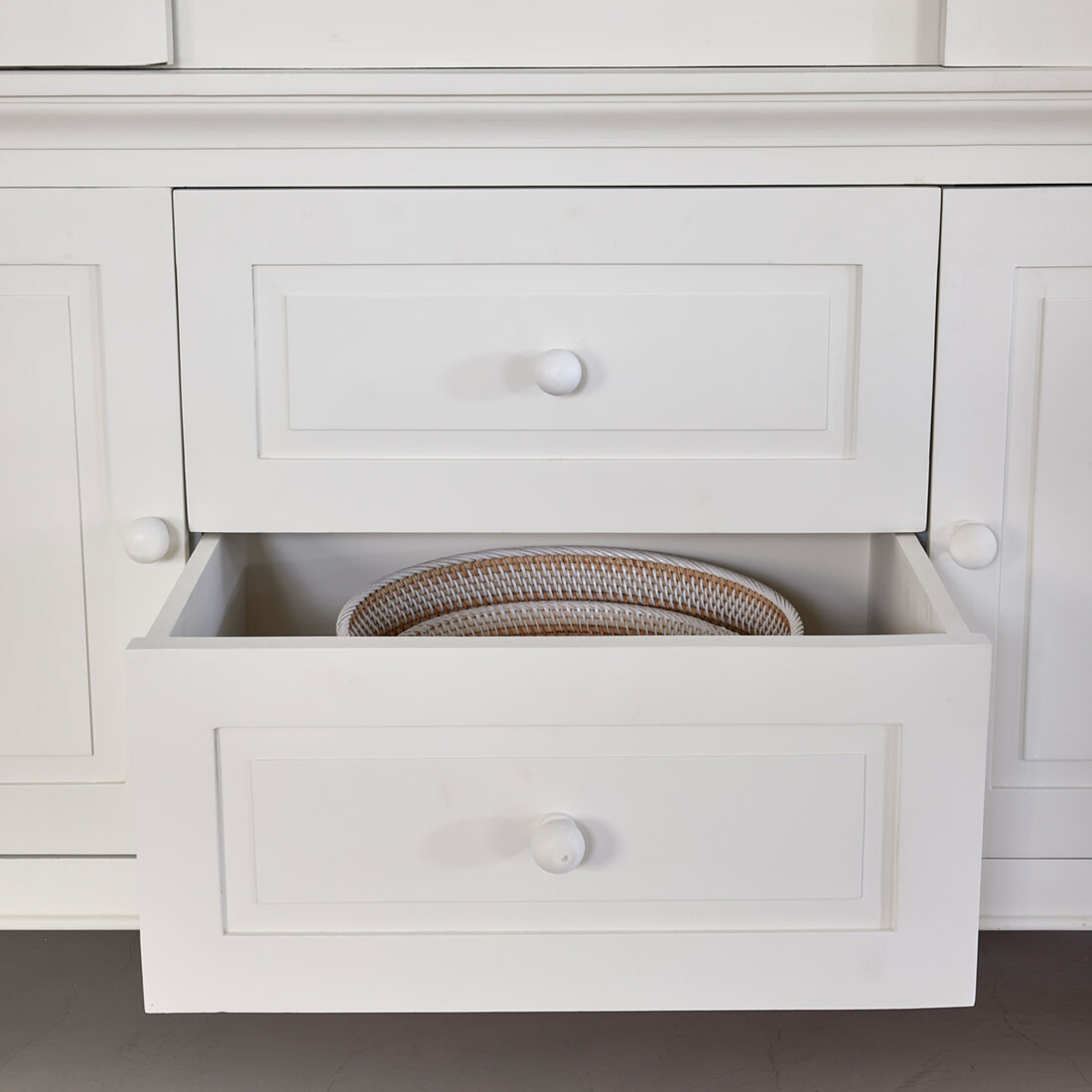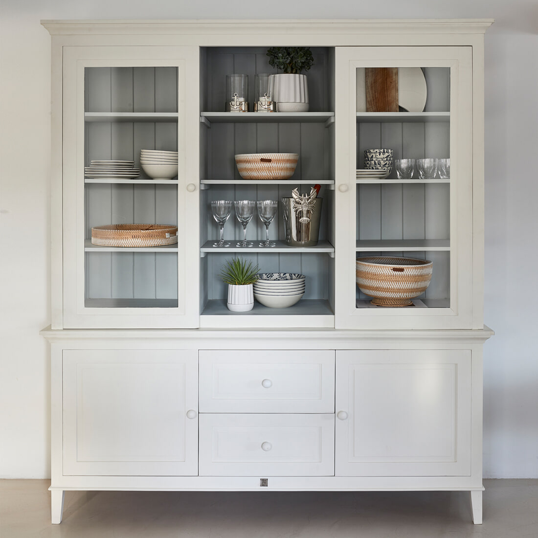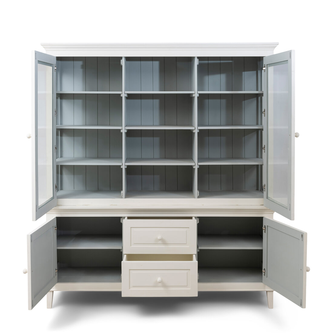 De Bedford Cabinet is nu ook in deze tweedelige XL-variant verkrijgbaar. Ook deze extra grote en brede buffetkast is gemaakt van mangohout en gecoat in twee kleuren: crème en grijs. In tegenstelling tot de smallere Bedford Cabinet is de XL-variant aan de binnenkant grijs en aan de buitenkant crèmekleurig. Dankzij de softclose deuren kun je deze altijd geruisloos openen en sluiten.