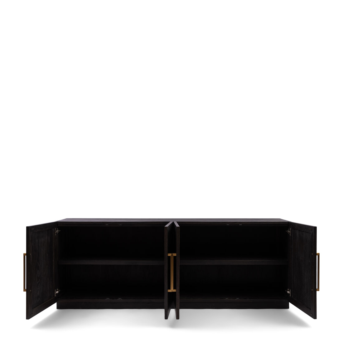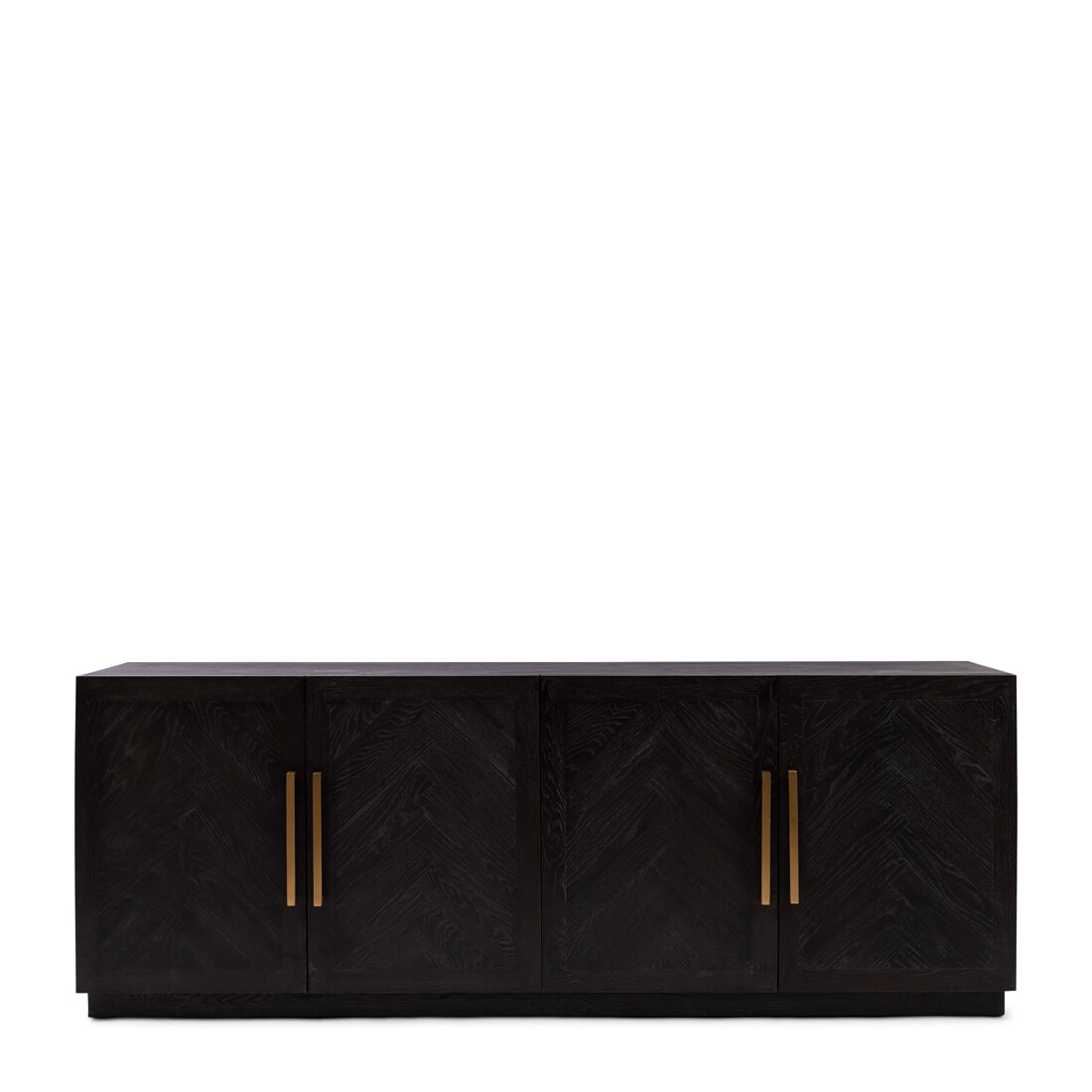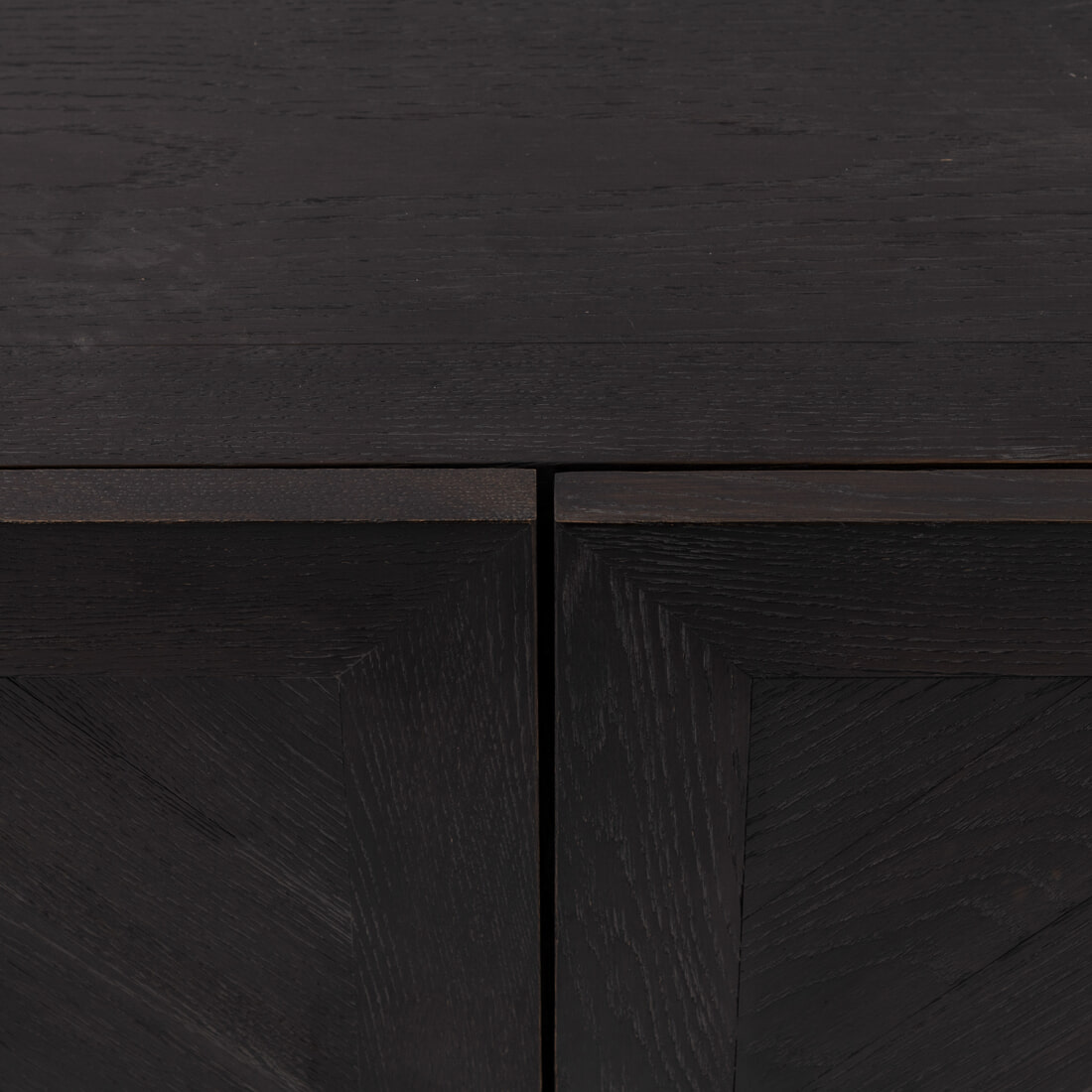 In de 5th Avenue-serie is dit een royaal dressoir van wel 2.30 meter breed. Het hout van deze blikvanger is in een visgraatpatroon gelegd en heeft een donkere coating gekregen, waar de houtnerf doorheen schemert. De vier deuren beschikken over een softclose-mechanisme.