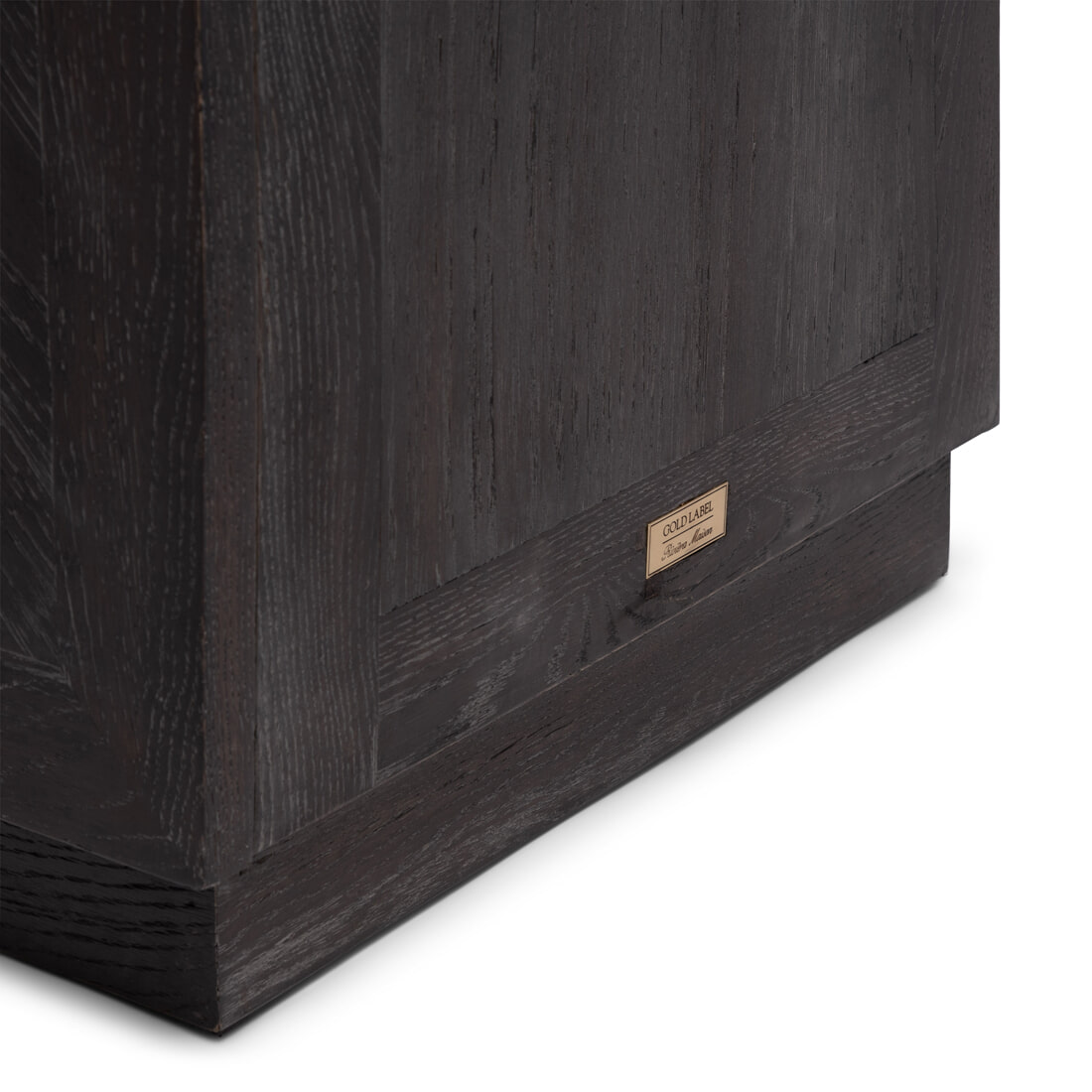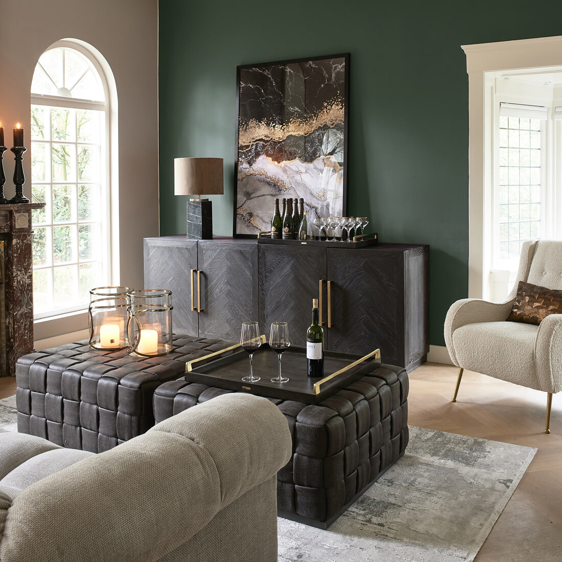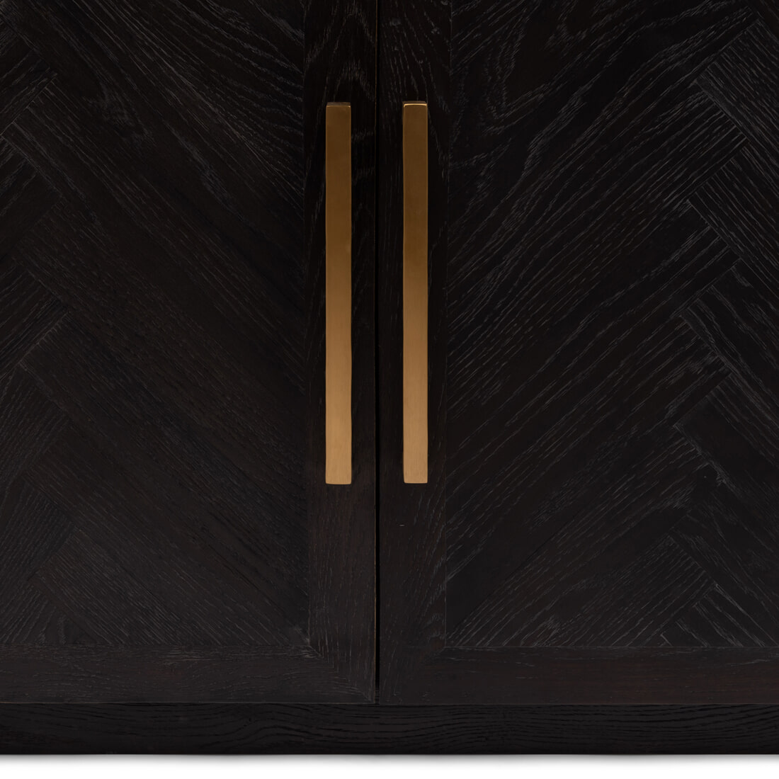 In de 5th Avenue-serie is dit een royaal dressoir van wel 2.30 meter breed. Het hout van deze blikvanger is in een visgraatpatroon gelegd en heeft een donkere coating gekregen, waar de houtnerf doorheen schemert. De vier deuren beschikken over een softclose-mechanisme.