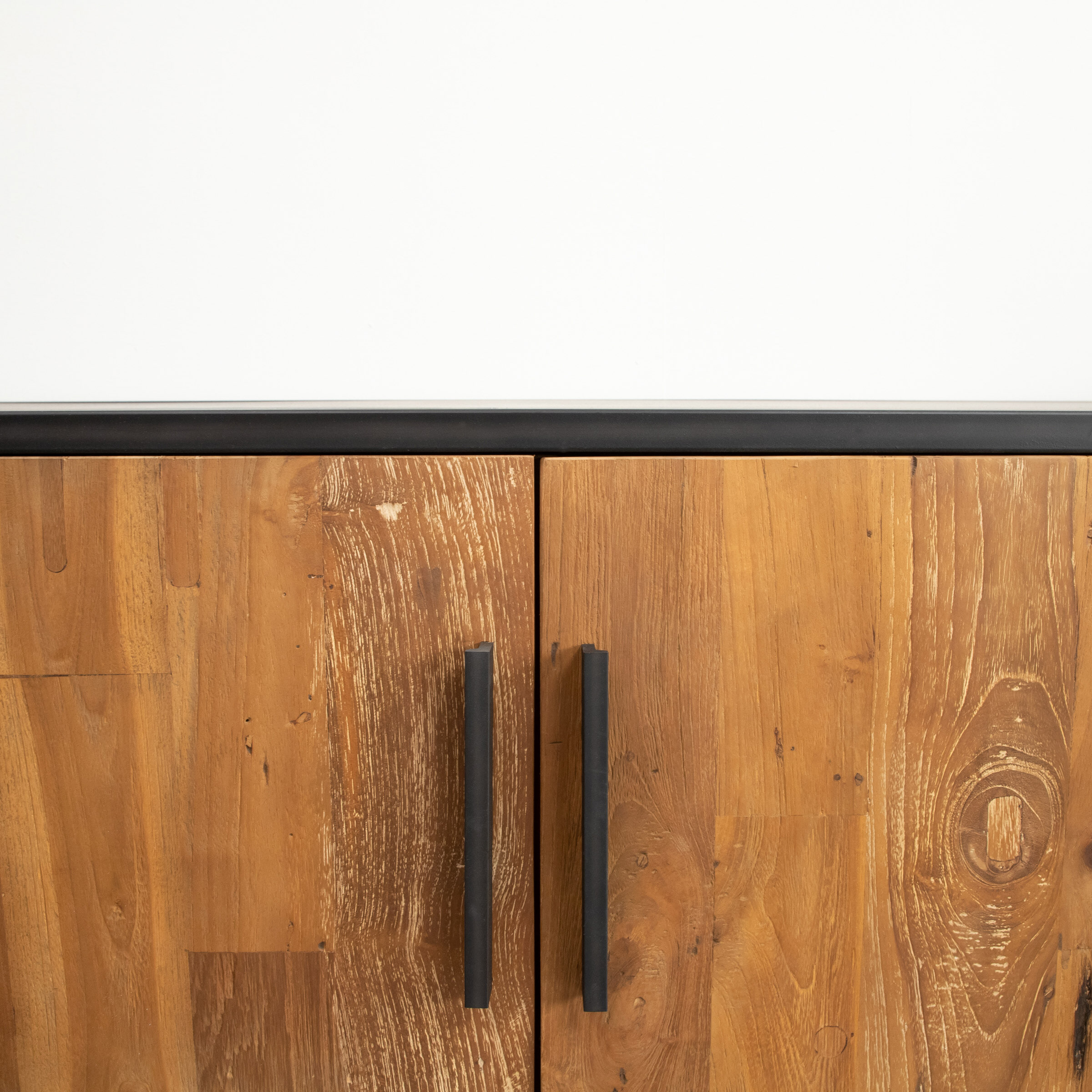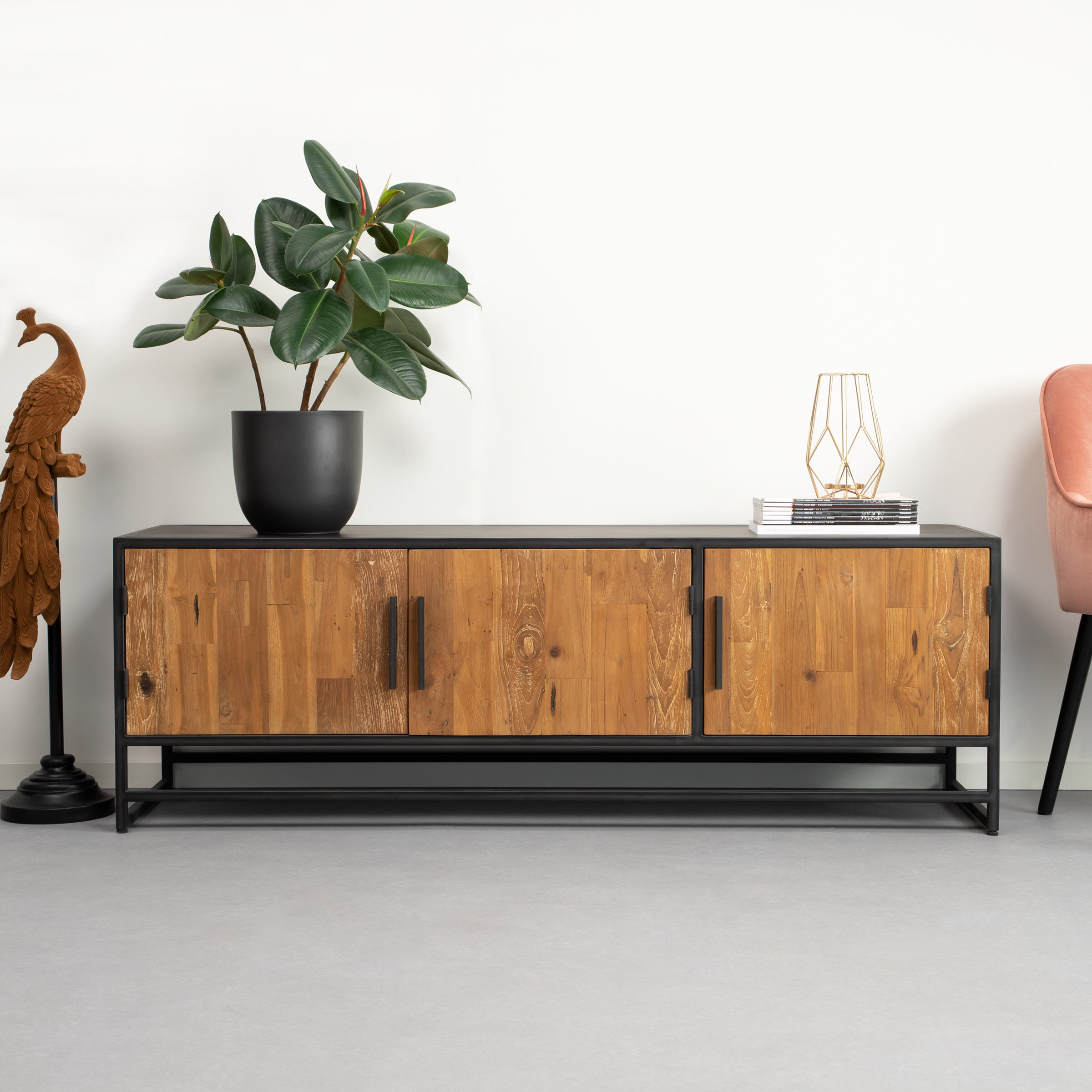 Houd jij van stoere items in je huis? Bekijk dan eens tv-meubel ‘Manilla’ dat bestaat uit staal en hout. Het gecoate staal heeft een vintage afwerking en wordt gecombineerd met massief gerecycled teakhout. Kies zelf uit twee verschillende varianten: eentje met 3 deuren en de ander met 4 deuren waar je van alles achter kunt opbergen.