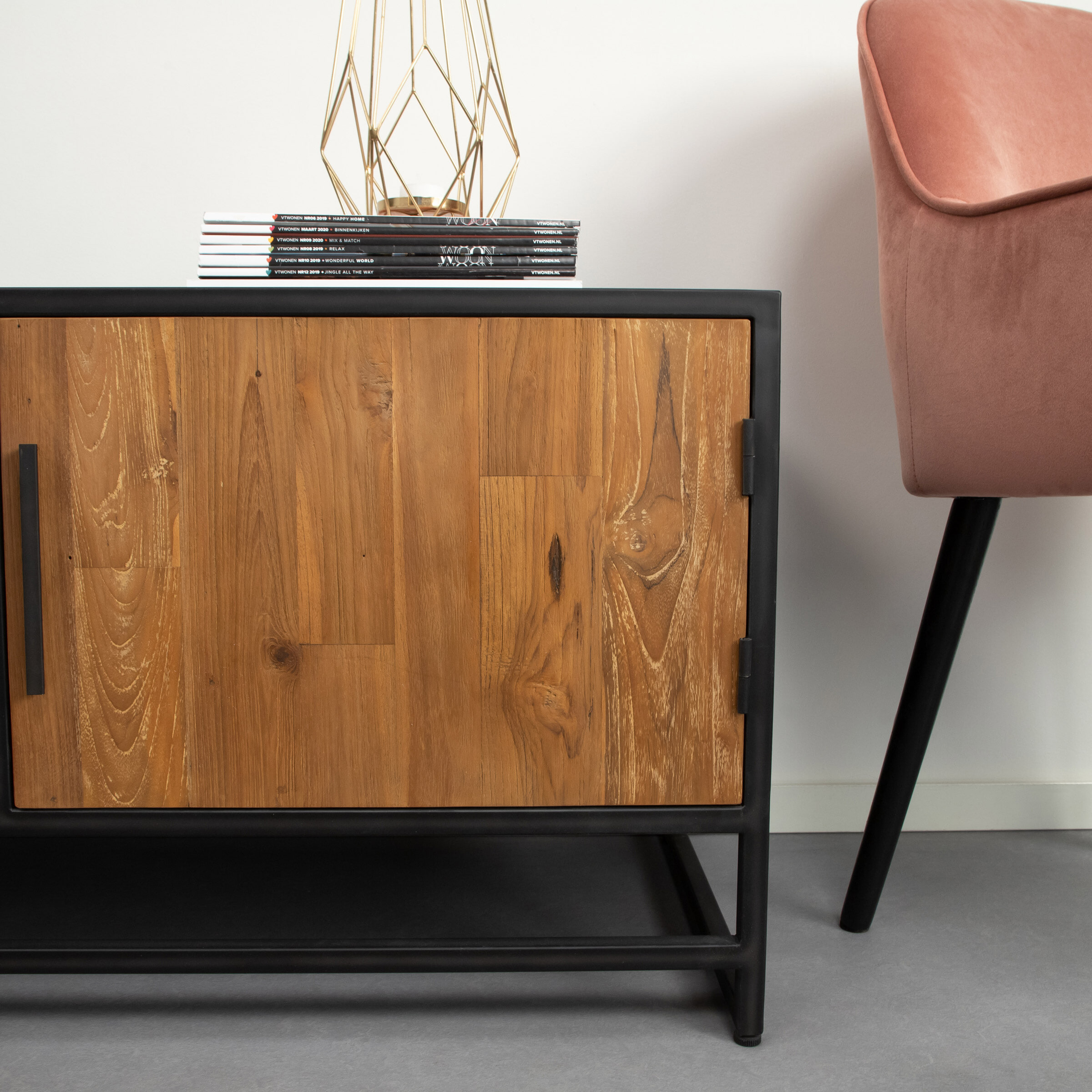 • Materiaal: Gecoat staal met vintage afwerking gecombineerd met massief gerecycled teakhout