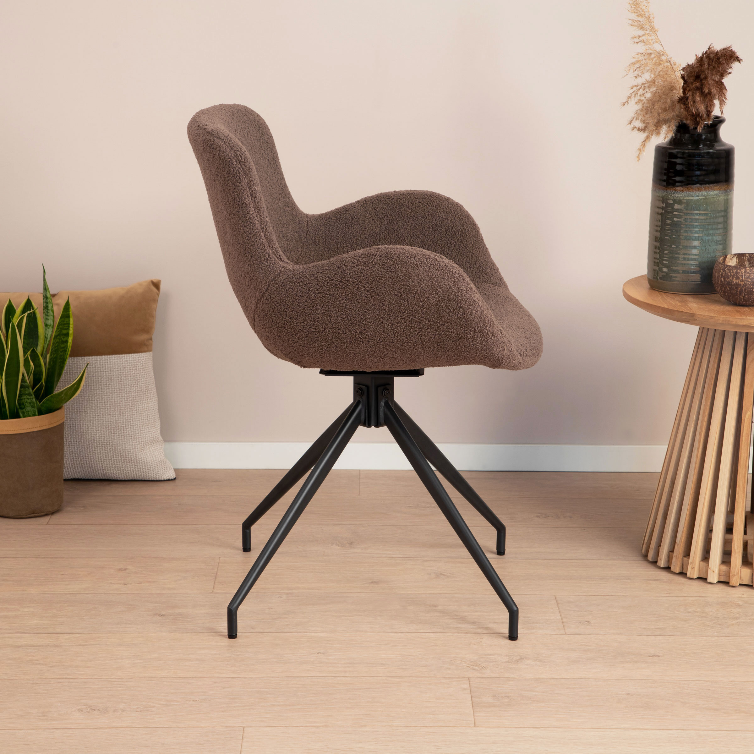 Het gepoedercoat metalen onderstel loopt uit in vier poten en zorgt ervoor dat je kunt draaien. Een draaibare poot onder je eetkamerstoel is erg handig, zeker als je niet veel ruimte hebt om naar achter te schuiven. De stoel staat prachtig aan een rechthoekige tafel, zodat de rechte hoeken doorbroken worden.