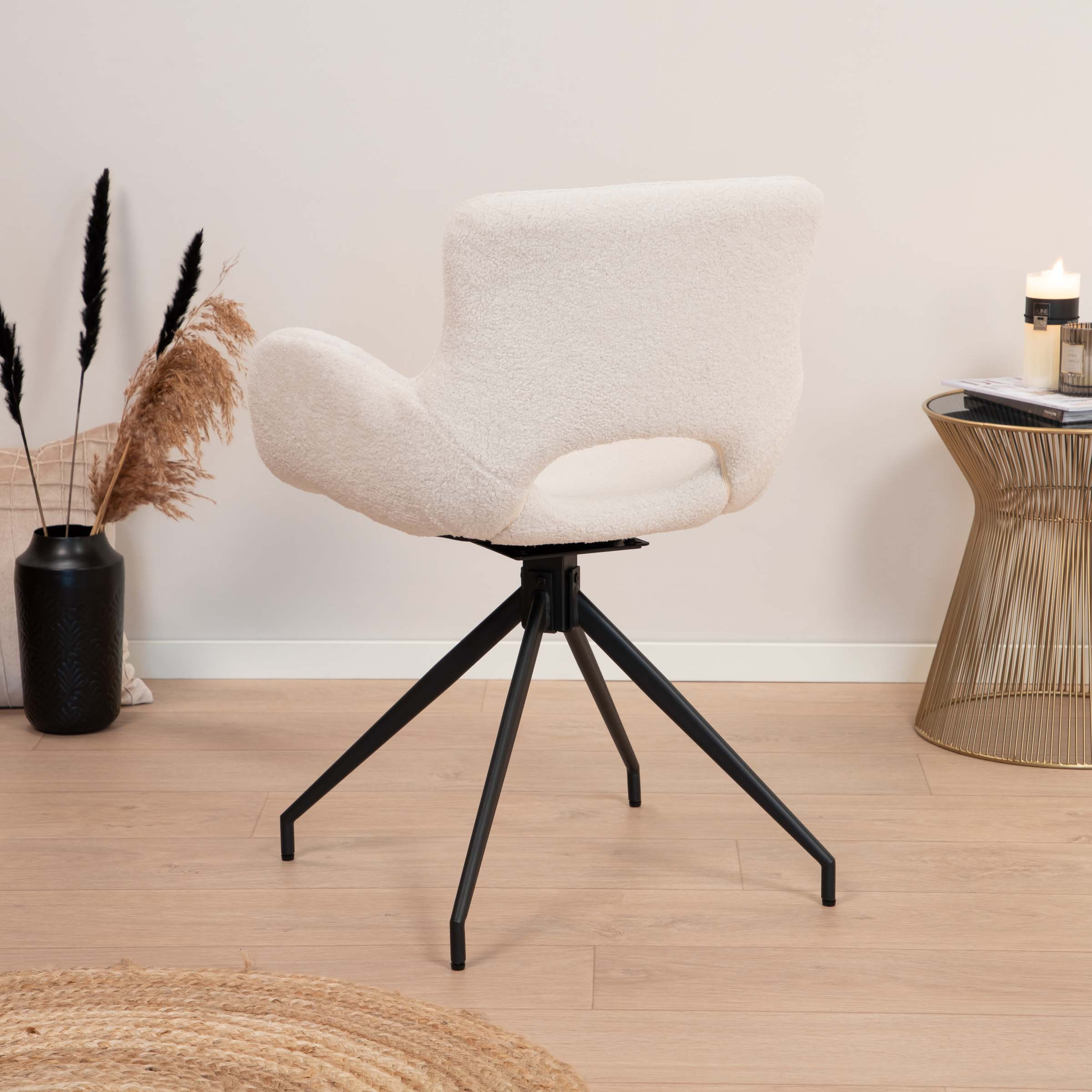 Het gepoedercoat metalen onderstel loopt uit in vier poten en zorgt ervoor dat je kunt draaien. Een draaibare poot onder je eetkamerstoel is erg handig, zeker als je niet veel ruimte hebt om naar achter te schuiven. De stoel staat prachtig aan een rechthoekige tafel, zodat de rechte hoeken doorbroken worden.