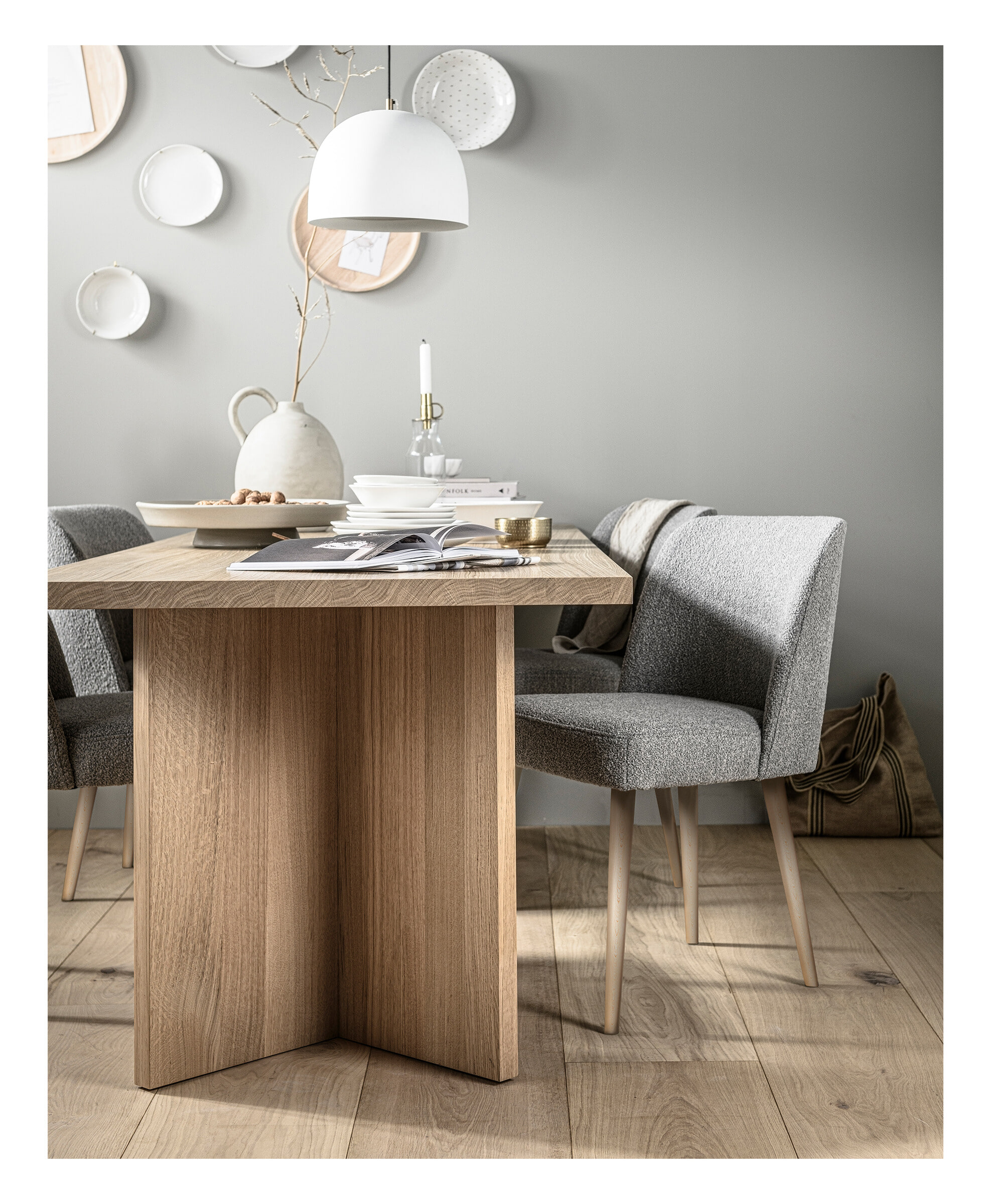 Het onderstel is gemaakt van naturel beukenhout, wat de eetkamerstoel een sfeervol uiterlijk geeft. Het zitgedeelte is gestoffeerd met onze rijke, zachte Amara bouclé stof. Onze rijke Amara bouclé heeft een wollige textuur die meteen warmte in huis brengt. De bouclé stof heeft een Martindale van 75.000, dat betekent dat de stof geschikt is voor intensief woongebruik. De dichte weeftechniek van deze combinatiestof (96% polyester / 4% polyacryl) zorgt voor de sterkte van de stof, dit maakt dat de Amara bouclé niet snel zal slijten of scheuren maar vergroot de kans op lussen. Ook heeft elke kleur een hoge kleurvastheid, maar het is aangeraden om direct zonlicht te vermijden om kleurnuances te voorkomen.