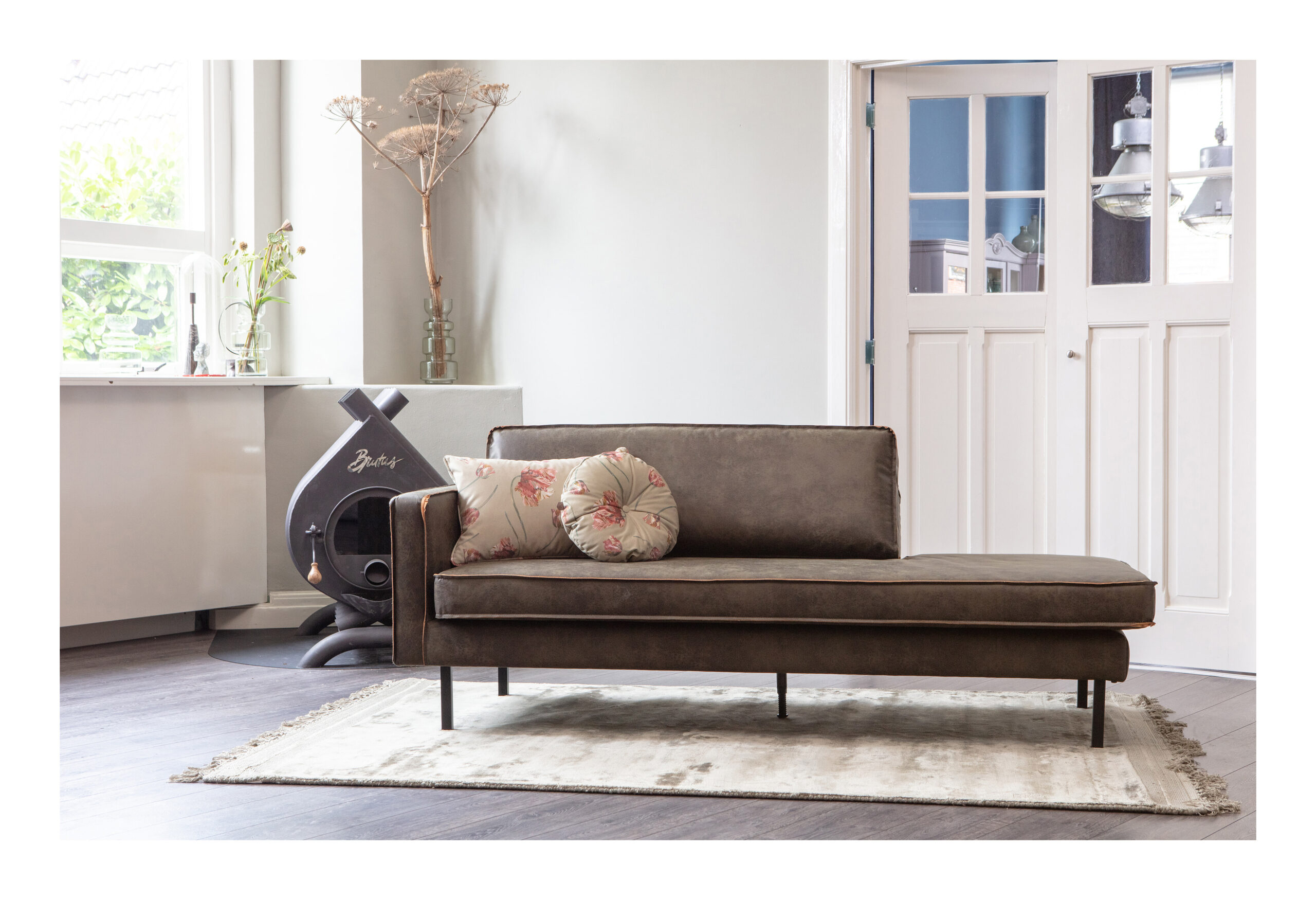 Het Rodeo daybed is opgebouwd uit een combinatie van massief hout, spaanplaat, polyurethaan schuim met een dichtheid van 25 kg/m3 en een zigzag vering. De zitting bevat een polyurethaan schuim met een dichtheid van 30 kg/m3 (T3037). De rugleuning bestaat uit een combinatie van 70% gesneden schuim en 30% siliconen. Deze Rodeo is bekleed met een lederlook. Onze Copa lederlook heeft een unieke uitstraling en is door het gebruik van leer restanten een duurzame keuze! De lederlook bestaat uit 70% vezels van rundleder, 30% polyester en heeft een Martindale van 30.000. Het materiaal is opgebouwd uit twee onderdelen: de onderlaag bestaat uit gerecyclede leervezels, wat zorgt voor de natuurlijke uitstraling. De bovenste laag is een polyester afdeklaag die het leer beschermt en oneffenheden voorkomt. Hierdoor wordt het een stevige combinatiestof. De microvezel is gebreid van zeer kleine, synthetische vezels. Deze productietechniek zorgt voor de stevigheid en een fijn, zacht gevoel. De stof is zeer kleurvast. Tijdens het gebruik zal het uiterlijk en de structuur van de stof zijn natuurlijke kenmerken meer laten zien, dit verandert niks aan de duurzaamheid en kwaliteit.