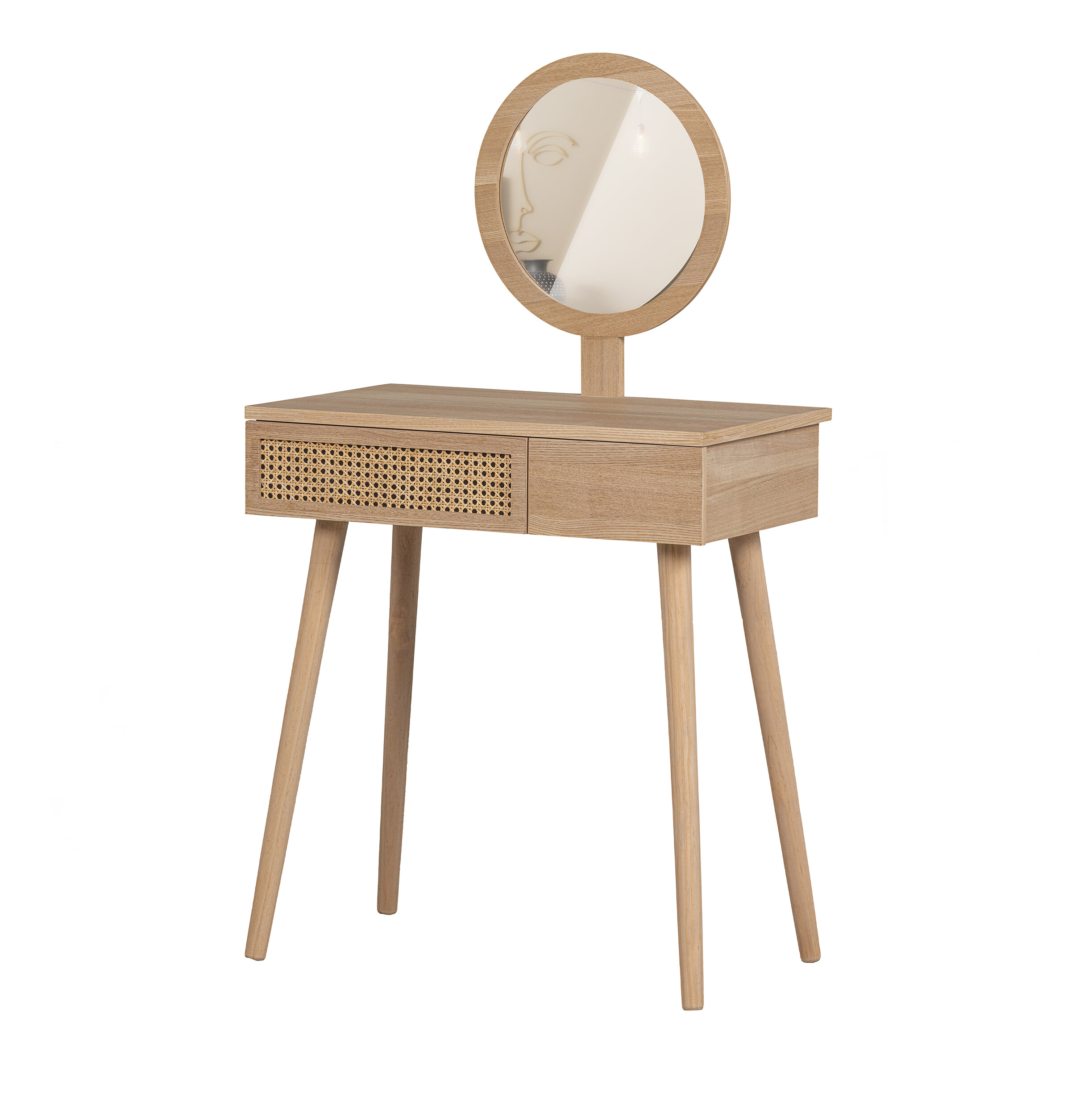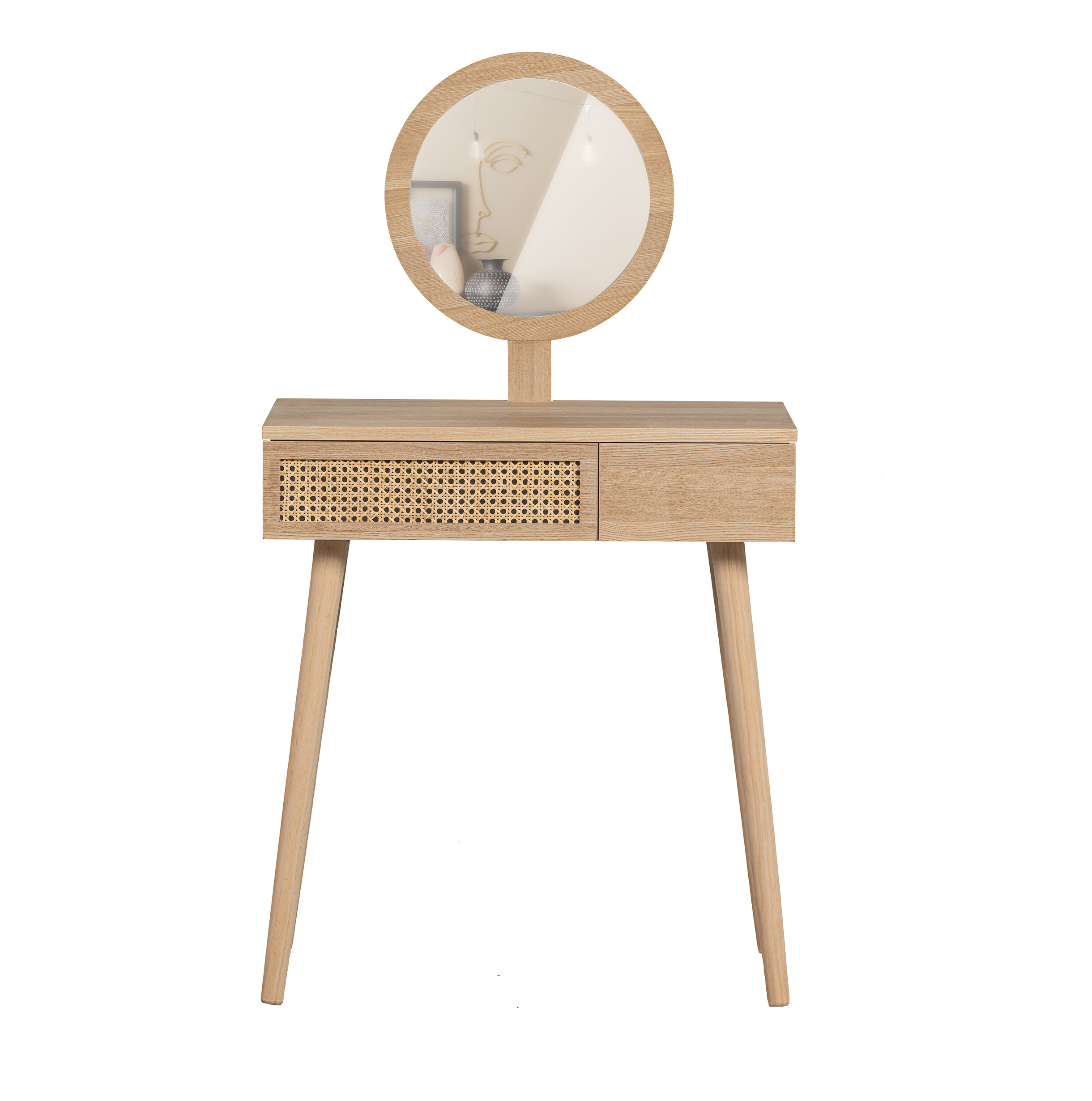 Kaptafel Soof van WOOOD is een charmant en veelzijdig meubel dat ook perfect is als sidetable. Gemaakt van een combinatie van grenenhout en MDF straalt Soof warmte en lichtheid uit. De lade is voorzien van een stijlvol rotan detail, wat zorgt voor een natuurlijke, speelse touch. De ronde spiegel boven het blad maakt het meubel ideaal als kaptafel voor in de slaapkamer of hal.