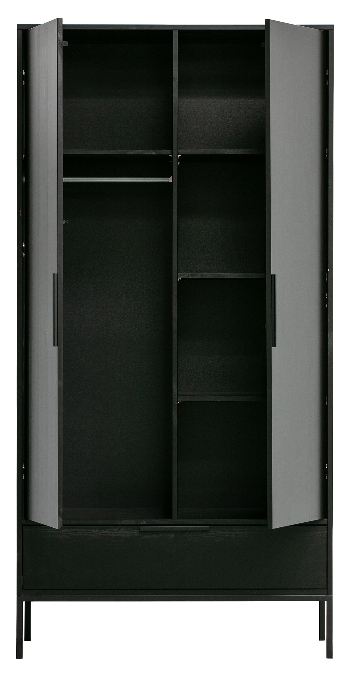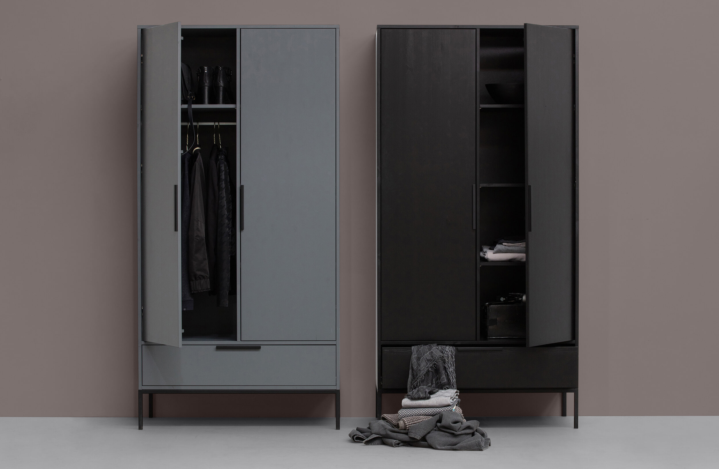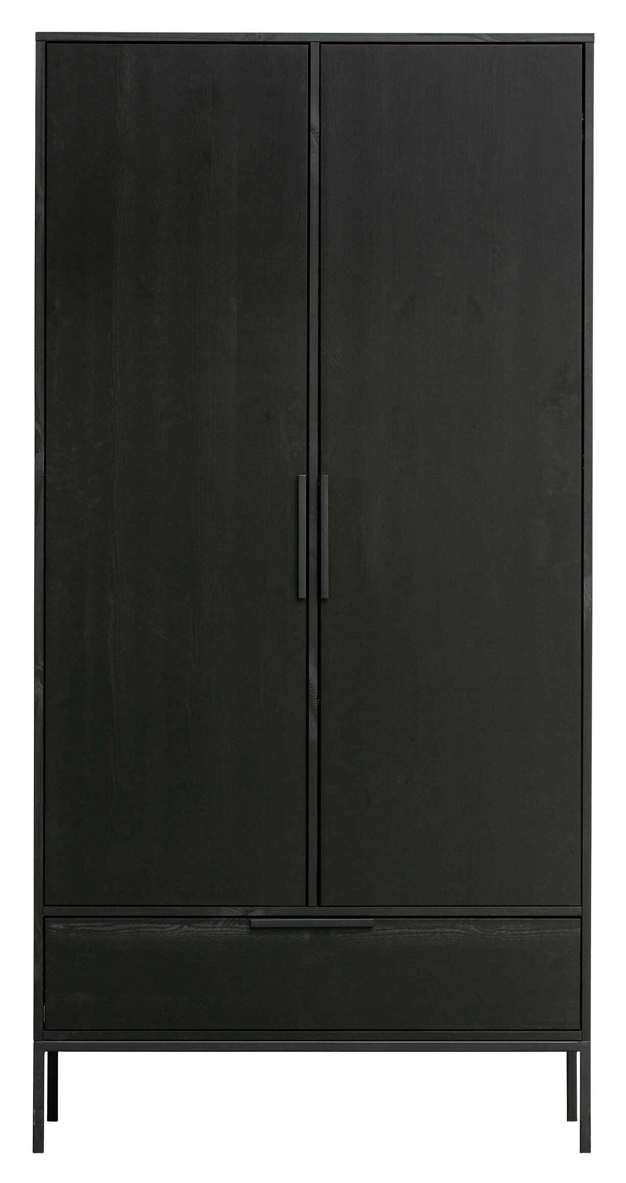 De tweedeurs kast Adam is een Nederlands fabricaat uit de collectie van WOOOD. De kast is gemaakt van massief geschuurd grenenhout wat een robuuste look geeft. Het interieur van de kast is in dezelfde kleur als de kast gespoten en bestaat uit links: een hanggedeelte met een roede en een legplank, en rechts: 3 legplanken. De legplanken zijn gemaakt van spaanplaat. Onder deze deuren zit een brede treklade. Zowel de handvaten van de deuren en de lade evenals de poten zijn stijlvol afgewerkt met een mat zwarte poedercoating.